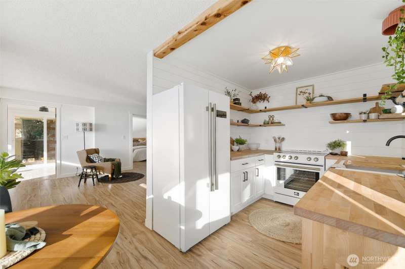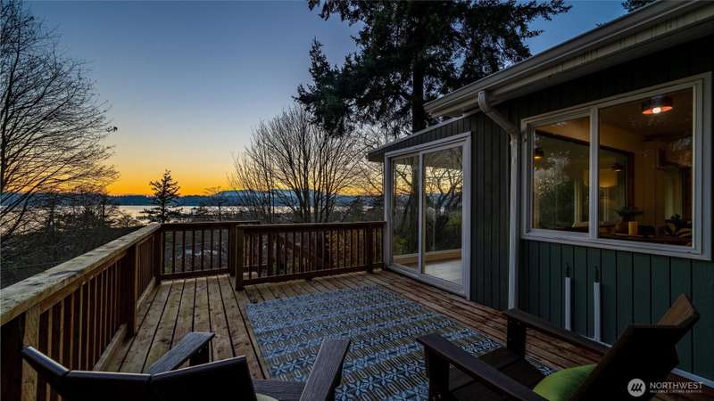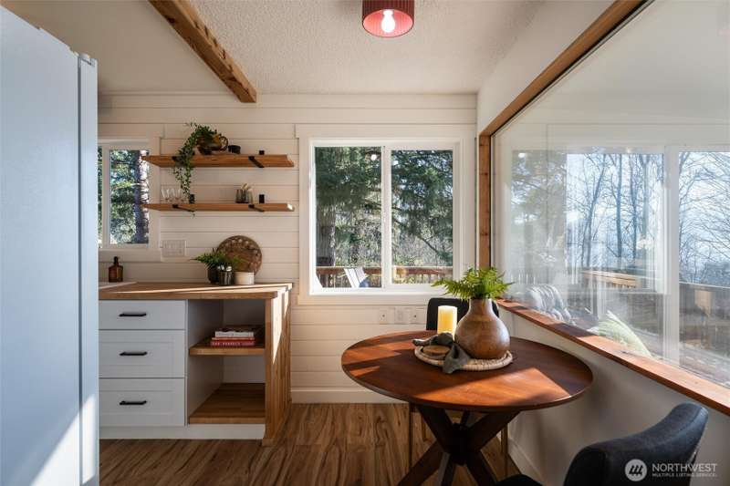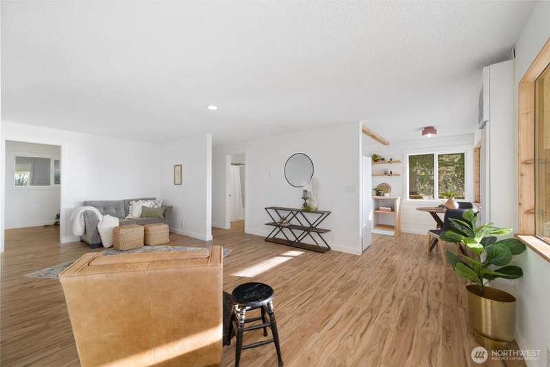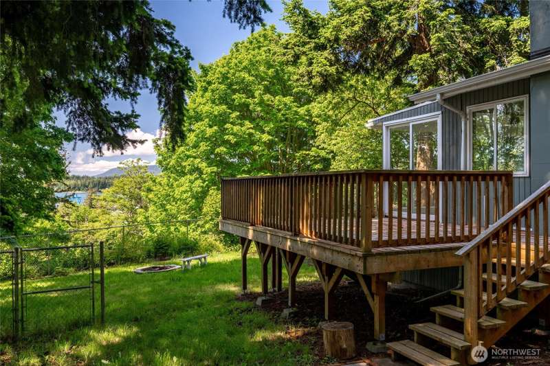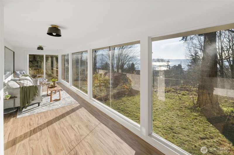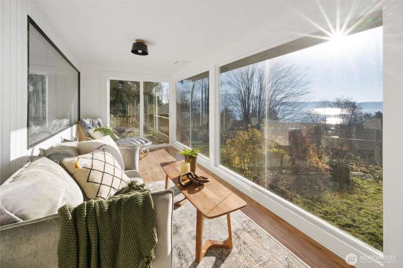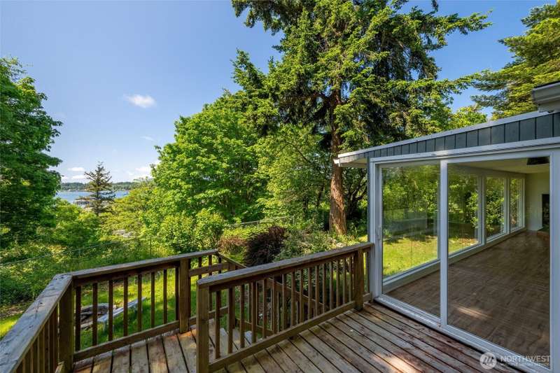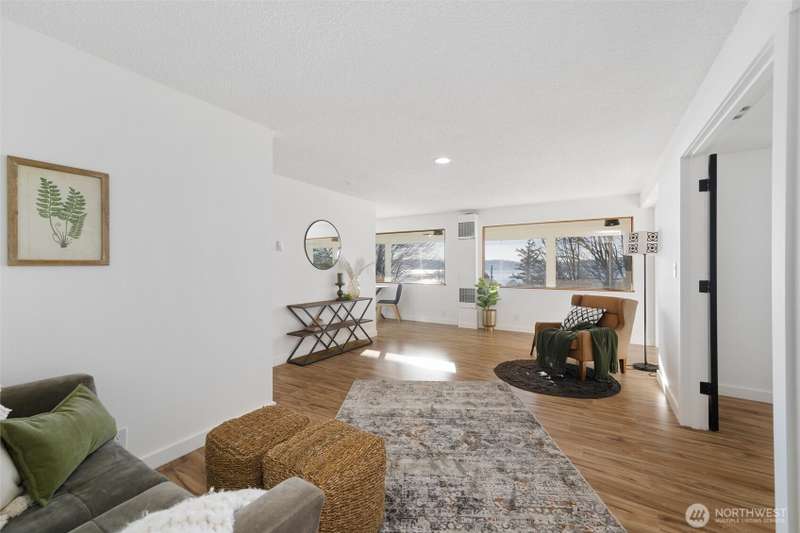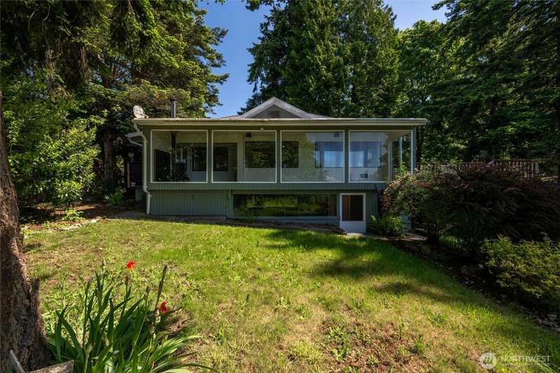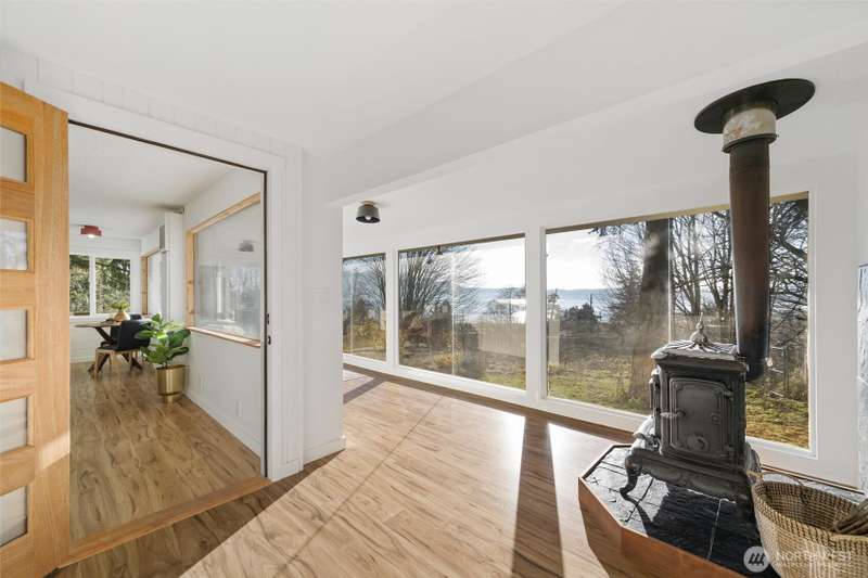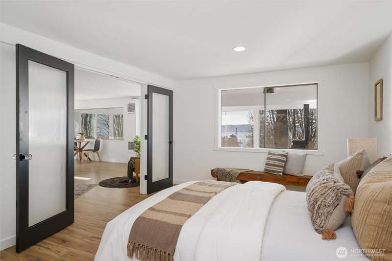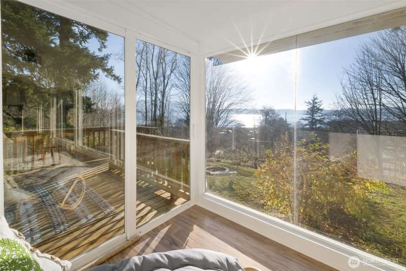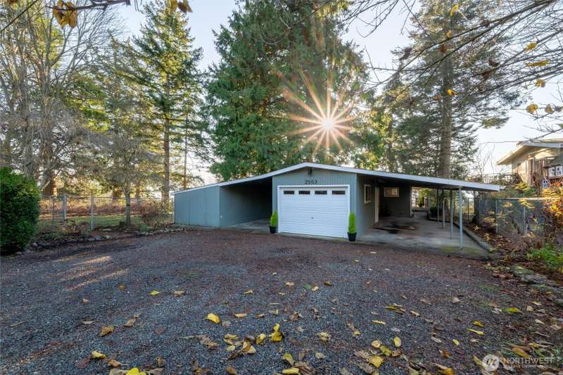 Welcome to Gooseberry Pt on deeded land that is NOT leased. Bring your kayak or SUP. Complete interior renovation with all new floors, paint, kitchen, bath, fixtures, and appliances! Enjoy the wide southwesterly water view from most of the main level, and soak in the sun from the sunroom with walls of windows. Views, space and more on this great double lot with extra parking, detached garage, two carports, and shop space. Even room for an RV! Flexible layout with a large primary bedroom guarded by French doors, so much to love in your next home! Potential for a separate living space with its own entrance. Don’t miss the chance for a like-new home with many possibilities - 20 min scenic drive to Bellingham!