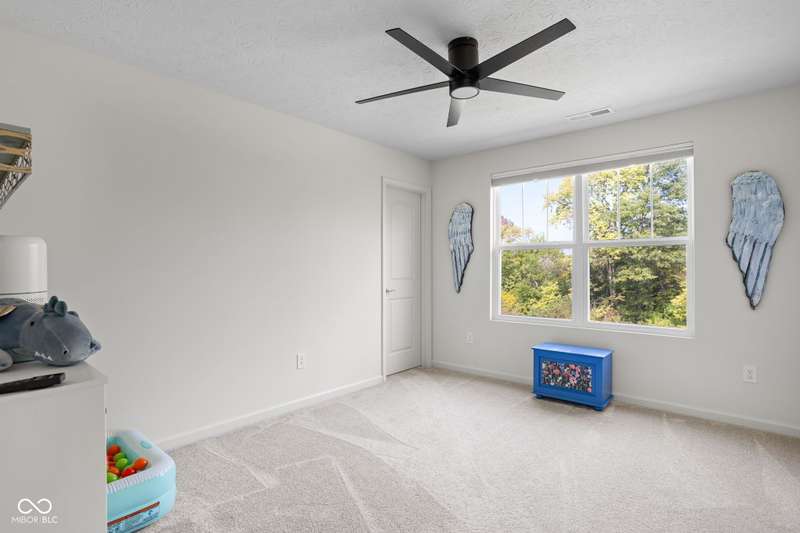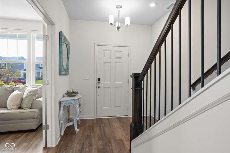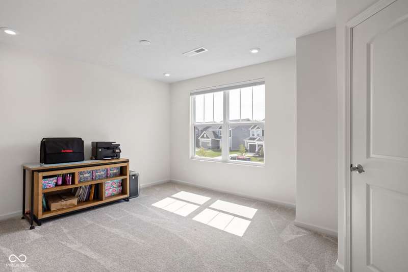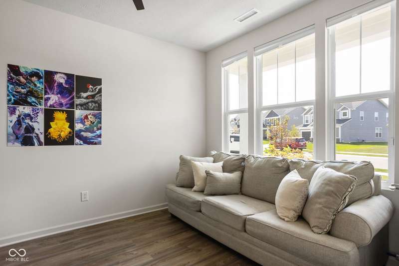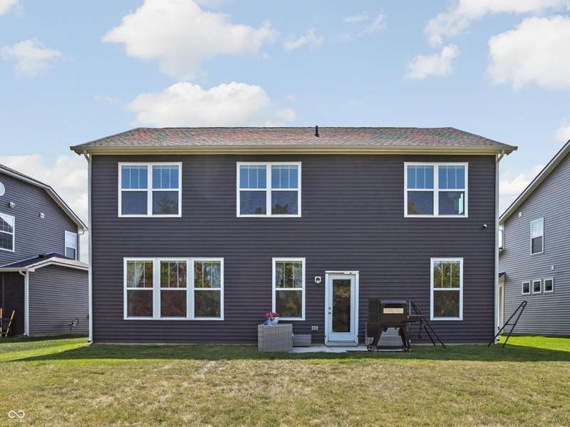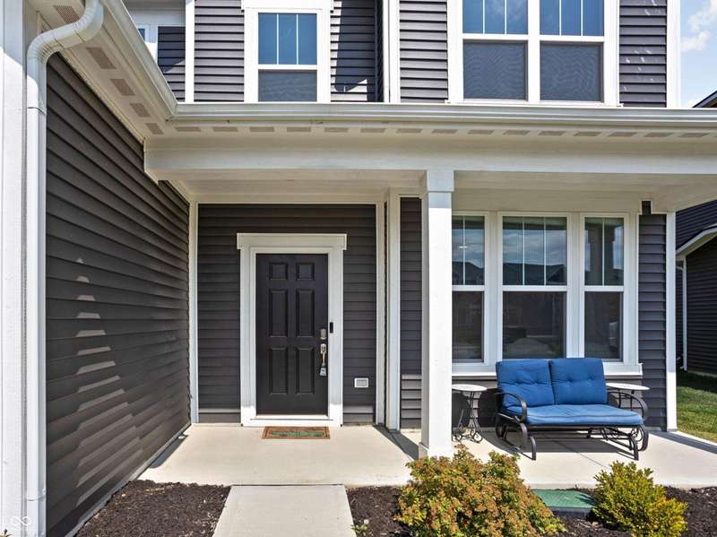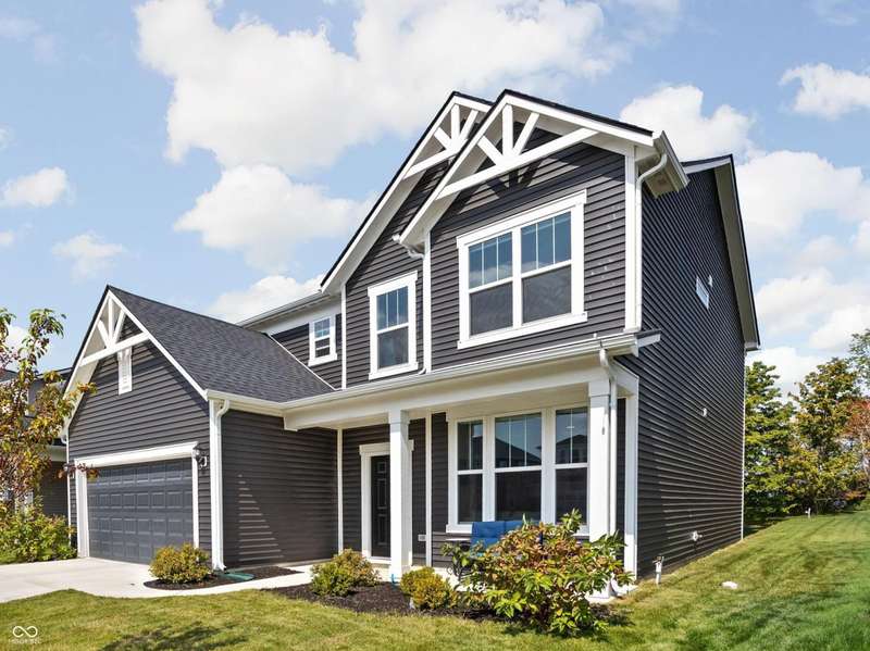 Welcome to this beautifully crafted 2024 Pulte home in Whitestown's sought-after Bridle Oaks community. With 4 bedrooms, 2.5 baths, and 9' ceilings on the main floor, this home was designed for both comfort and style. The open-concept main level is the heart of the home, featuring a bright kitchen with quartz countertops, stainless steel appliances, a walk-in pantry, and a spacious center island that flows seamlessly into the dining and living areas-perfect for gatherings and everyday living. Just off the kitchen, you'll find a versatile flex space ideal for a small office, homework area, or creative nook. A separate den with French doors provides additional privacy for a home office, library, or playroom. Durable LVP flooring runs throughout the main floor, offering both elegance and easy maintenance. Upstairs, retreat to the expansive primary suite with a large walk-in closet, dual raised vanities, and a walk-in shower. Three additional bedrooms-all with their own walk-in closets-ensure plenty of room and storage for family or guests. Step outside to enjoy a large backyard with an open patio, backing to a wooded tree line and the scenic Big 4 Trail, perfect for biking, walking, or simply relaxing in nature. A covered front porch adds curb appeal and a welcoming space to unwind. Bridle Oaks offers a prime location near the Whitestown Library, LA Cafe, and Moontown Brewing, with shopping and dining just minutes away. Combining thoughtful design, quality finishes, and a neighborhood that connects you to both convenience and the outdoors, this home truly has it all.