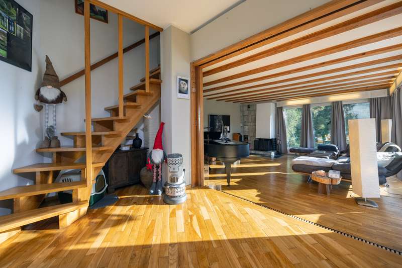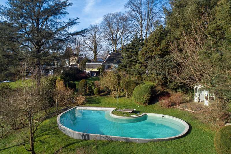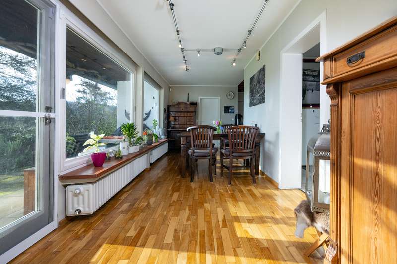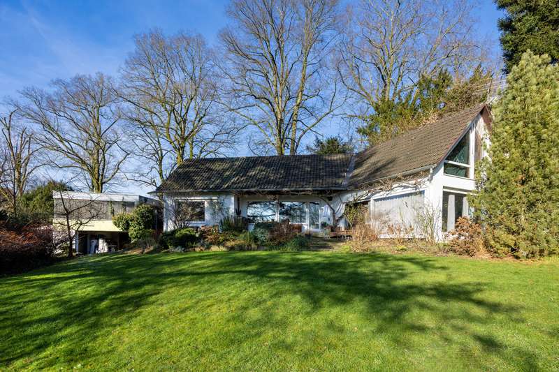 With a living space of approx. 146 m² and a large plot of approx. 1,500 m², this detached house, completed in 1964, offers an ideal retreat for nature lovers and people who appreciate living in a peaceful environment. The property is located on Boltenberg, right on the edge of the forest. On the first floor, you will find a modern, open-plan living concept on one level with several sub-areas. An open-plan eat-in kitchen leads to a dining area with a view of the garden. Behind this is a lower level with a light-flooded large living area and fireplace. The large panoramic windows offer a picturesque view of the greenery and create a bright and inviting atmosphere. From the living room and dining area, you have direct access to the garden terrace, which is ideal for sociable evenings or relaxing hours. The private rooms with a master bedroom and bathroom en suite are located in the rear "wing". Living on one level is well thought out here. The top floor houses another bedroom with a very large gable window. There is also potential to create more space here - e.g. by installing a dormer window or another well-thought-out extension. A granny apartment with its own entrance would also be conceivable here. The building has a partial basement, which offers additional storage space. A separate outbuilding is also available and is currently used as a workshop - ideal for craft activities or as additional usable space. A carport offers space for two cars. The house is heated by central heating. The property is partially in need of renovation. However, it offers a solid basis for various modernization and design measures to make your own dream home a reality. The spacious plot is a real highlight. The open spaces offer an unobstructed panorama and invite a variety of uses. A pavilion was built at the lower end of the plot, offering a sheltered retreat for relaxing hours in the sun or sociable evenings. Right next to it is a large pool with a capacity of approx. 100,000 liters, which conveys a Mediterranean flair and makes the property special. The location on the edge of the forest guarantees undisturbed living with a high quality of life. The natural surroundings ensure a peaceful living atmosphere and at the same time offer numerous leisure opportunities in the countryside. At the same time, the property is well connected and thus offers both a retreat and access to the amenities of daily life. Overall, this is a detached house with a spacious plot and potential for individual design. You are welcome to arrange a viewing appointment to see the property for yourself. Further details are available on request.