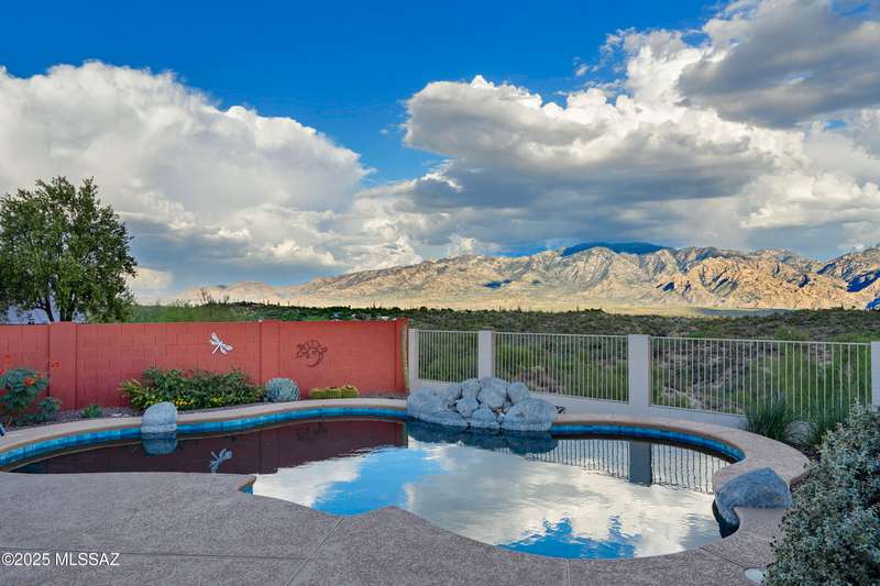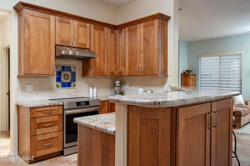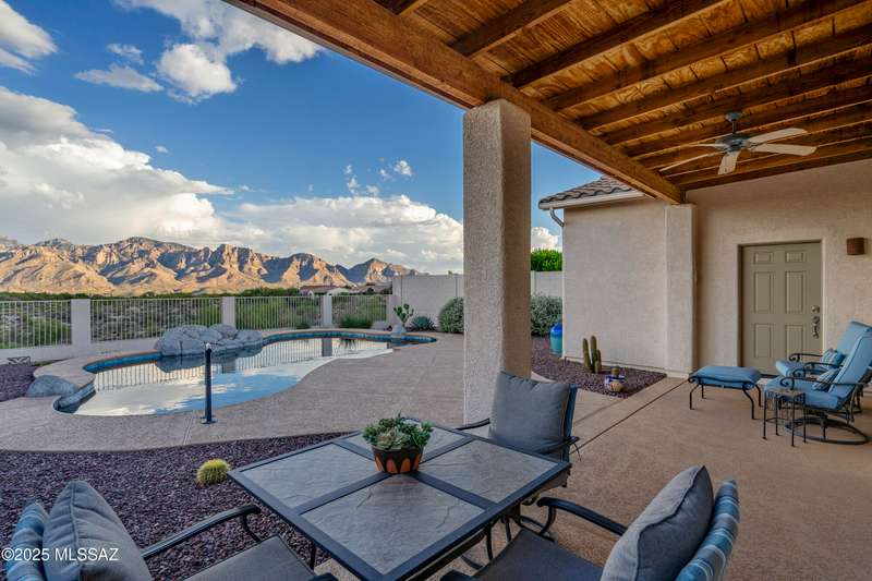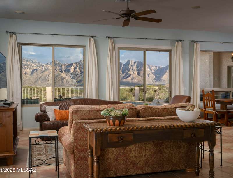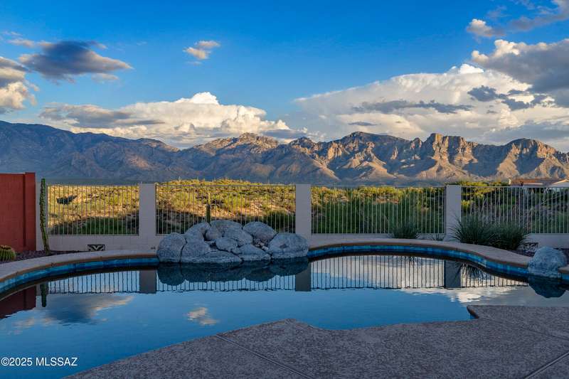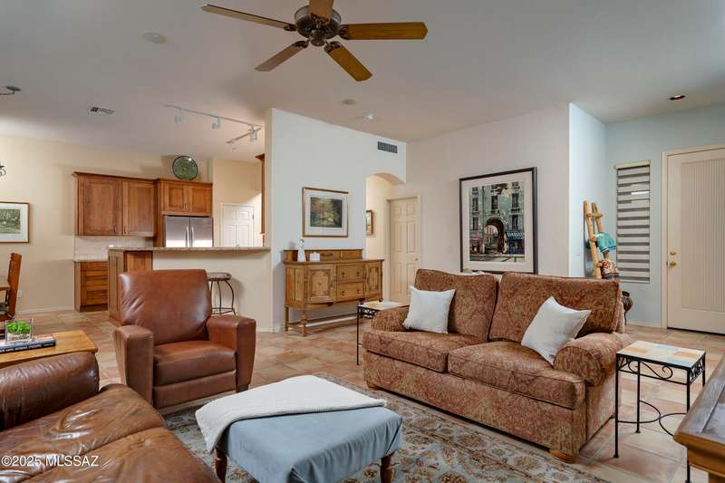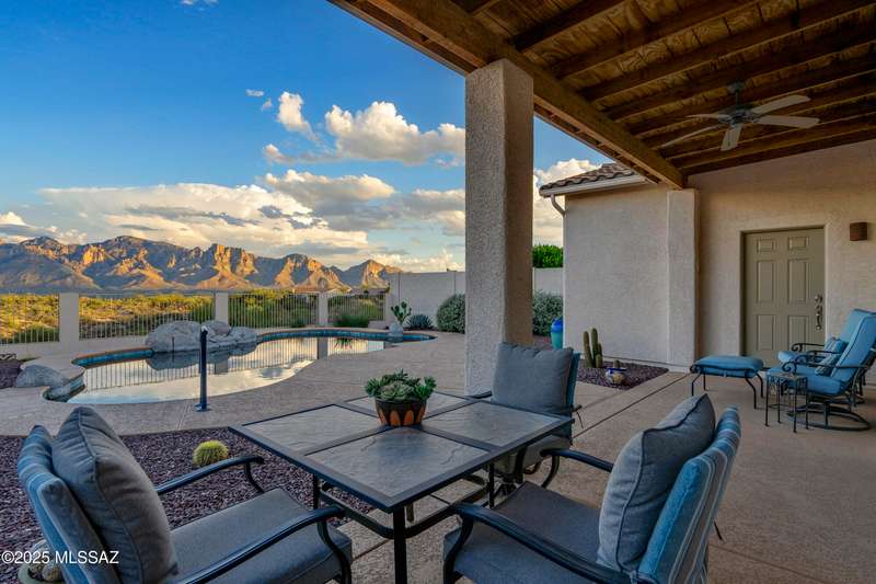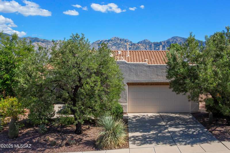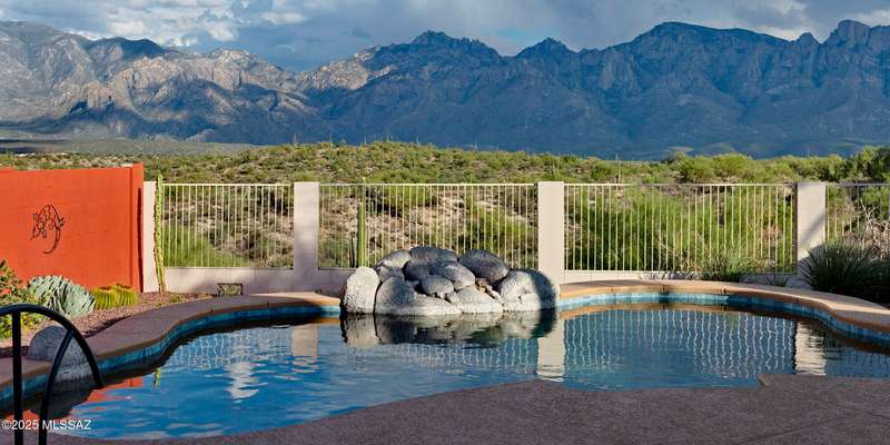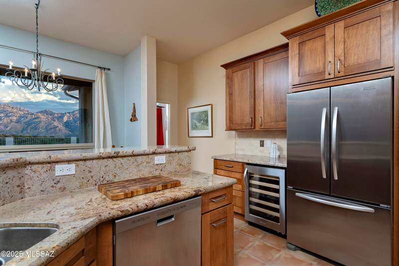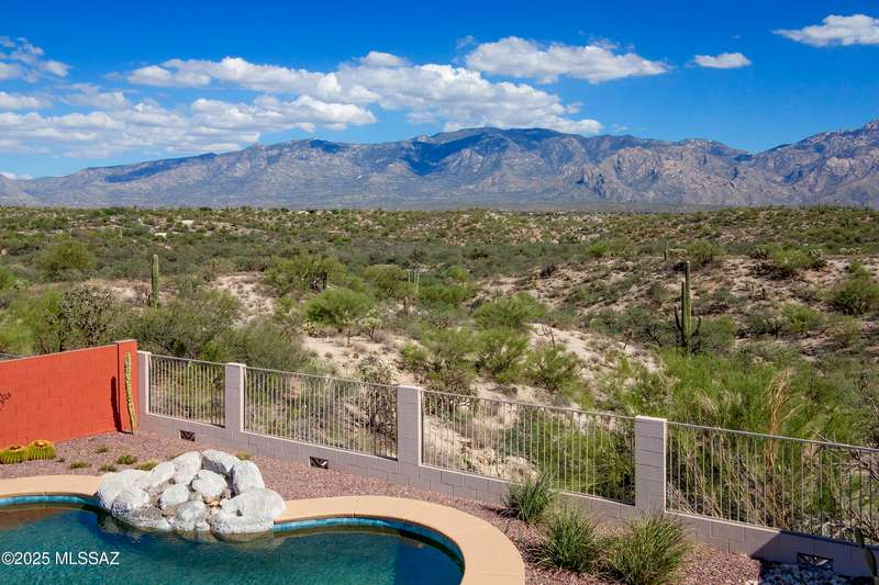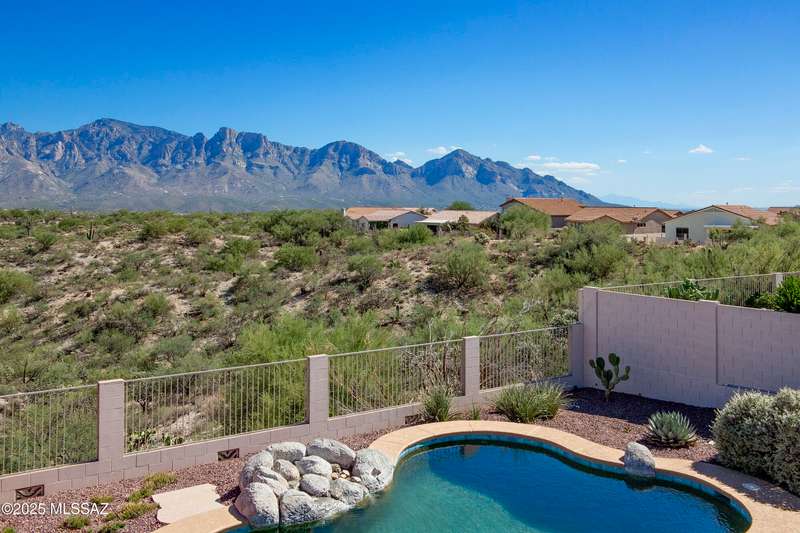 Incredible premium lot in gated Rancho Vistoso with nothing behind your view fence but rolling hills of lush Sonoran Desert! There are simply stunning, unobstructed Catalina Mountain views from the main living areas, kitchen, primary suite and rear outdoor space. This beautifully updated 1,664 square foot home offers two bedrooms, two bathrooms and a versatile den. The open living and dining spaces connect seamlessly to the kitchen and feature a wall of oversize windows to maximize the stellar views. The remodeled kitchen is a showstopper, featuring upgraded cabinetry, granite counters, stainless steel appliances--including a French door refrigerator, slide-in induction stove, and beverage fridge--and an elegant backsplash highlighted by a Talavera tile medallion. The primary suite