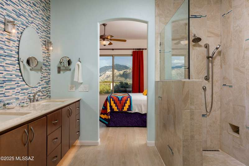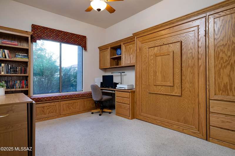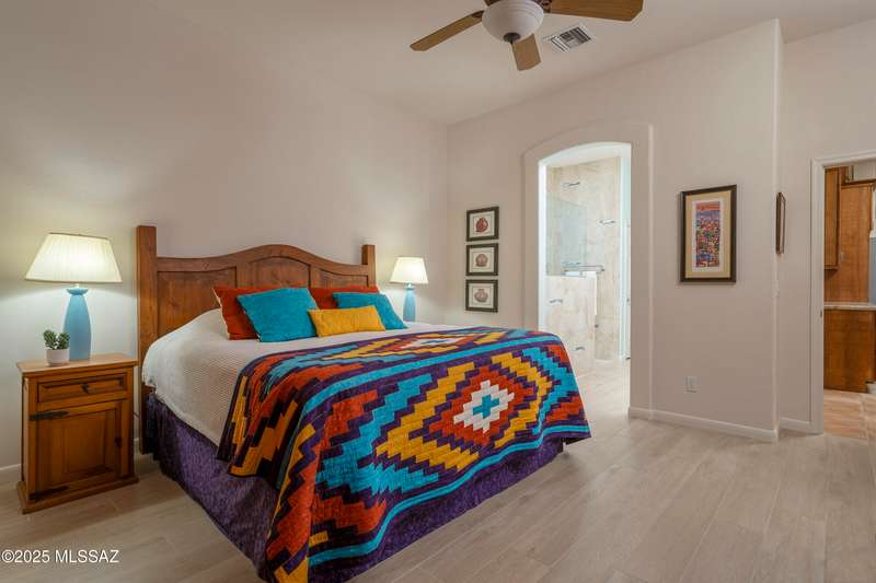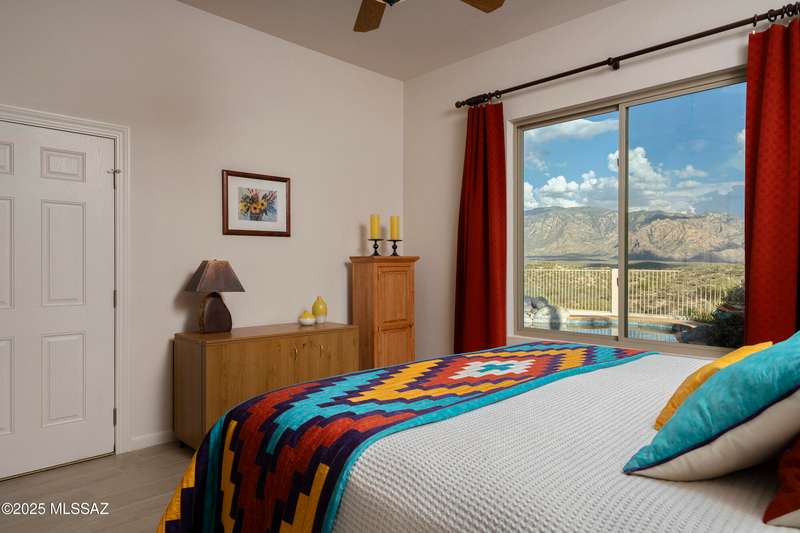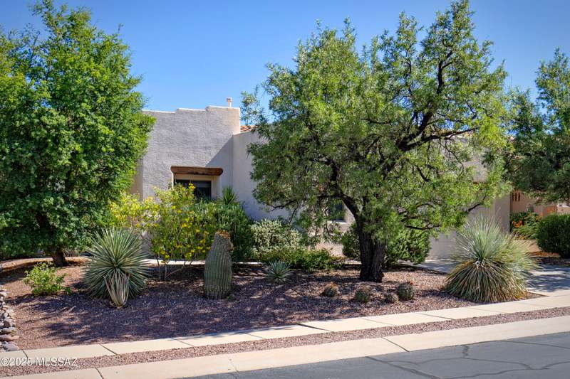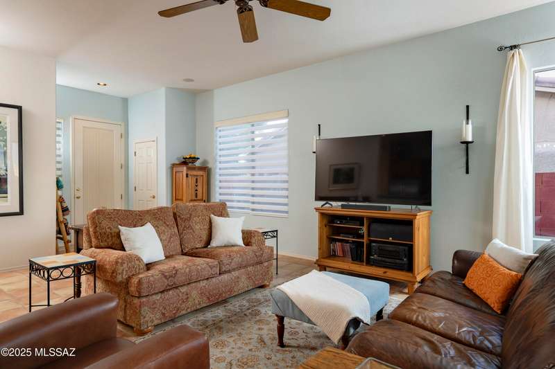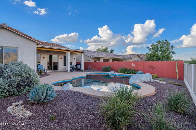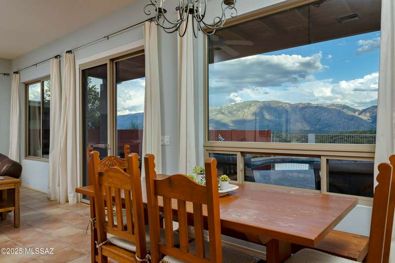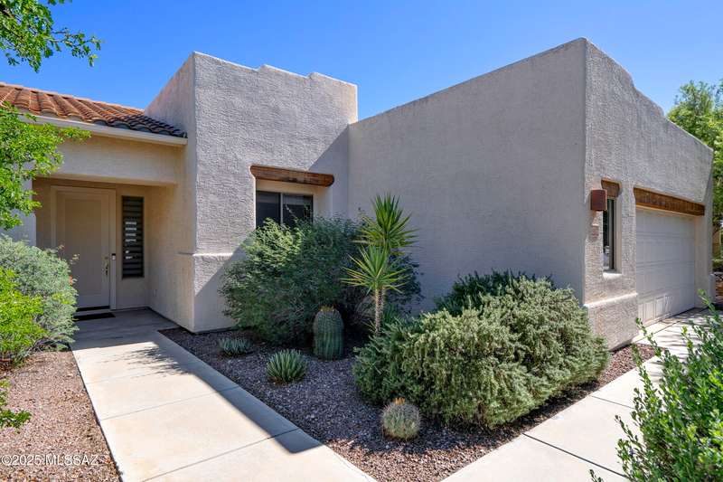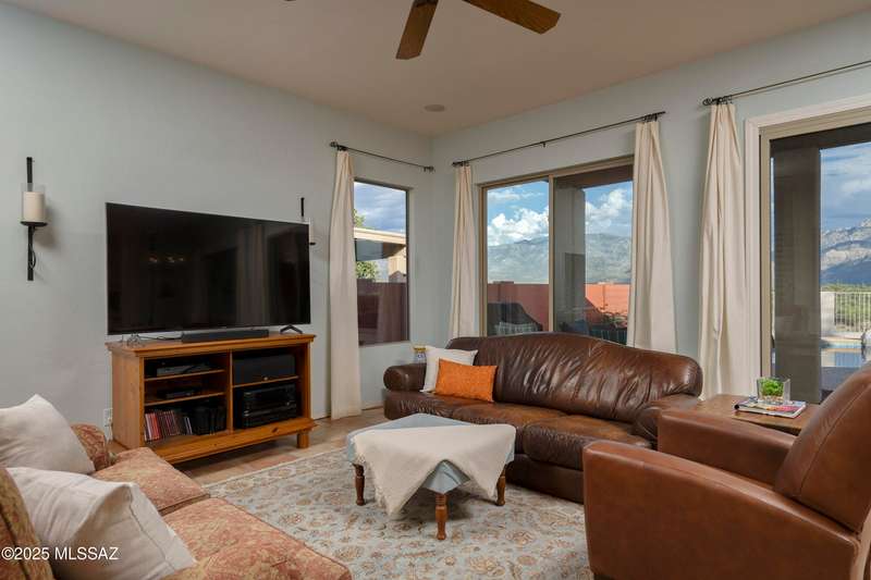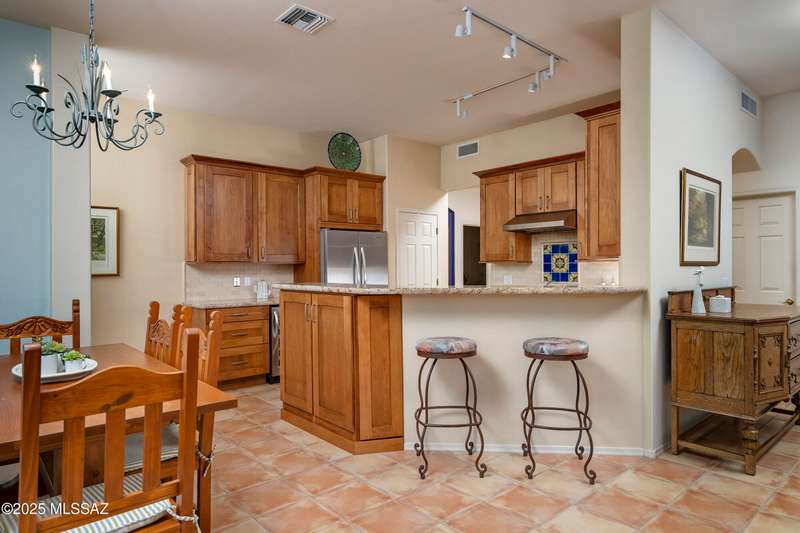 Incredible premium lot in gated Rancho Vistoso with nothing behind your view fence but rolling hills of lush Sonoran Desert! There are simply stunning, unobstructed Catalina Mountain views from the main living areas, kitchen, primary suite and rear outdoor space. This beautifully updated 1,664 square foot home offers two bedrooms, two bathrooms and a versatile den. The open living and dining spaces connect seamlessly to the kitchen and feature a wall of oversize windows to maximize the stellar views. The remodeled kitchen is a showstopper, featuring upgraded cabinetry, granite counters, stainless steel appliances--including a French door refrigerator, slide-in induction stove, and beverage fridge--and an elegant backsplash highlighted by a Talavera tile medallion. The primary suite