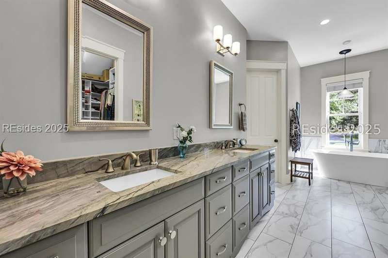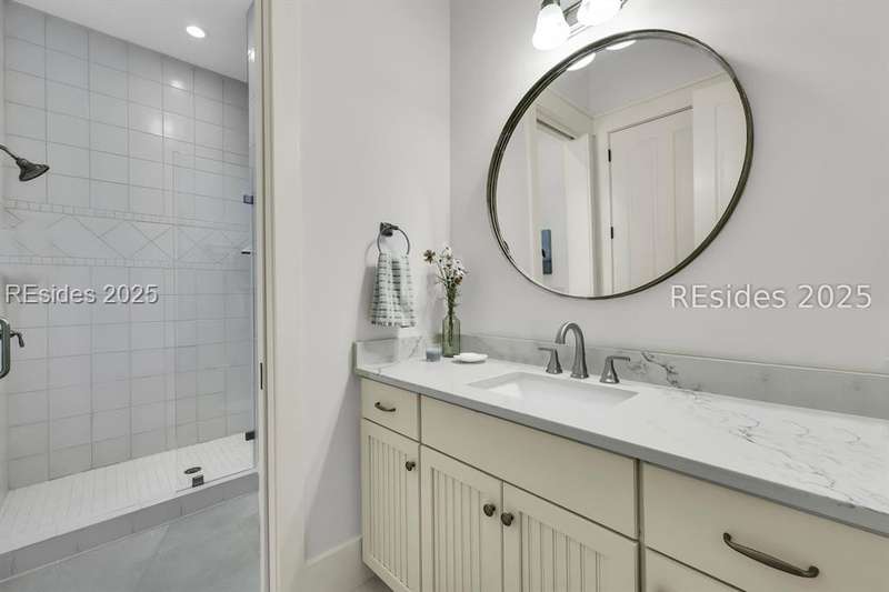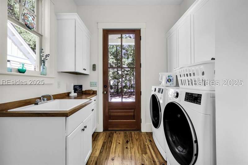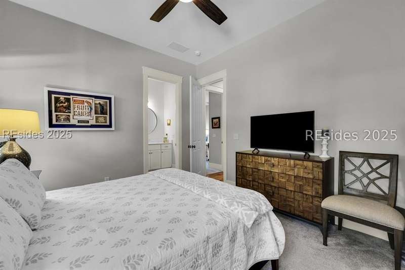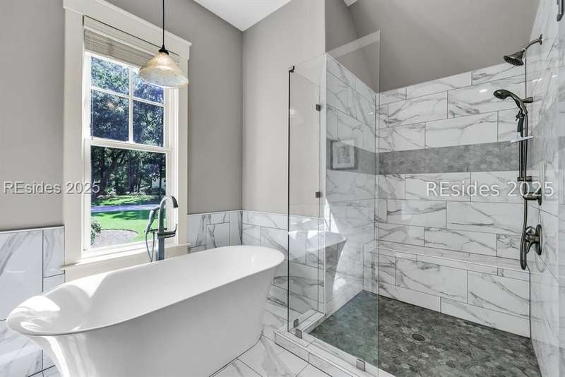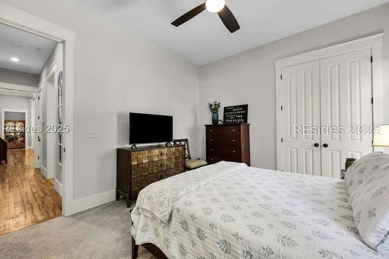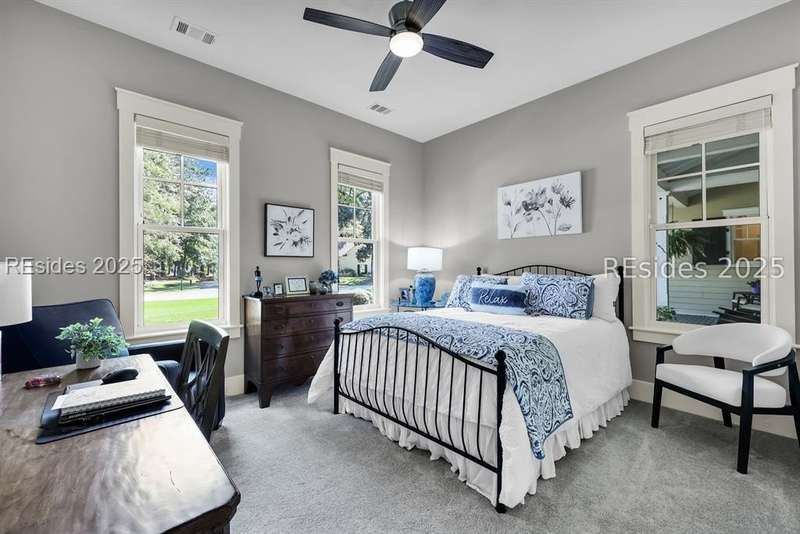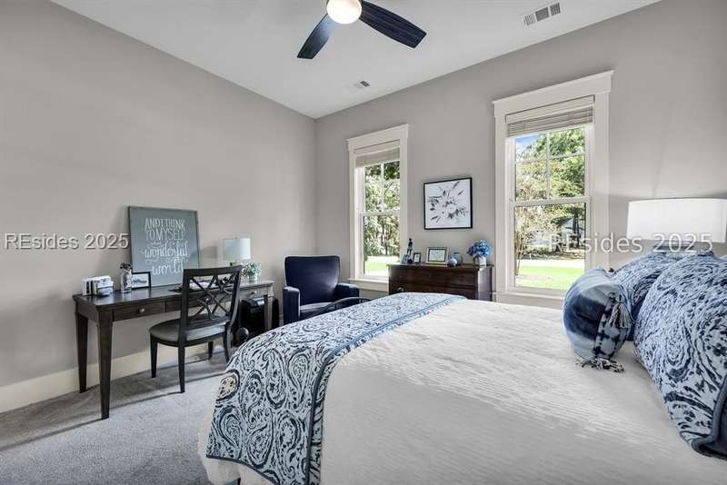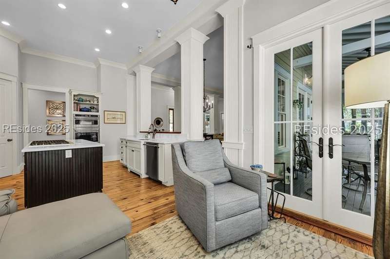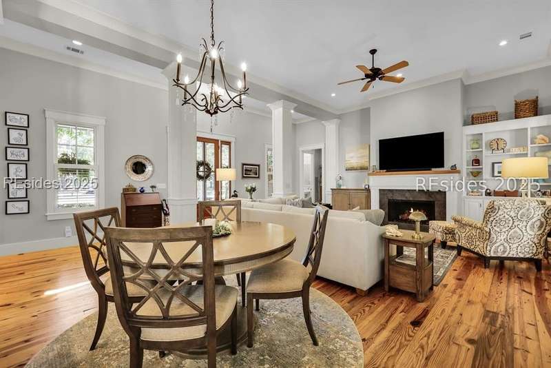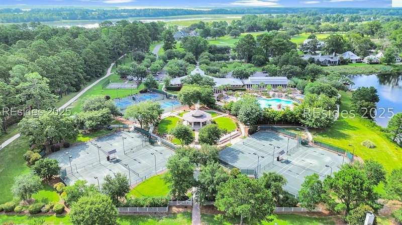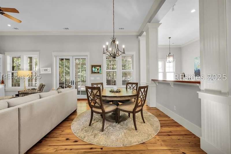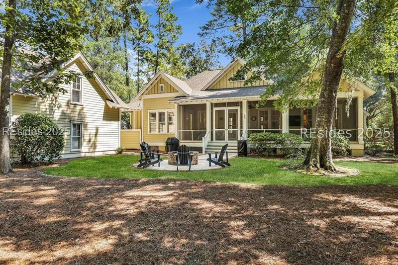 This beautifully renovated single-story home is nestled on a wooded half-acre lot in the heart of Oldfield. Showcasing classic Lowcountry architectural style, the residence features reclaimed heart of pine flooring, exquisite wood trim, and a freshly painted interior. Substantial updates have been made within the last two years, including a new roof installed in 2025, new carpeting, and ceiling fans throughout. The kitchen has been fully updated with new appliances (including a downdraft), quartz countertops, and new fixtures. A casual eating area offers flexibility as either a breakfast nook or a cozy seating space. The expansive great room boasts a gas fireplace, custom side cabinetry, heart of pine flooring, and French doors that open onto a screened-in lanai--perfect for taking in serene views of the private backyard. Adjacent to the great room, the dining area provides a seamless flow for entertaining. The primary bedroom suite overlooks the backyard and features crown molding, a ceiling fan, and an upgraded ensuite bathroom. The newly renovated primary bath is designed for relaxation, with a soaking tub, separate shower, double sink vanity, tile flooring, and spacious walk-in closets. Two additional bedrooms within the main house share a Jack and Jill bathroom, which has also been recently updated. A large fourth bedroom is located above the garage and includes a walk-in closet and a third full bathroom. The laundry room, equipped with a newer washer and dryer, cabinets, and a sink, leads out to the side porch. The oversized detached two-car garage offers generous storage, is extra deep, and includes a dedicated golf cart bay. For outdoor entertaining, the home features a large and peaceful screened-in lanai with new ceiling fans, as well as a brick and tabby patio complete with a substantial brick firepit and refreshed landscaping.