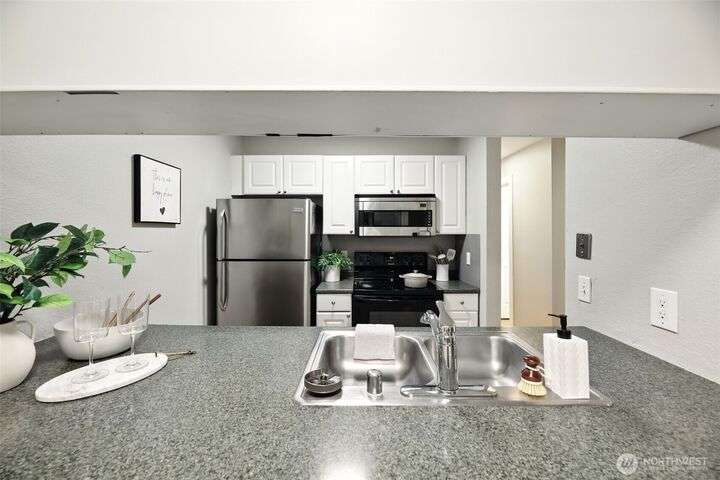 {{Modern Comfort Meets Ideal Location}} This upgraded, move-in ready 2BD home blends style with function. Enjoy a fully permitted bathroom remodel w/ designer tile, new LVP flooring, & fresh paint throughout the open, light-filled floor plan. Relax in the spacious living room by the fireplace or retreat to the primary suite with a walk-in closet & private balcony. With a large laundry/utility rm, two balconies, plenty of storage, & two assigned parking spaces, convenience is built in. HOA dues cover water, sewer, & garbage, making living here effortless. Ideally situated minutes from Lake WA, The Landing, Newcastle Commons, Coulon Beach Park, shopping, dining & more—w/ quick freeway access to Bellevue & Seattle. PreInspected/No Rental Cap.