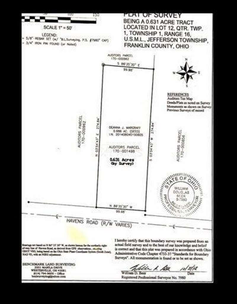 You can own +.50 acre NOW and build your dream home on highly desirable Havens Rd in Gahanna-Jefferson School District! Soil work has been completed and sewer design has also been done for a sand mound. Please see site plan in documents. Per Jefferson Township, house must be situated 25 feet from side property lines and 110 feet in from center line of the road. Call list agent or showing service prior to walking the property.
