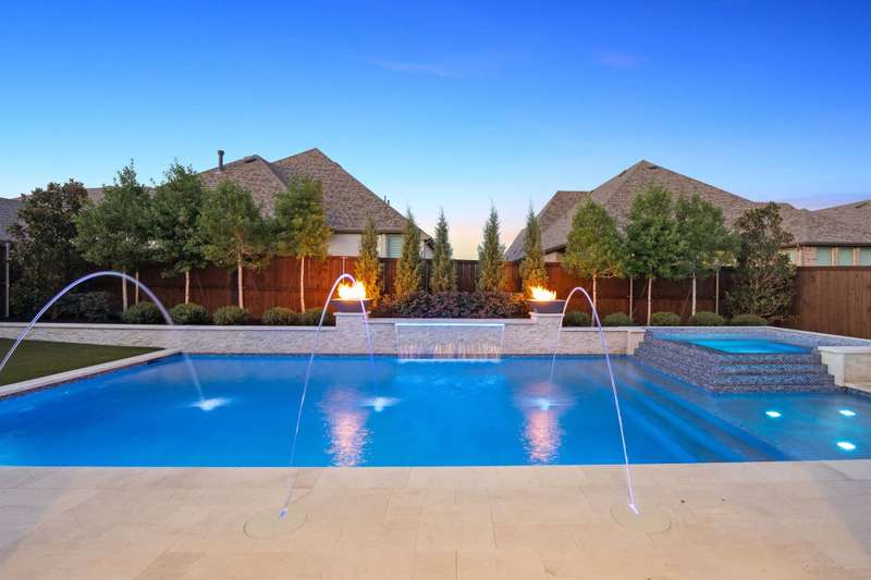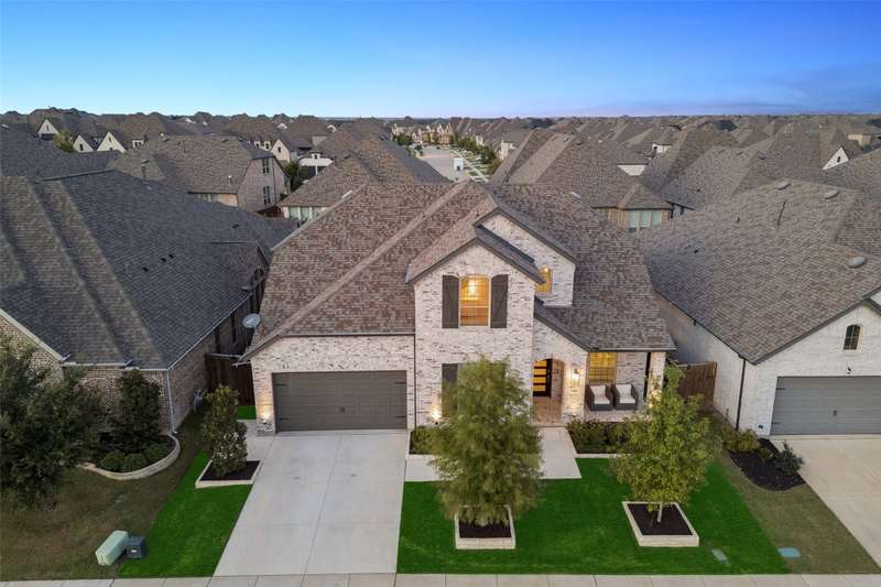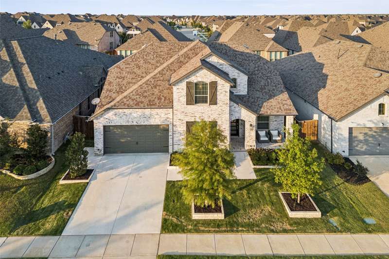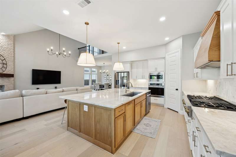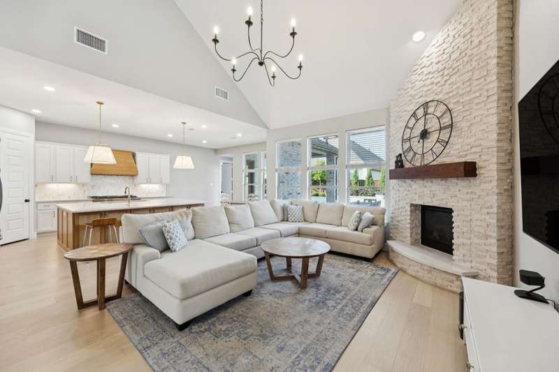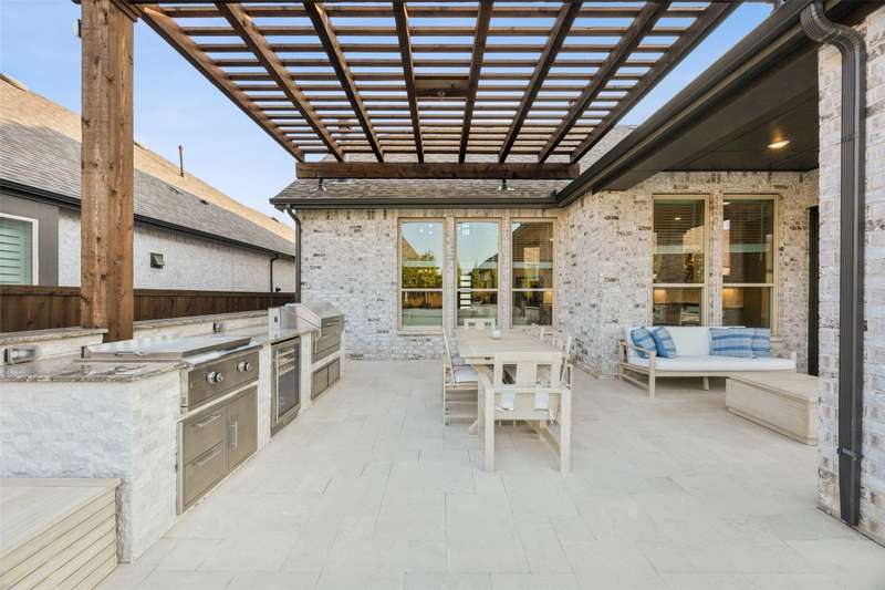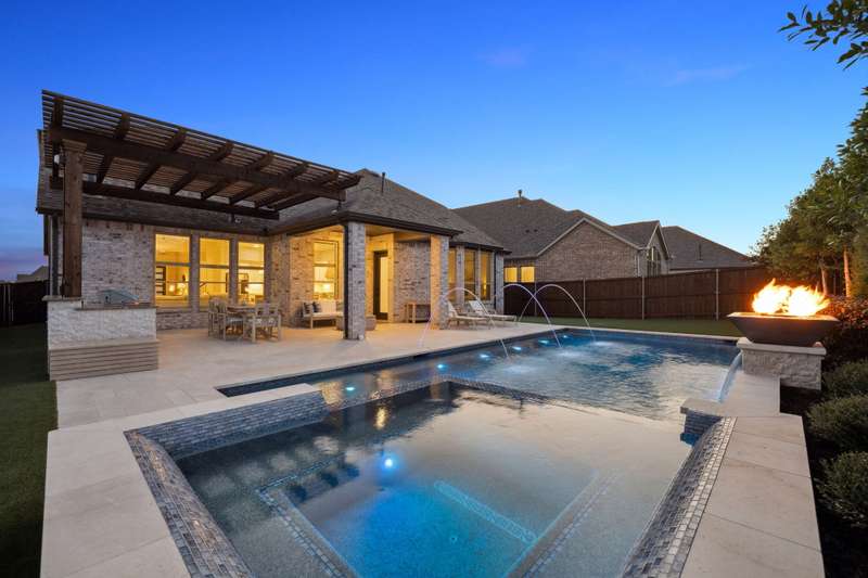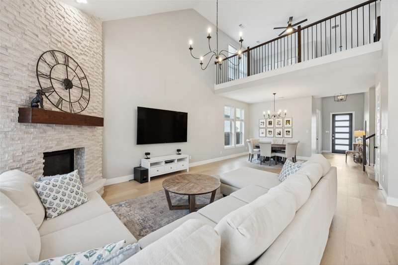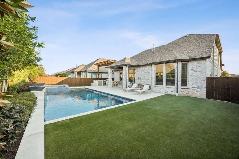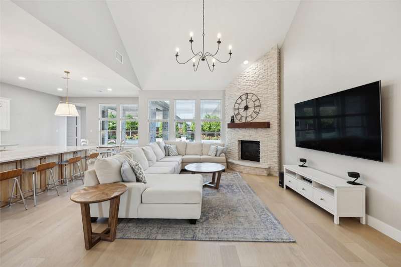 This inviting home is designed w-both style & comfort in mind. Step inside to soaring high ceilings that fill the living spaces w-natural light & create an open, airy atmosphere. The living rm is a true centerpiece, featuring a dramatic corner stone fireplace that adds warmth & characterperfect for cozy evenings. A dedicated home office provides the ideal space for working from home or managing daily tasks, while the main floor guest bedroom offers comfort and privacy for visitors. This show-stopping kitchen features a high-end design. Custom cabinetry offers both style and storage, while designer pendant lighting adds warmth and sophistication. The space is anchored by an oversized island with a gleaming Taj Mahal quartzite top, providing abundant prep space, casual seating, and a natural gathering spot for family and friends. Sleek stainless steel appliances, elegant tile backsplash, and thoughtfully chosen finishes complete the lookcreating a kitchen that is as stylish and luxurious as it is practical. This stunning master suite is designed as the ultimate private escape. Walls lined with expansive windows fill the room with soft, natural light and offer serene views, creating a warm and inviting atmosphere. The spa-inspired ensuite bath is a dream come true! With a freestanding soaking tub and a huge glass-enclosed steam shower designed for the ultimate rejuvenating experience. Dual vanities, elegant finishes, and spacious storage complete the space, blending style and functionality seamlessly. Upstairs boasts 3 bedrooms, all upgraded baths, and game room! 3 car garage w-epoxy. Step outside to your own private 300K oasis for true relaxation. The centerpiece is a sparkling modern pool w-cascading water features & playful fountains, enhanced by glowing fire bowls that create a dramatic ambiance day or night. The covered patio w-wood pergola is perfectly designed for outdoor dining, w-built in kitchen & framed by lush landscaping and privacy fencing! Must See!