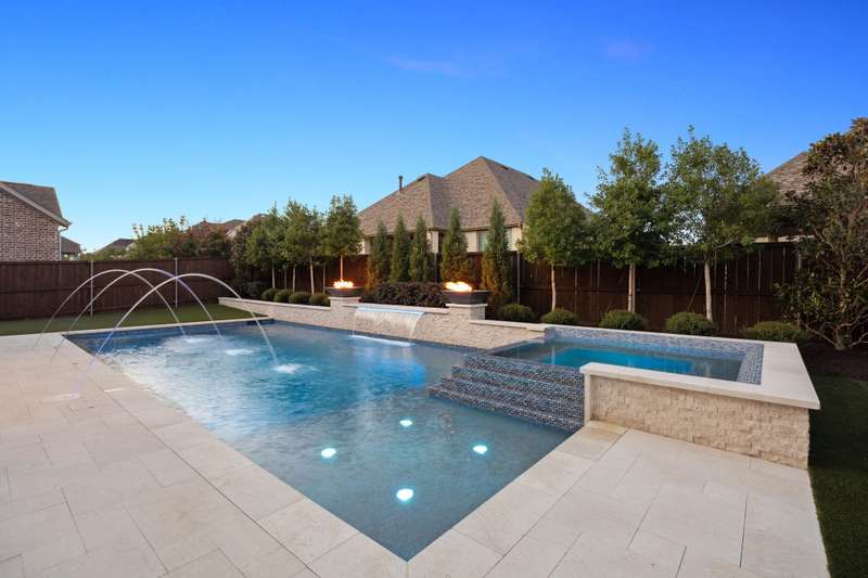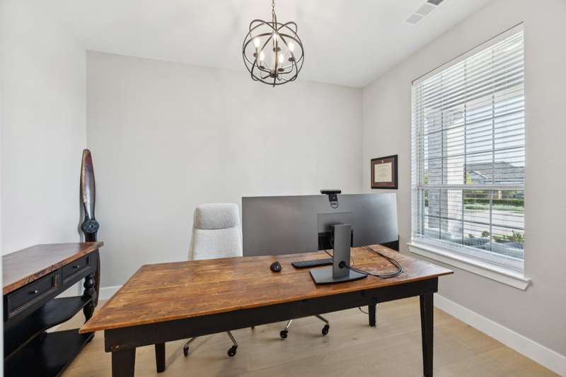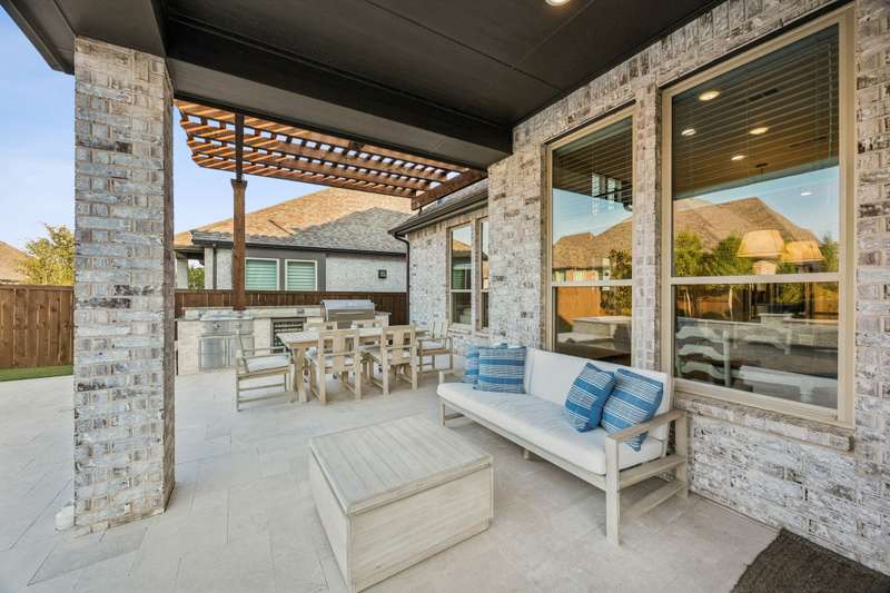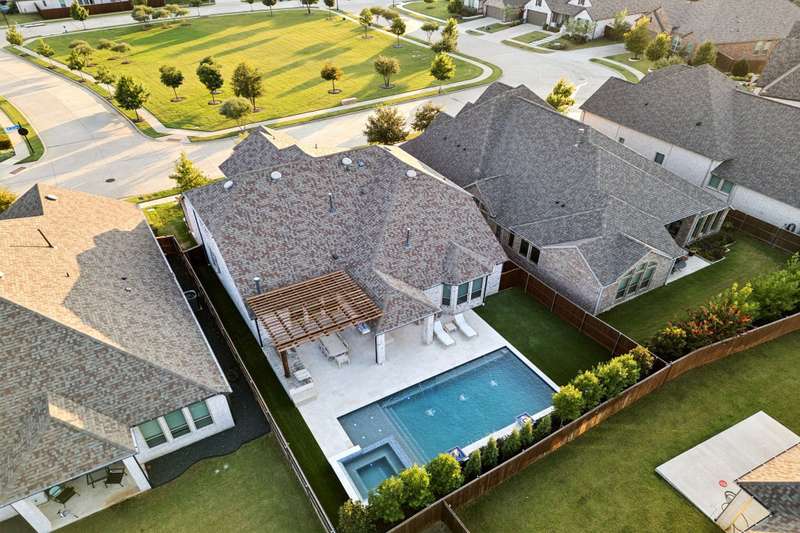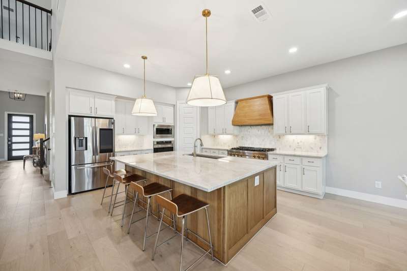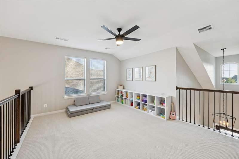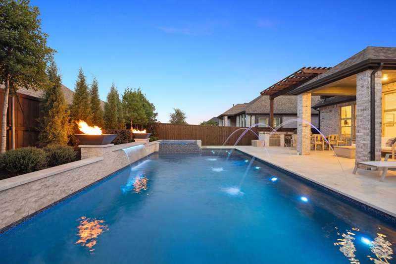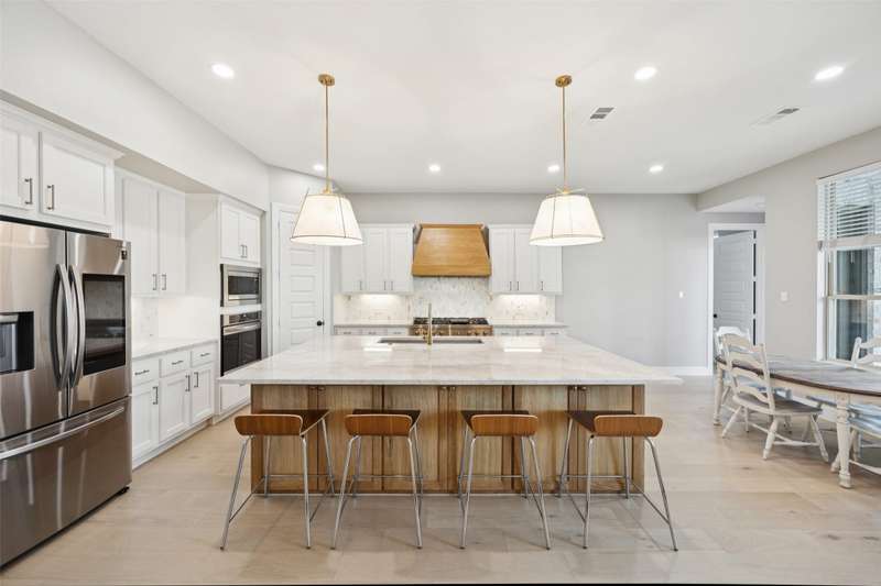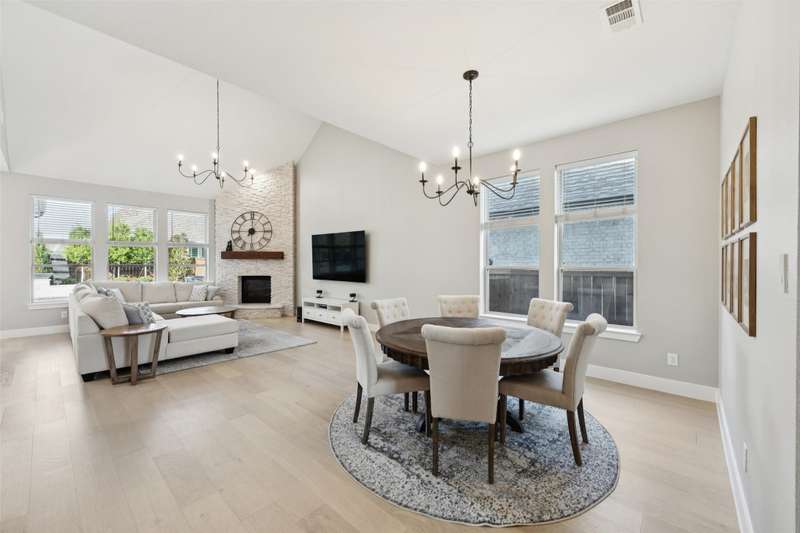 This inviting home is designed w-both style & comfort in mind. Step inside to soaring high ceilings that fill the living spaces w-natural light & create an open, airy atmosphere. The living rm is a true centerpiece, featuring a dramatic corner stone fireplace that adds warmth & characterperfect for cozy evenings. A dedicated home office provides the ideal space for working from home or managing daily tasks, while the main floor guest bedroom offers comfort and privacy for visitors. This show-stopping kitchen features a high-end design. Custom cabinetry offers both style and storage, while designer pendant lighting adds warmth and sophistication. The space is anchored by an oversized island with a gleaming Taj Mahal quartzite top, providing abundant prep space, casual seating, and a natural gathering spot for family and friends. Sleek stainless steel appliances, elegant tile backsplash, and thoughtfully chosen finishes complete the lookcreating a kitchen that is as stylish and luxurious as it is practical. This stunning master suite is designed as the ultimate private escape. Walls lined with expansive windows fill the room with soft, natural light and offer serene views, creating a warm and inviting atmosphere. The spa-inspired ensuite bath is a dream come true! With a freestanding soaking tub and a huge glass-enclosed steam shower designed for the ultimate rejuvenating experience. Dual vanities, elegant finishes, and spacious storage complete the space, blending style and functionality seamlessly. Upstairs boasts 3 bedrooms, all upgraded baths, and game room! 3 car garage w-epoxy. Step outside to your own private 300K oasis for true relaxation. The centerpiece is a sparkling modern pool w-cascading water features & playful fountains, enhanced by glowing fire bowls that create a dramatic ambiance day or night. The covered patio w-wood pergola is perfectly designed for outdoor dining, w-built in kitchen & framed by lush landscaping and privacy fencing! Must See!