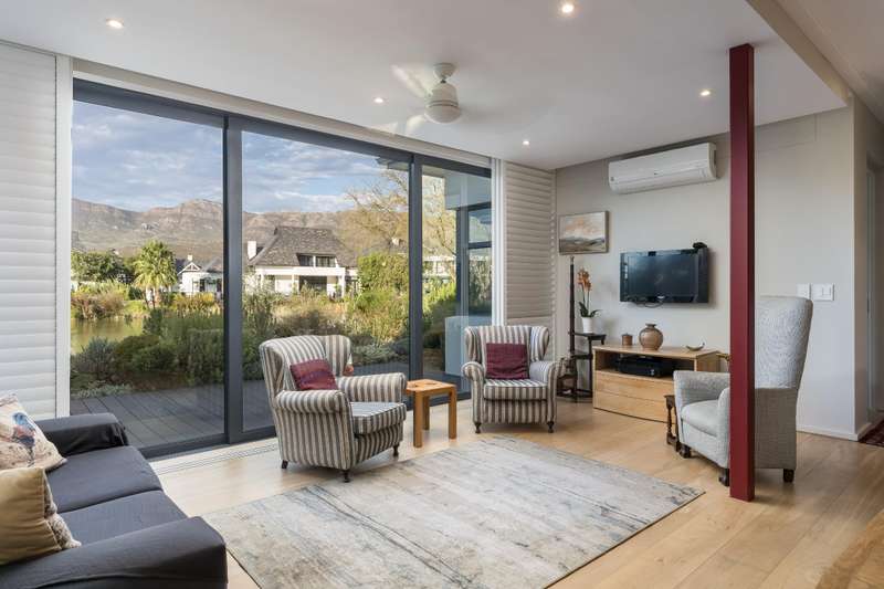 This immaculate home offers unparalleled water views from every room, including the spacious living areas and all three bedrooms, creating a serene and peaceful atmosphere throughout. Designed with a thoughtful layout, the open-plan kitchen seamlessly flows into two separate living spaces, each featuring glass sliding doors and shutters that invite the sounds of nature indoors. Whether you?ÇÖre relaxing in the living room or enjoying the tranquility of the lake, the connection to the natural surroundings is undeniable. The villa offers versatile living with a convenient ground-level bedroom and two additional bedrooms upstairs. The neutral finishes in the bathrooms, paired with a bright white kitchen, rich wooden Oggie flooring, and elegant white shutters, create a timeless canvas ready to complement any style or color palette. The rental price excludes the Pearl Valley Club Membership fee.