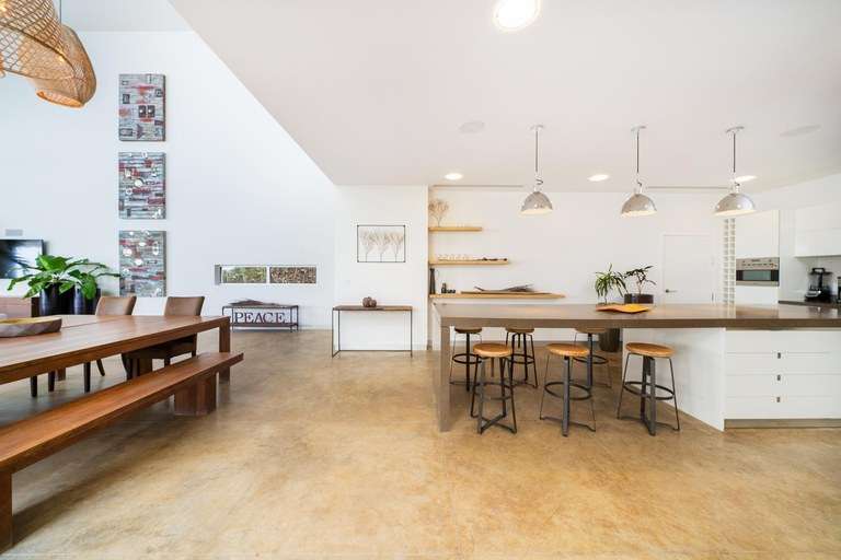 The outdoor area is designed for relaxation and entertainment, featuring a beautiful pool surrounded by native greenery, a built-in BBQ space, and sun loungers for enjoying the ocean breeze.