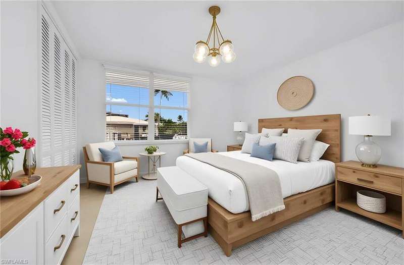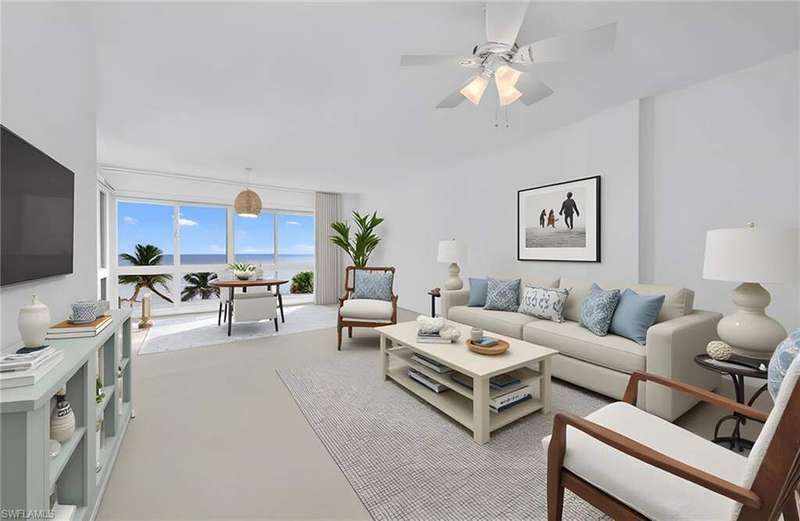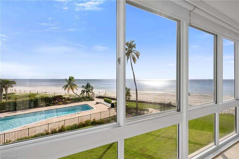 Scenic views of the Gulf define this 2nd-floor residence in Royal Palm Club. This light-filled 2-bedroom, 2-bath home offers 1,143 sq ft of open-concept living where the kitchen has been opened to the living area to maximize sightlines to the Gulf and lanai. Southwesterly exposure delivers panoramic views of the pool, beach, and Gulf with the Naples Pier visible on the horizon. The kitchen features warm brown tones, rich cabinetry with new hardware, complementary countertops and authentic Spanish tile flooring and accents that lend Mediterranean charm and durable function. Both baths have been tastefully updated; the primary bath showcases a spacious walk-in shower with a frameless glass door, decorative tile detail and updated cabinetry. Bedrooms are freshly painted for a move-in-ready presentation. An open lanai with tile extends the living space and provides an ideal spot for morning coffee or sunset viewing. The community pool is conveniently located steps from the Gulf, enhancing the beachfront lifestyle and easy access to sand and surf. Moorings Private Park is located next door, adding exclusive greenspace and easy access to waterfront recreation. Located in a low-density Gulf-front building, this property offers direct beach access, a residential feel and convenient proximity to dining, shopping and recreation.