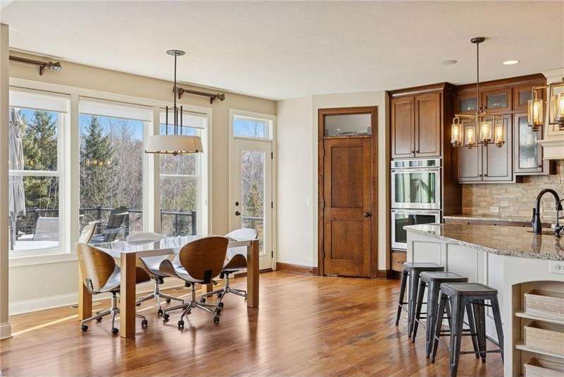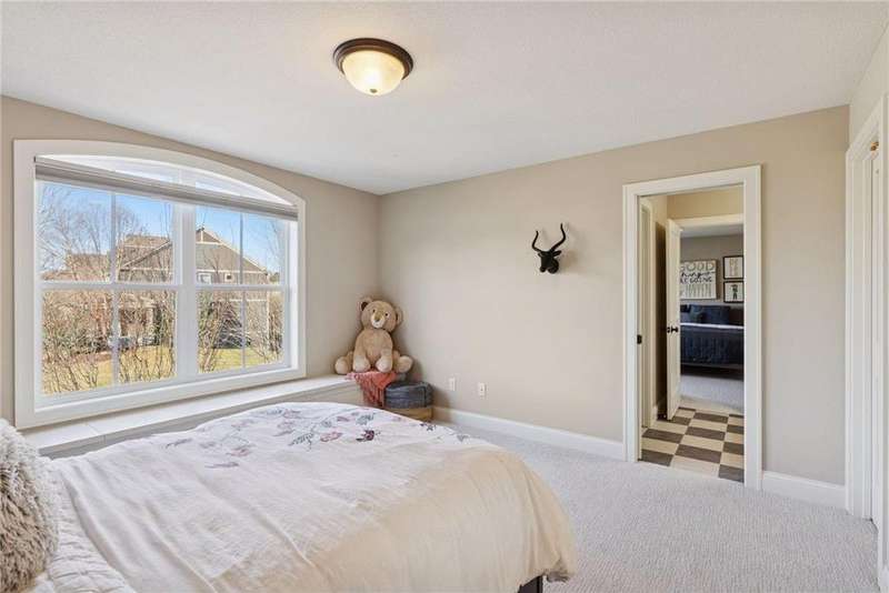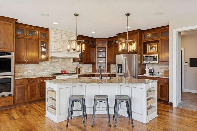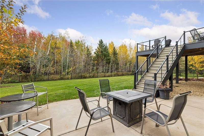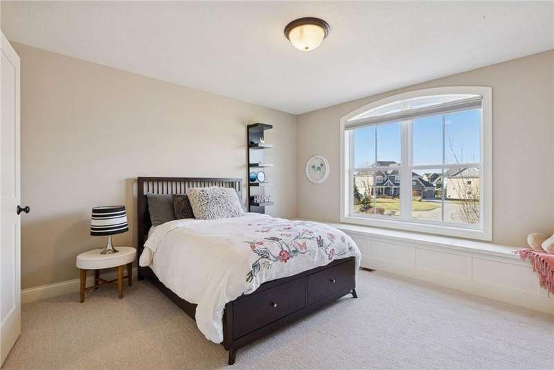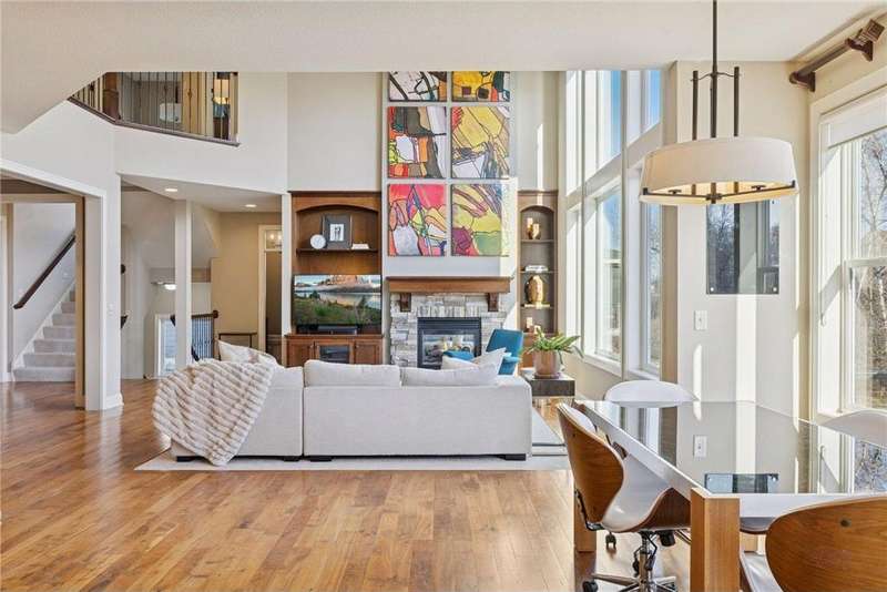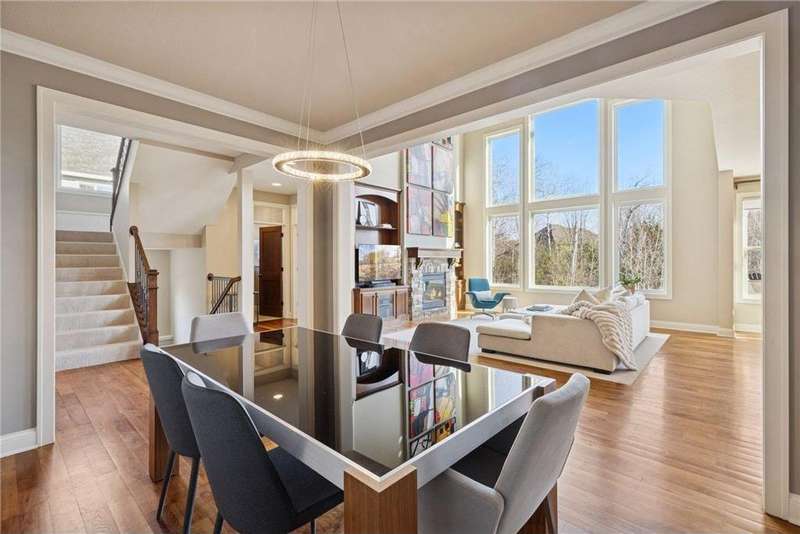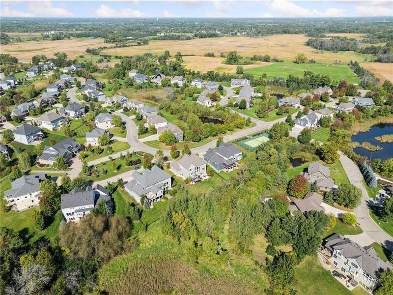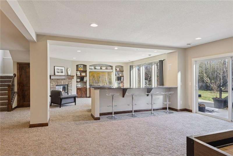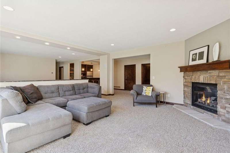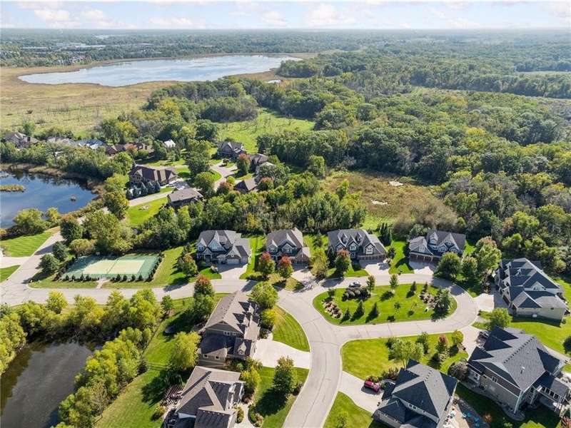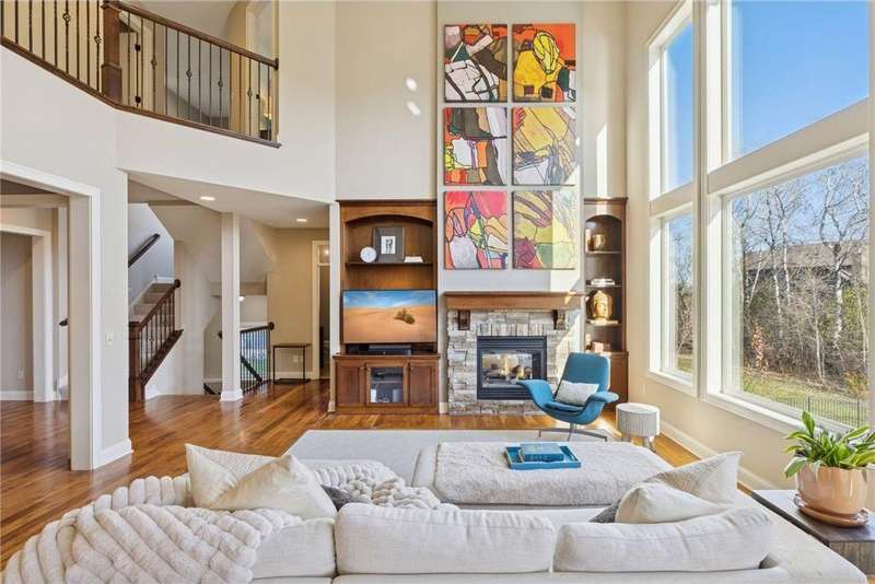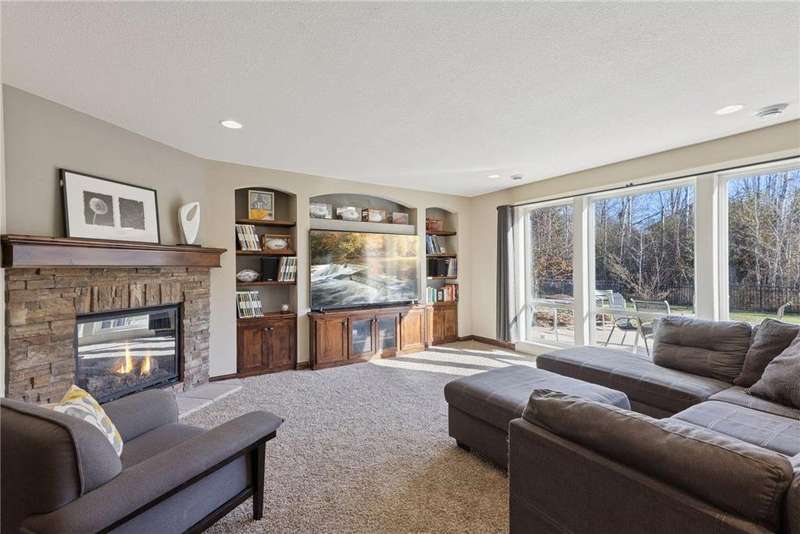Beautifully finished 2-story home set on a quiet cul-de-sac with a private, fenced backyard overlooking serene nature views. Rich architectural details, wood floors, and sun-filled spaces create a warm, move-in-ready setting. The main level features a grand 2-story Great Room with a full wall of windows and a 2-sided fireplace shared with the inviting Sunroom. The large Kitchen impresses with an enameled island with breakfast bar, walk-in pantry, double wall ovens, and furniture-style cabinetry for the cooktop. Formal and Informal Dining spaces offer flexibility for everyday living and gatherings. A spacious Mud Room provides built-in seating, open locker-style storage, and its own walk-in closet, plus a convenient half Bath. Upstairs, the Primary Suite feels luxurious with a fireplace-accented seating area and an inset ceiling for added definition. The private spa-like Bath includes dual vanities, soaking tub, separate shower, and private water closet plus a large closet with an organized closet system. Bedroom 2 has a full en-suite Bath with tub, while Bedrooms 3 and 4 share a Jack & Jill Bath. The large upper-level Laundry features upper cabinets and open shelving under the counter for easy organization. The walkout lower level adds exceptional versatility - ideal for multi-generational living or effortless entertaining. Highlights include a 5th Bedroom, 3/4 Bath, Wet Bar with fridge & seating, media-ready Family Room, Recreation Room, Flex/Storage Room, and built-in cabinetry. Step out to the expansive Patio or enjoy the newer Deck above. Neighborhood amenities just steps away include an outdoor pool, clubhouse, walking trails, and an outdoor sports court. A welcoming covered front porch completes this exceptional home!