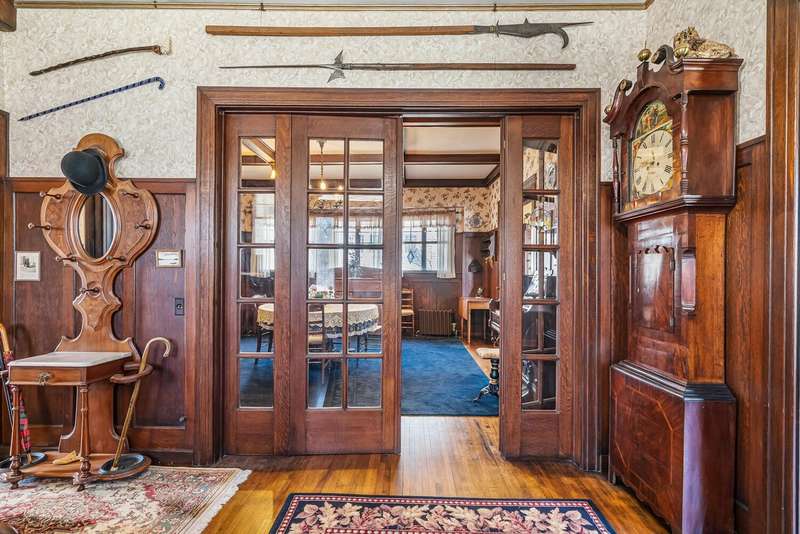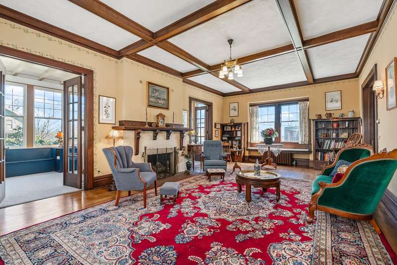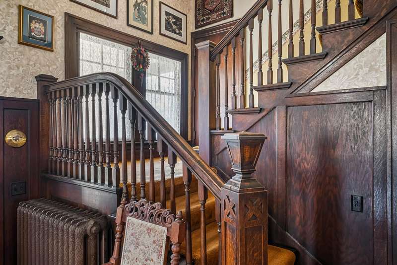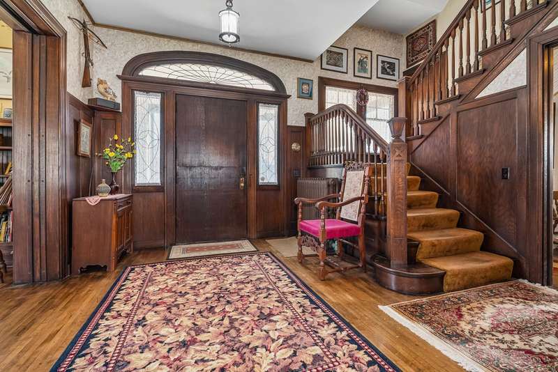 Designed by architect Forrest Van VolkenBerg, construction on this stately Dutch Colonial Revival style home was completed in 1911. This is the first time this home has been sold since 1945. The Craftsman style expressions of the period are distinguishable in the eyebrow window, bracketed eaves, pierced pier canopy covering the arched front entry and the enclosed 3 season porch. This iconic home is part of the Henderson Park/West Main Hill Historic District and is listed on the National Register of Historic Places alongside the Henderson Castle which is just a short, 2 block, stroll along the picturesque tree lined street. The elegant grand foyer graciously connects with the large living room and a stunning formal dining room through either of two sets of double doors with the original leaded glass. The spacious living room has a fireplace, coffered ceilings and has two doorways into a wonderful 2 season porch with 2nd fireplace. The formal dining room has coffered ceilings, 3/4 wainscoting and built in cabinetry. A real butlers pantry connects the formal dining room with the kitchen and a small room once used as a telephone room. In the kitchen you'll still find the bell box used to notify the servants that something was needed on one of the other floors. On the 2nd floor you'll find 4 bedrooms, one currently used as a living area with yet a 3rd fireplace, a full bath and a enclosed sun room. The 3rd floor has a 5th bedroom, full bath and game room. A full basement offers more than amble storage, a workshop area, finished living area and laundry. You'll find the original woodwork and original leaded glass throughout this extremely well cared for home. There are 2 garages, the 2 car is attached to the home by a lovely deck and the other is a one car garage with attached storage area. The roof was replaced in 2022 and new city water line in 2024. Preapproved or buyers with proof of funds only.