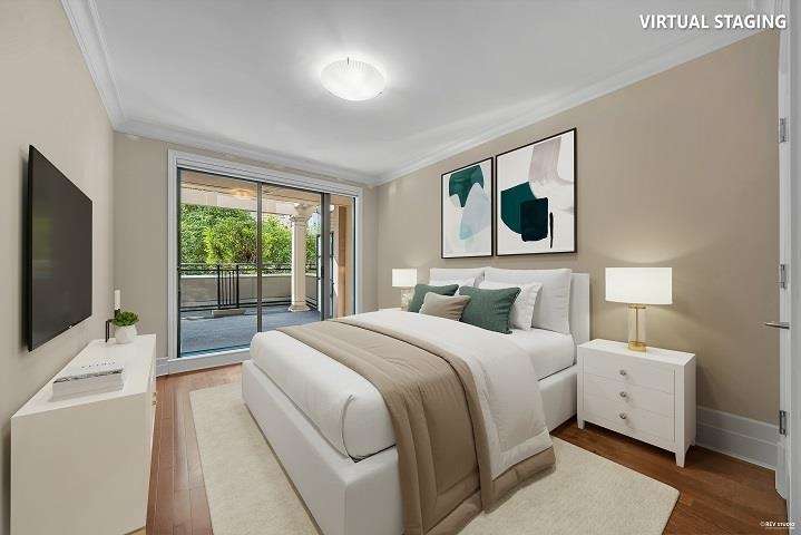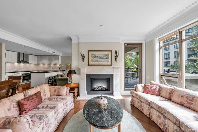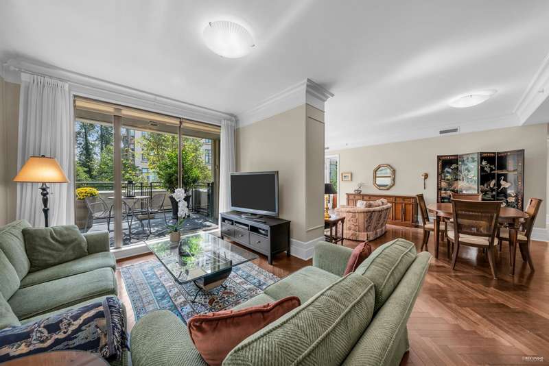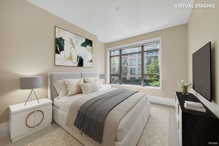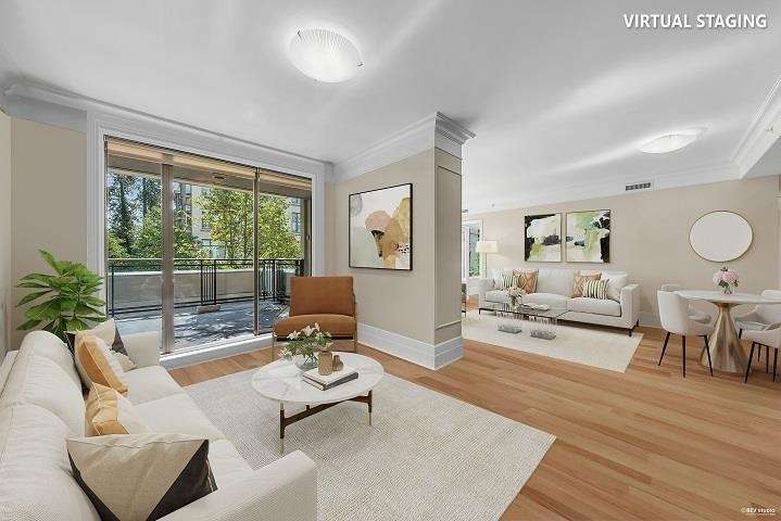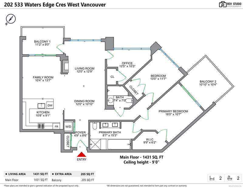 Elegant & Luxury Living at prestigious Waters Edge. Rare offering of 1430 sq ft - S/E facing, beautifully appointed gourmet kitchen, spacious living and dining area, added family area, office/den, 2 Bedrooms, 2 bathrooms & 2 large patios. High ceilings, oak hardwood flooring, air conditioned, concierge, 2 great parking spots & storage. 1st class amenities inc. fitness center, library/lounge, sauna/steam. Designed by world renowned architect, Robert Stern and nestled along the Capilano River, steps to Park Royal, Trails and all the amenities offers a wonderful lifestyle and transition from larger home. (Few virtual staged pictures). - A true Gem!