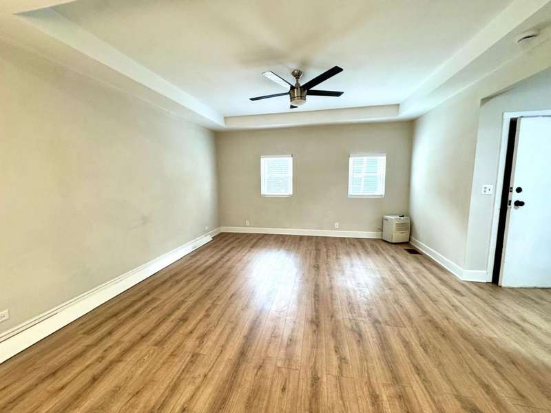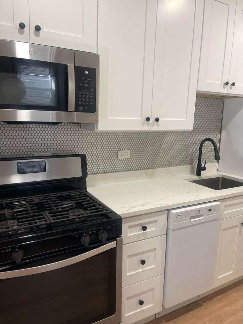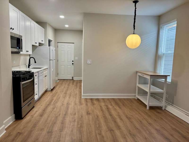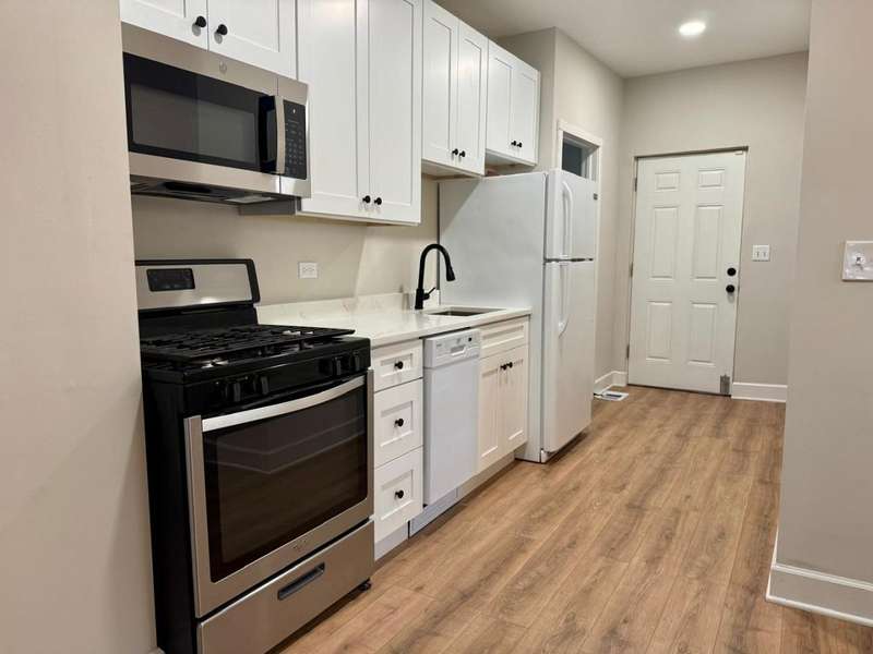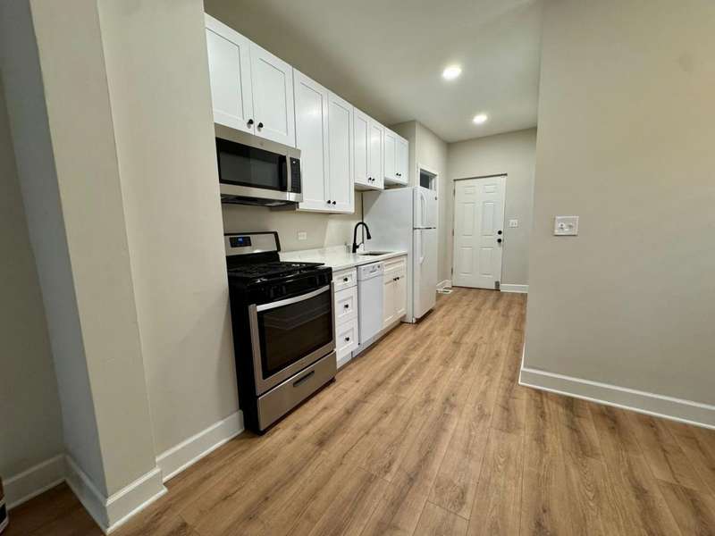 Beautifully renovated duplex-down unit situated on a tree-lined street, centrally located in West Bucktown, steps to 606 trail, Western Blue Line, parks, restaurants and more! Brightly lit unit is inviting and spacious, featuring brand new vinyl plank flooring upstairs in main level. Enter into the main floor and step into the expansive living room and kitchen featuring white updated cabinetry, quartz counters and dining nook. Full sizable bedroom on main level. Full bathroom on main level has just been renovated with gorgeous, neutral tile and updated vanity; plus a new stand-up shower. Main floor offers an additional closed off room that can be used for an office or huge closet. Lower level boasts 2nd and 3rd bedroom, a gorgeous freshly tiled bathroom with newer vanity and extra linen storage. Unit is equipped with central heat and in unit washer/dryer. Common patio space will be great for spring and summer months. Rent includes water, utilities are tenant responsibility. No pets. Easy street parking.