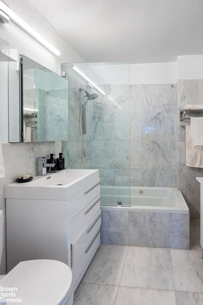 The chef-inspired, windowed kitchen has been fully renovated with upgraded countertops, stainless steel appliances and a contemporary marble backsplash ideal for cooking and entertaining. Custom built-in storage in both the living room and primary bedroom ensures ample space for all your needs.