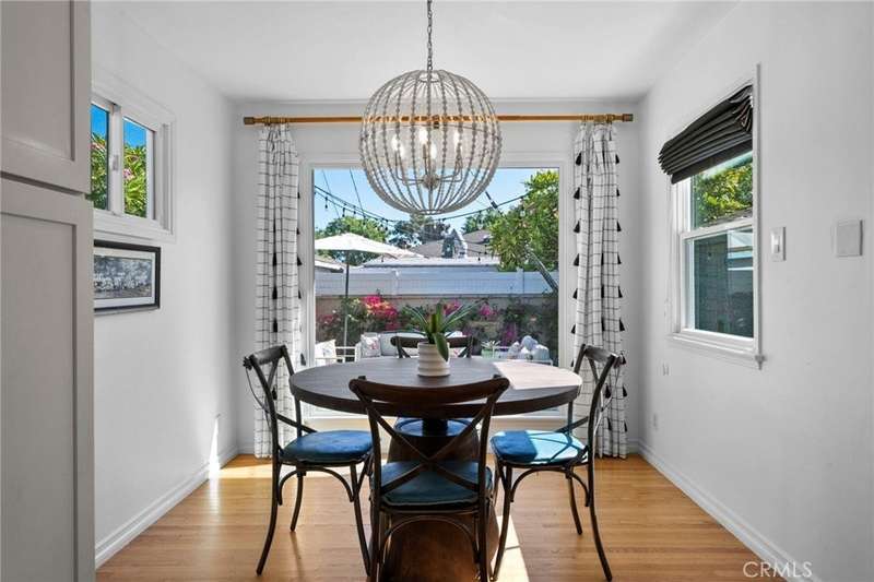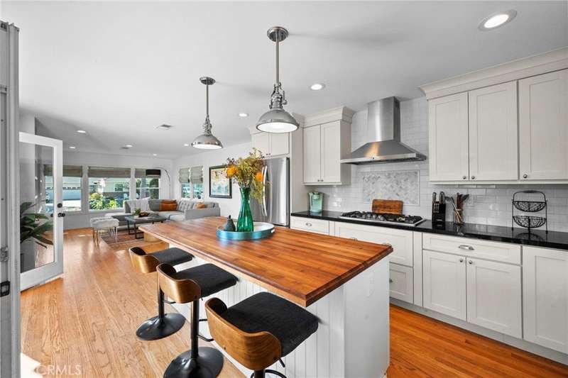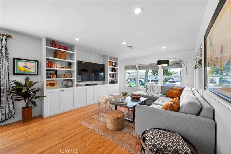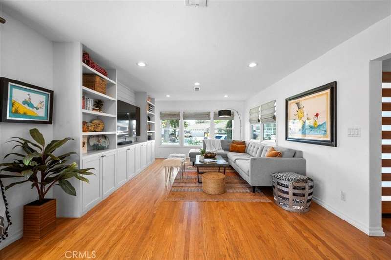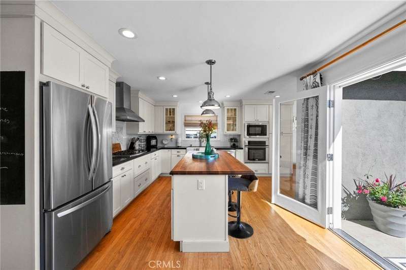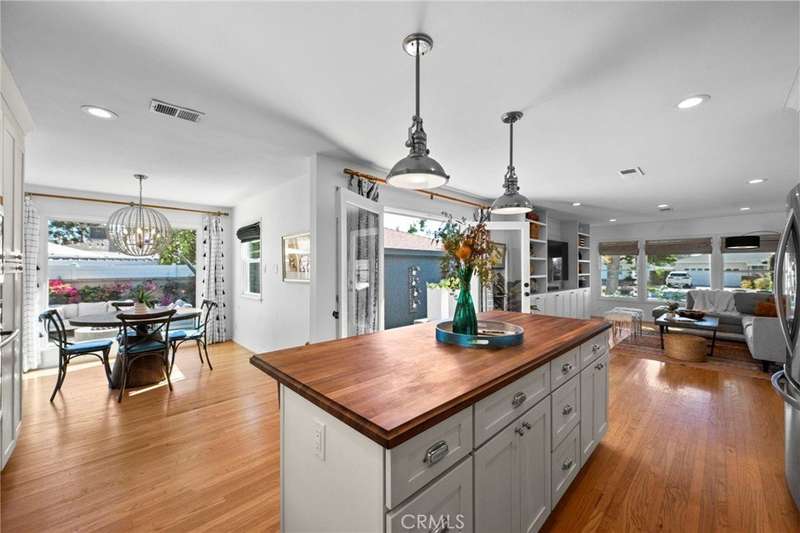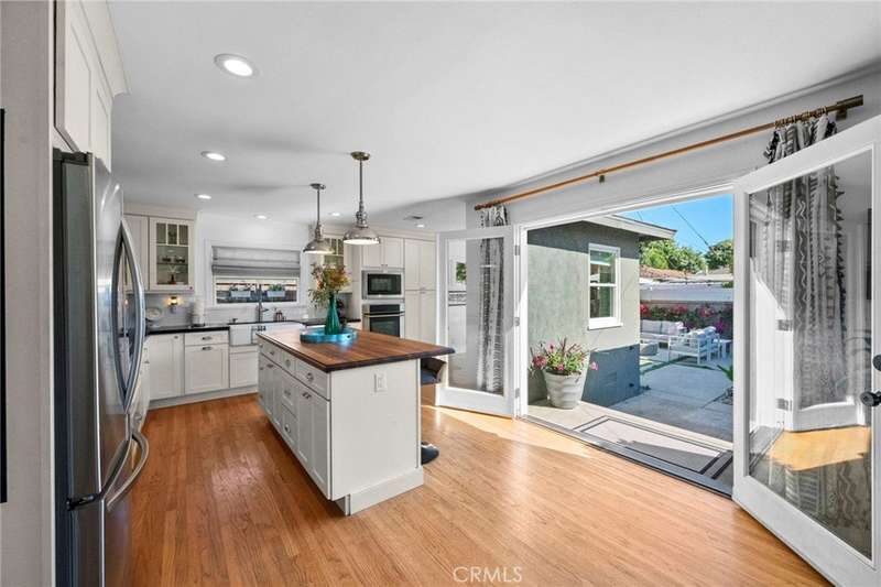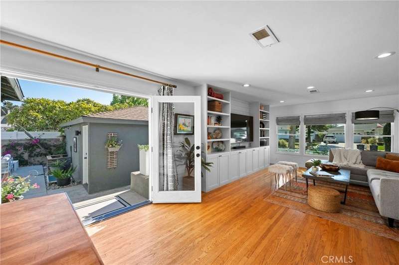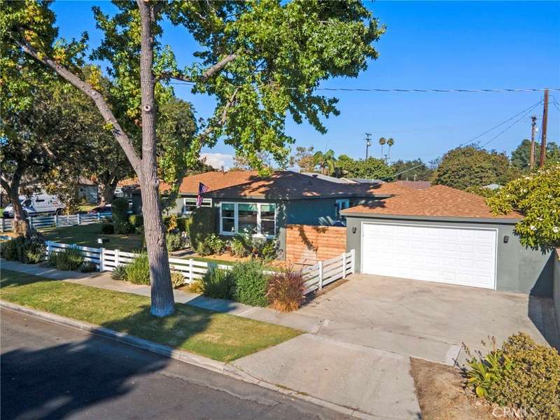 Welcome to this beautifully updated mid-century gem, built in 1952 and full of character! Nestled on a peaceful corner in the charming Park Santiago neighborhood—known for its tree-lined streets and vintage homes. This move-in ready residence blends classic design with modern updates in all the right ways. From the moment you arrive, the architectural details catch your eye: a sleek horizontal fence, a stylish wood-and-glass front door, fresh dark gray/green paint with crisp white trim, and newly added front steps and porch—all setting the tone for the contemporary touches inside. Step through the door and into an airy, open-concept layout designed for comfortable living and effortless entertaining. Warm original wood flooring flows throughout, complemented by all-white walls, recessed lighting, and French doors that open to a private backyard oasis. The spacious living room features custom built-in entertainment cabinetry and a view of the landscaped, fully fenced front yard. With windows on three sides, the dining area is bright and inviting—blurring the line between indoor and outdoor living. At the heart of the home is a beautifully appointed kitchen with a large island that seats four, perfect for gatherings and everyday life. Enjoy stainless steel appliances, a mix of butcher block and quartz countertops, glass-front cabinetry, and abundant natural light—making this space both functional and stylish. Outside, you’ll find two cozy patio areas, including one with a fire pit—ideal for relaxing under string lights on a warm evening. The detached 2-car garage includes new 6A electrical for car charging and a wide driveway for added convenience. This home offers three comfortable bedrooms and two tastefully updated bathrooms, including a private primary suite. The laundry room was remodeled with tile floors and a folding table with open shelves. The spacious, fully fenced front yard provides a secure play area or the perfect spot to unwind. With fresh interior and exterior paint, new insulation, an upgraded electrical panel, and newer HVAC, tankless water heater, plumbing, and roof systems, this home is not only beautiful but also thoughtfully maintained. All in all, this is a wonderful opportunity to own a stylish mid-century home in one of the area's most desirable, centrally located neighborhoods. Come see for yourself—you’ll feel right at home!