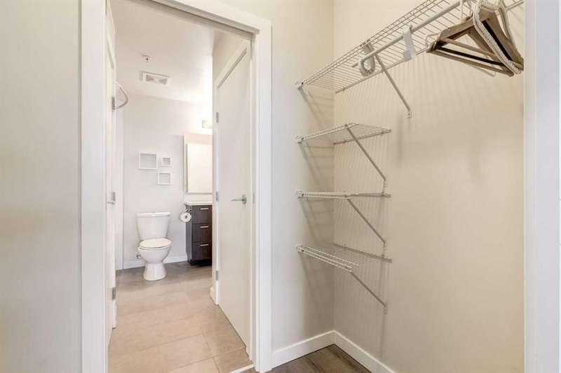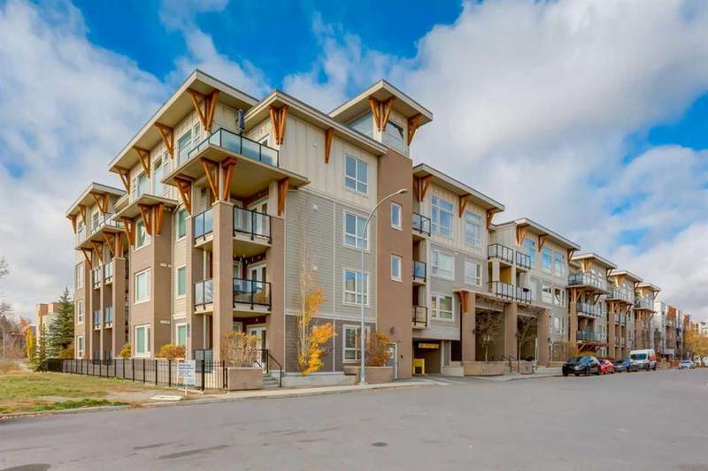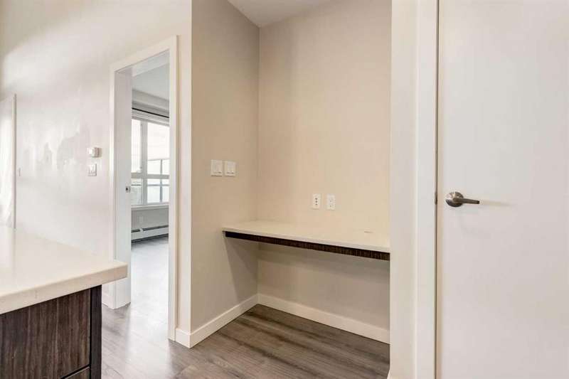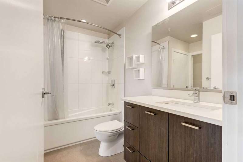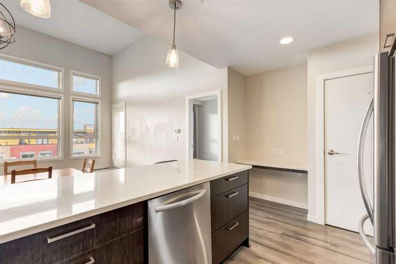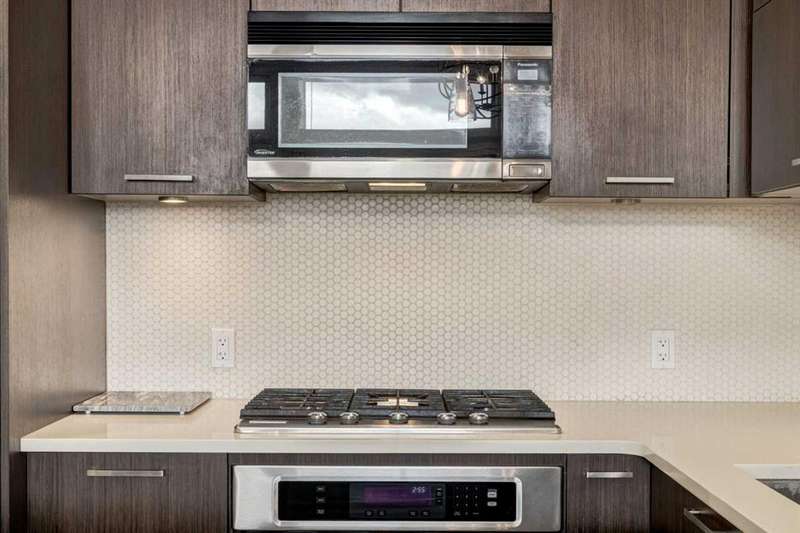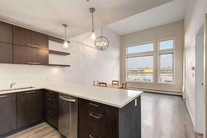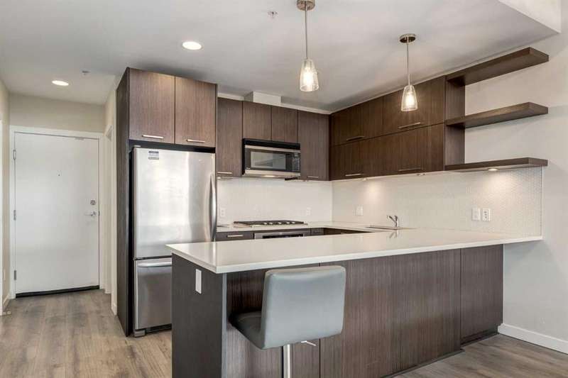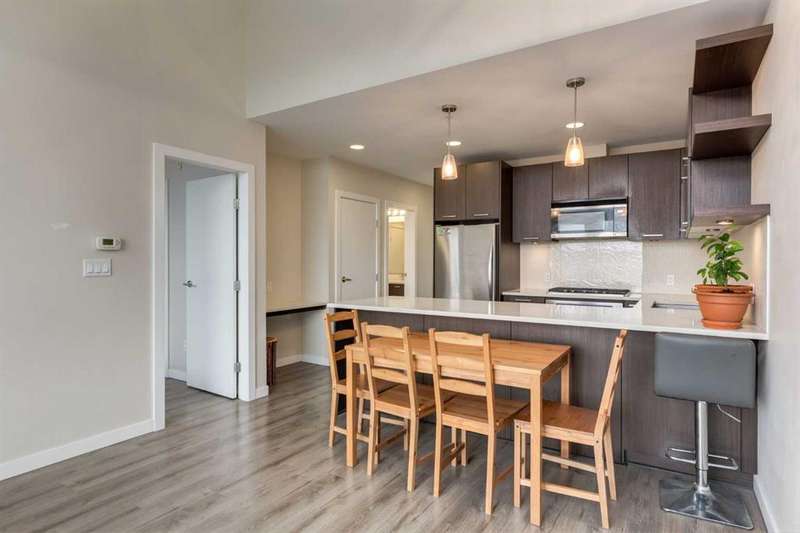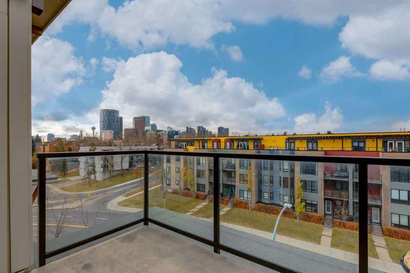 Enjoy incredible city views with sunny southwest exposure in the highly sought-after NEXT Condominium. This top-floor, 1-bedroom, 1-bathroom unit provides close to 600 square feet of living space with 13-foot ceilings in the living area and ample windows, allowing for abundant natural light throughout the day. The open-concept layout includes quartz countertops, stainless steel appliances, a gas cooktop, and a large island overlooking the living room, designed for efficient use of space and easy entertaining. The master bedroom features a 4-piece ensuite, a walk-through closet, and in-suite laundry. Additional features include a gas line for a barbecue, a chandelier in the dining area and master bedroom, a cozy den suitable for an office, in-unit storage, an assigned storage locker, and titled parking. NEXT offers a range of amenities, including a fitness center, underground visitor parking, bike storage, car and pet wash, a sheltered courtyard, and a garden area. This pet-friendly complex (with approval) is located just steps from Bridgeland’s amenities, including restaurants, cafes, bars, and shopping, and is minutes from the downtown core. 2025 City Assessment Value is $357,500(Unit $347,500 & Parking stall $10,000). Please click the Virtual Tours for more details!