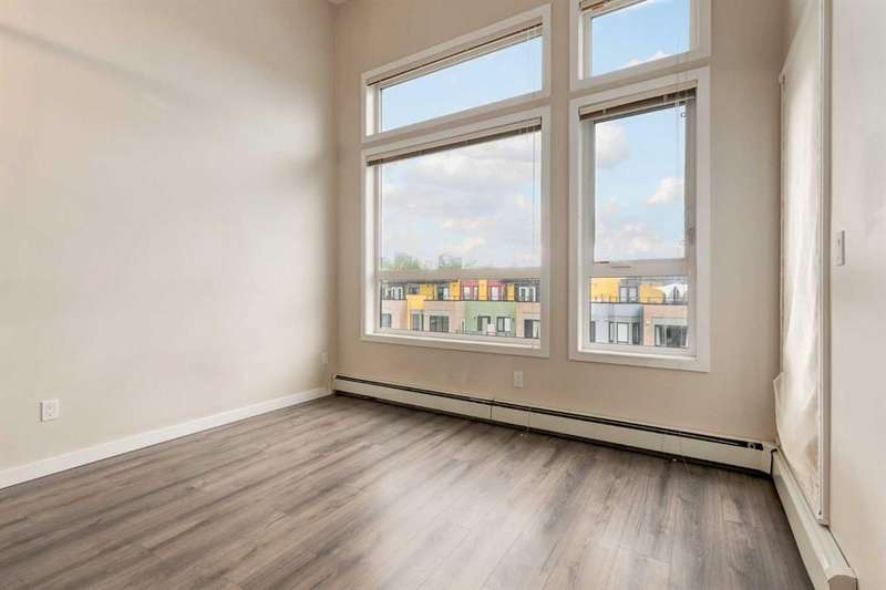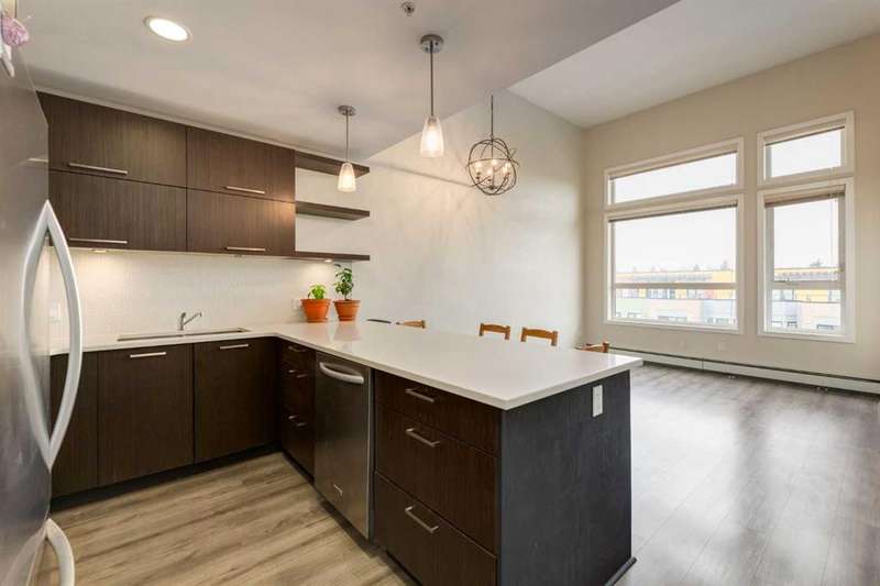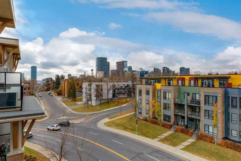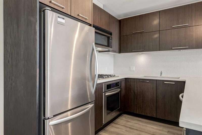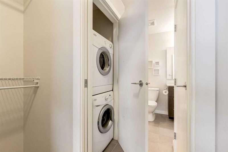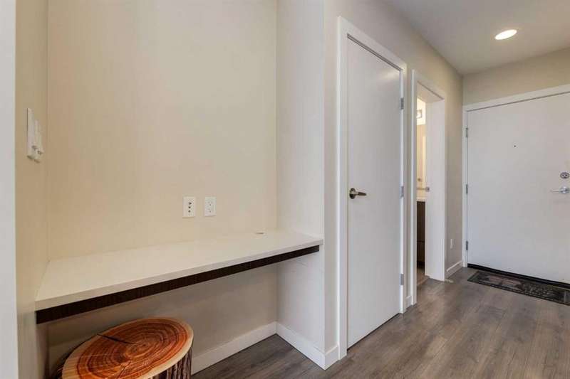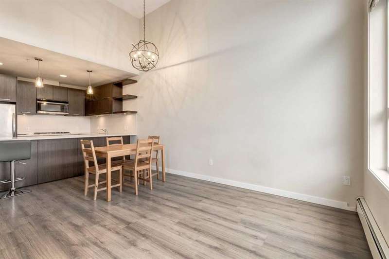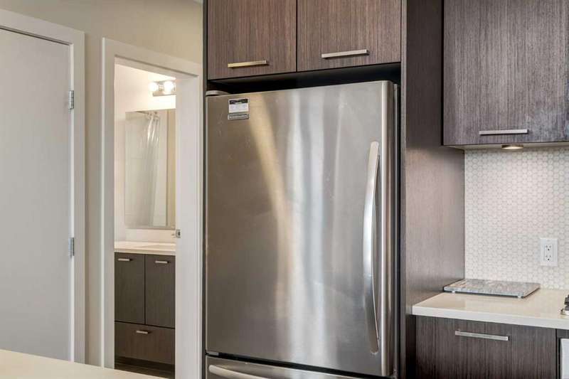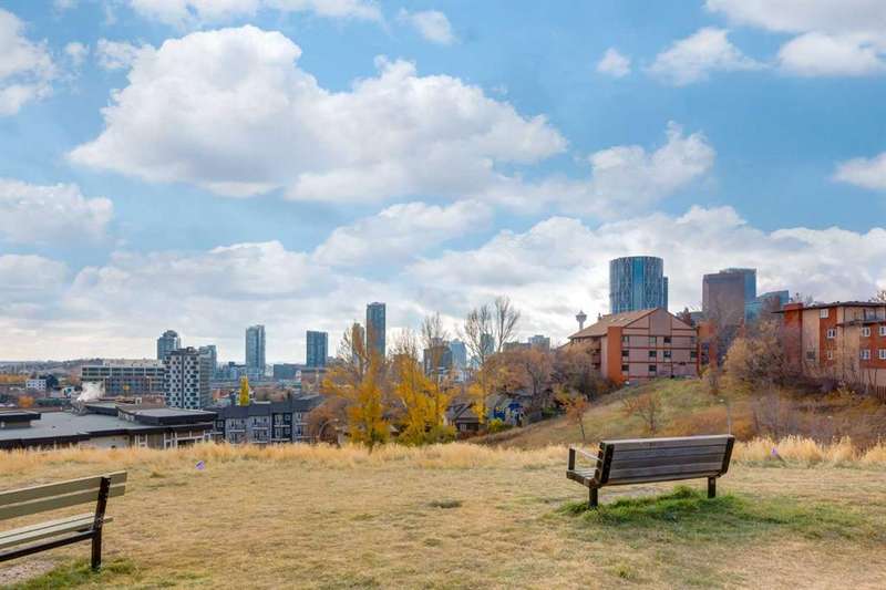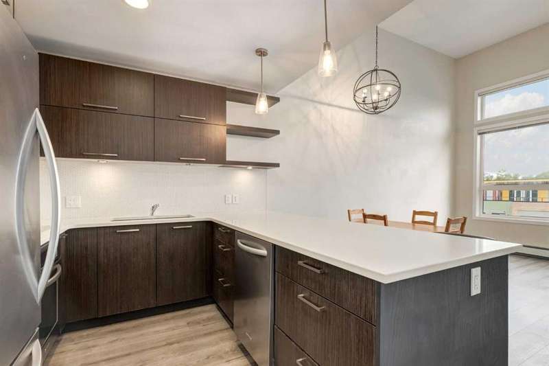 Enjoy incredible city views with sunny southwest exposure in the highly sought-after NEXT Condominium. This top-floor, 1-bedroom, 1-bathroom unit provides close to 600 square feet of living space with 13-foot ceilings in the living area and ample windows, allowing for abundant natural light throughout the day. The open-concept layout includes quartz countertops, stainless steel appliances, a gas cooktop, and a large island overlooking the living room, designed for efficient use of space and easy entertaining. The master bedroom features a 4-piece ensuite, a walk-through closet, and in-suite laundry. Additional features include a gas line for a barbecue, a chandelier in the dining area and master bedroom, a cozy den suitable for an office, in-unit storage, an assigned storage locker, and titled parking. NEXT offers a range of amenities, including a fitness center, underground visitor parking, bike storage, car and pet wash, a sheltered courtyard, and a garden area. This pet-friendly complex (with approval) is located just steps from Bridgeland’s amenities, including restaurants, cafes, bars, and shopping, and is minutes from the downtown core. 2025 City Assessment Value is $357,500(Unit $347,500 & Parking stall $10,000). Please click the Virtual Tours for more details!