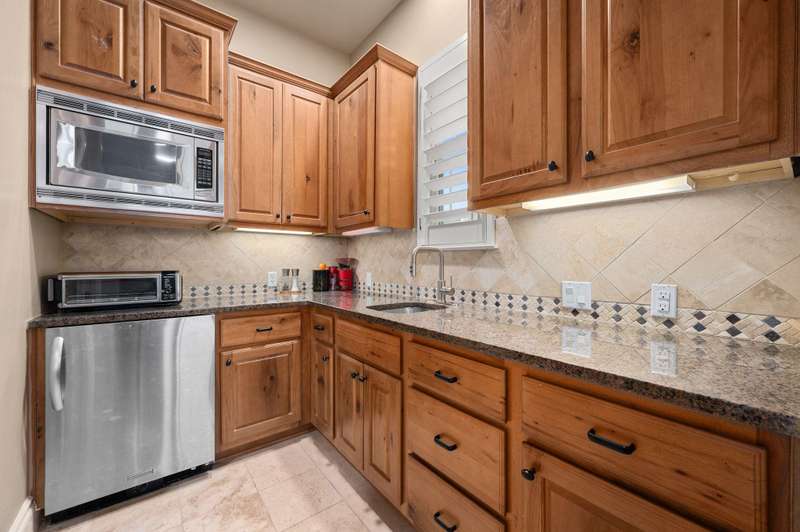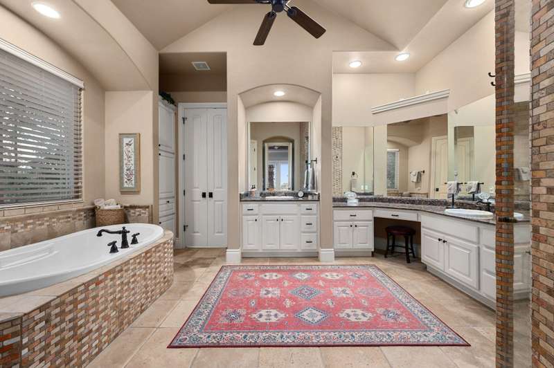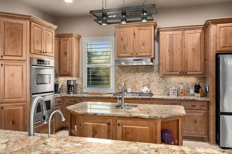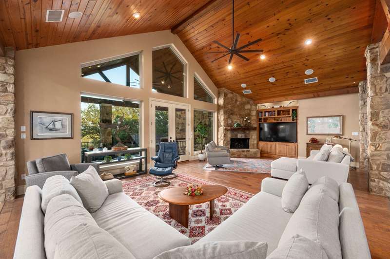This property is well equipped with soaring knotty pine ceilings, stone accents, hardwood/stone floors, 8-ft doors, custom wide moldings, wall of windows in great room, gourmet kitchen, pool, spa, waterfall, oversized entertaining pavilion with kitchen, covered patio off main house with fireplace, covered patio off upper level of guest house, fenced garden, two wells (one with two 5,000-gal holding tanks for irrigation only), access to HOA boat ramp.