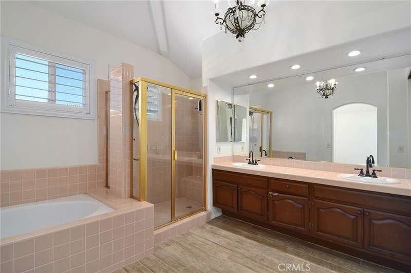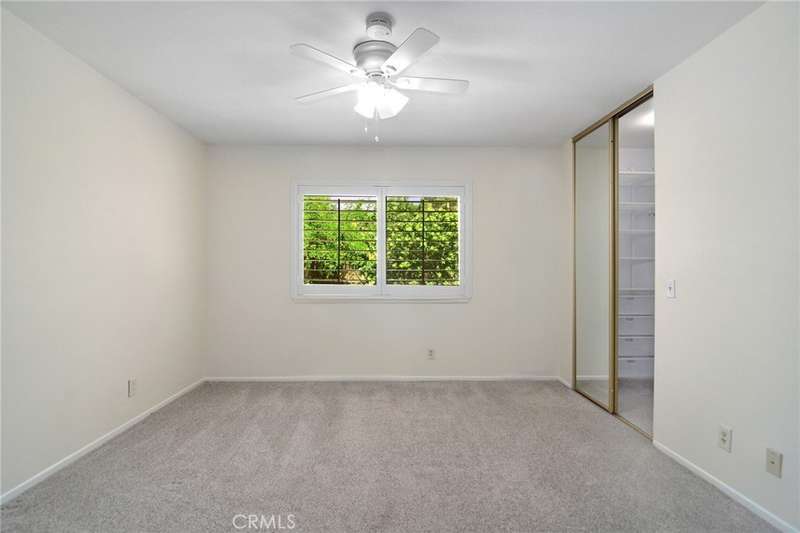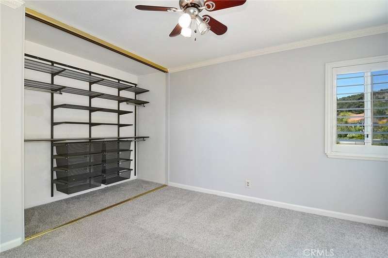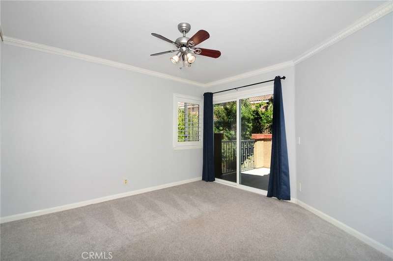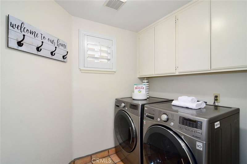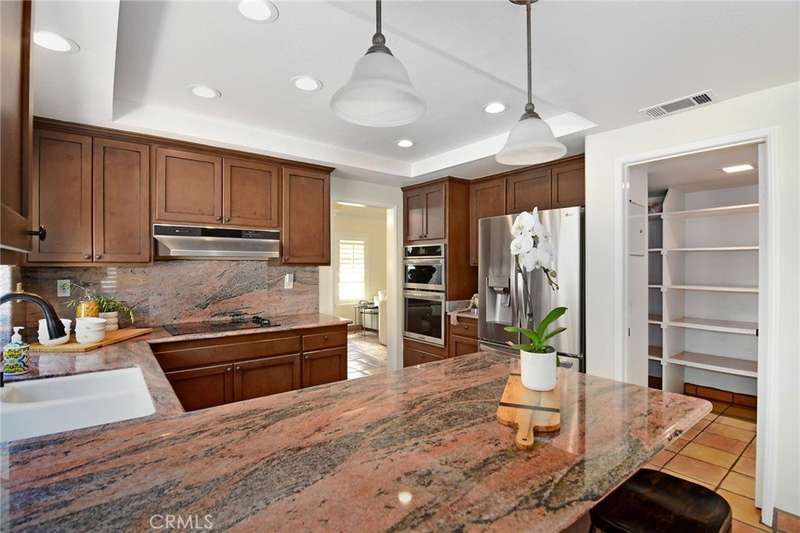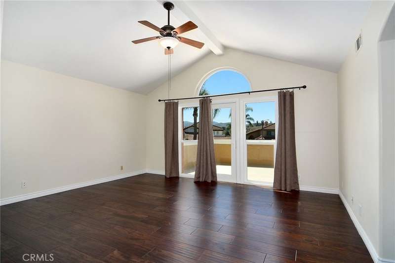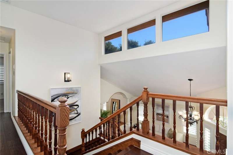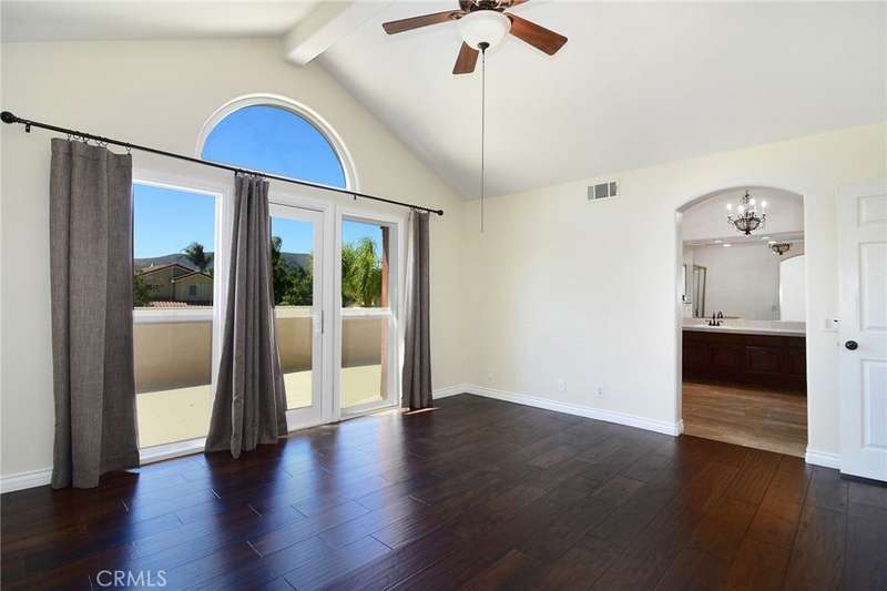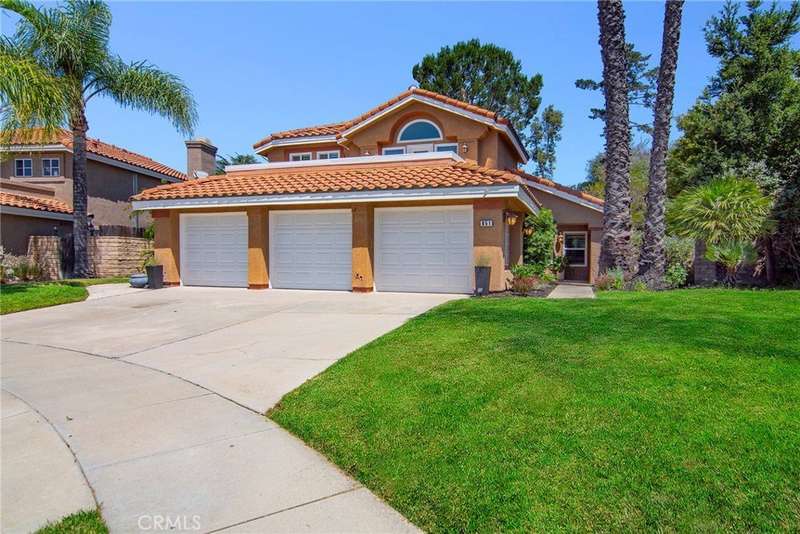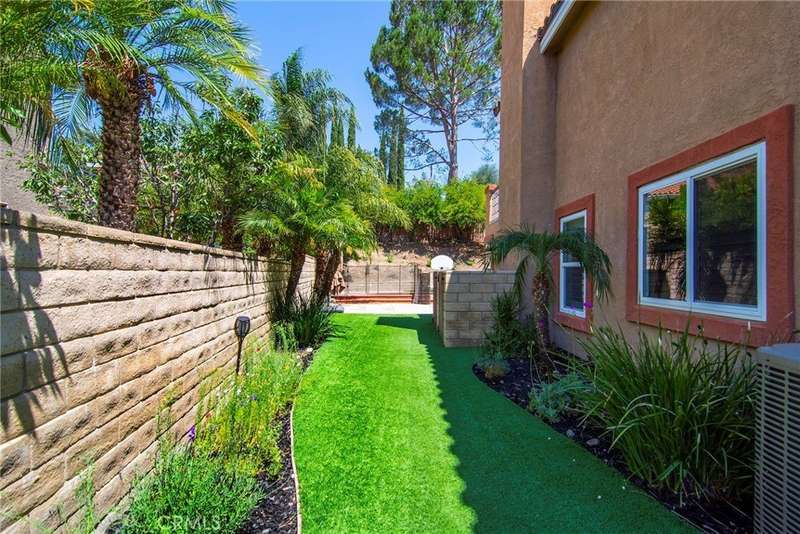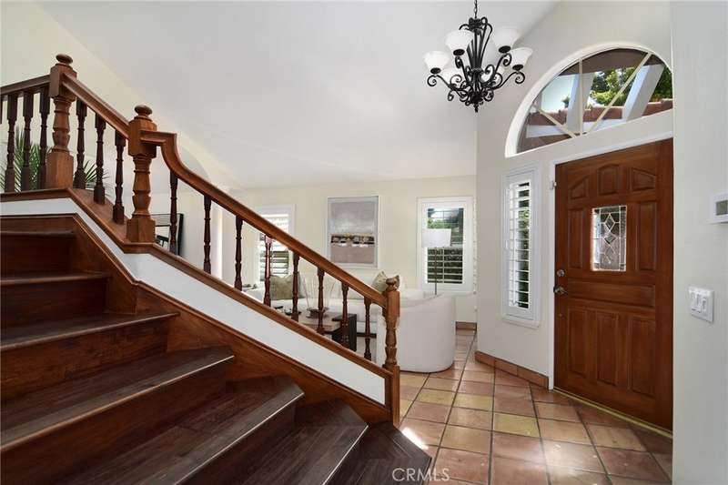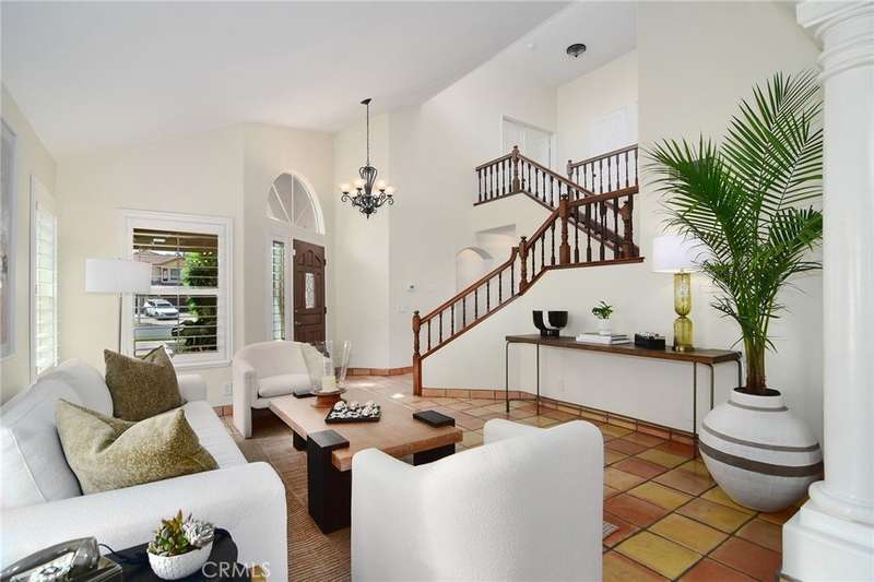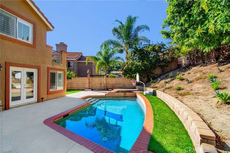 Nestled on a quiet cul-de-sac, this stunning Wood Ranch “Regalia” residence offers soaring ceilings, abundant natural light, and a spacious yet private backyard retreat. Relax by the serene Pebble Tec pool and spa while enjoying the diverse wildlife that call the hillside trees and shrubs home. Inside, you’ll find a rare main-floor multi-purpose bonus room with vaulted ceilings, a wall of built-in cabinetry, a bar sink, and two sets of double doors opening to both the formal dining room and the pool area—perfect as a home office, artist studio, gym, guest suite, or cabana bar. The upgraded kitchen features slab granite countertops, stainless steel appliances (including refrigerator and a back-saving double-drawer dishwasher), breakfast bar, and an oversized walk-in pantry. The downstairs bedroom—currently used as an office—offers soundproofed walls, double French doors, beautiful Acacia wood floors, and built-ins. A full shower bath is conveniently located nearby, along with a laundry room (washer and dryer included). Upstairs, rich Acacia wood floors flow through the hallway and primary suite, with newer carpet in the secondary bedrooms. The primary suite features a walk-in closet, water closet, double-sink vanity, and new decking off its expansive balcony. A second balcony is shared by one of the secondary bedrooms. Both upstairs baths feature newer wood-look tile, and a whole-house fan with timer adds comfort and efficiency. This home also includes solar, providing significant energy savings year-round, along with a large poolside cabana perfect for entertaining. Move-in ready with neutral paint, plantation shutters, and most windows replaced—this is a rare combination of style, comfort, and resort-style living in Wood Ranch.
