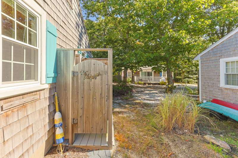 Sweet Starfish Vacation Village, 2 bedroom, free standing condo with an in-ground private, association pool and a short drive to Indian Neck Beach! Renovated in 2019 with 28' gated, sunny deck. New bathroom in 2023, new paint, out-door shower & hot water heater (25). Hard wood floors throughout with a cathedral open living area, ready to move in! Easy Cape Cod living with Birch shaded moss front yard and Hydrangeas.