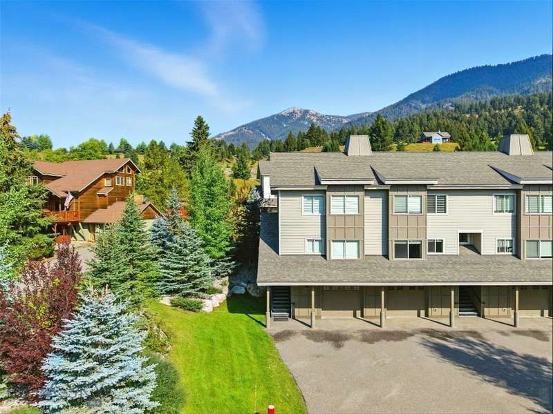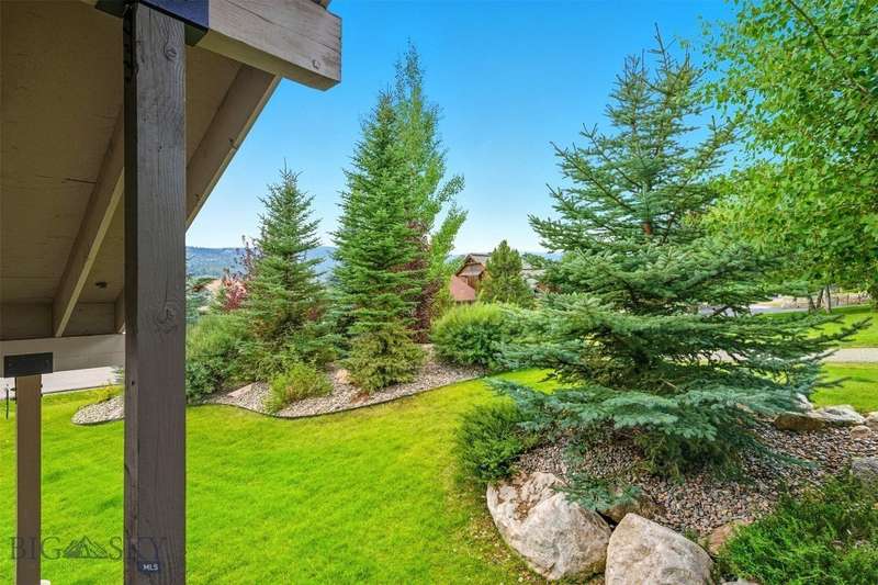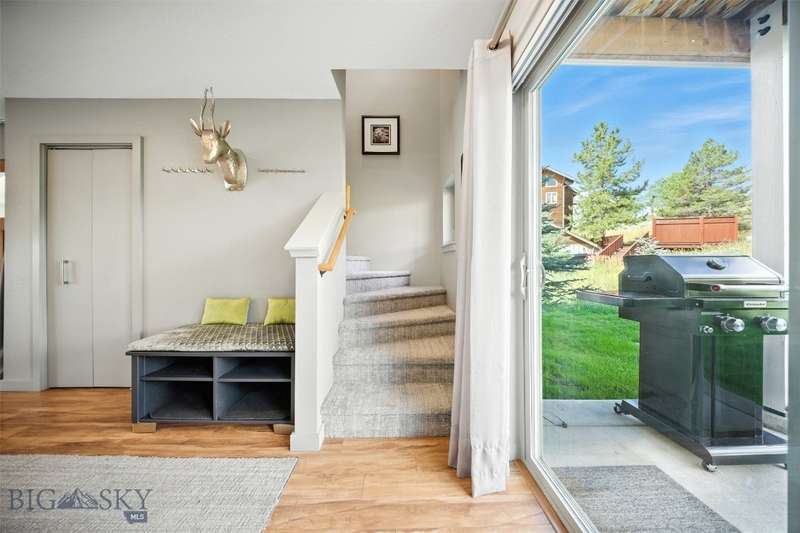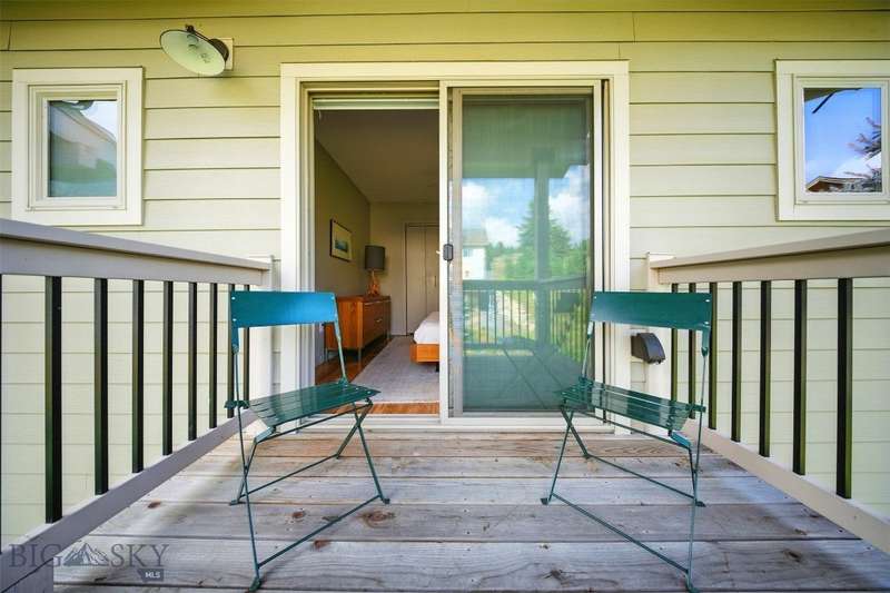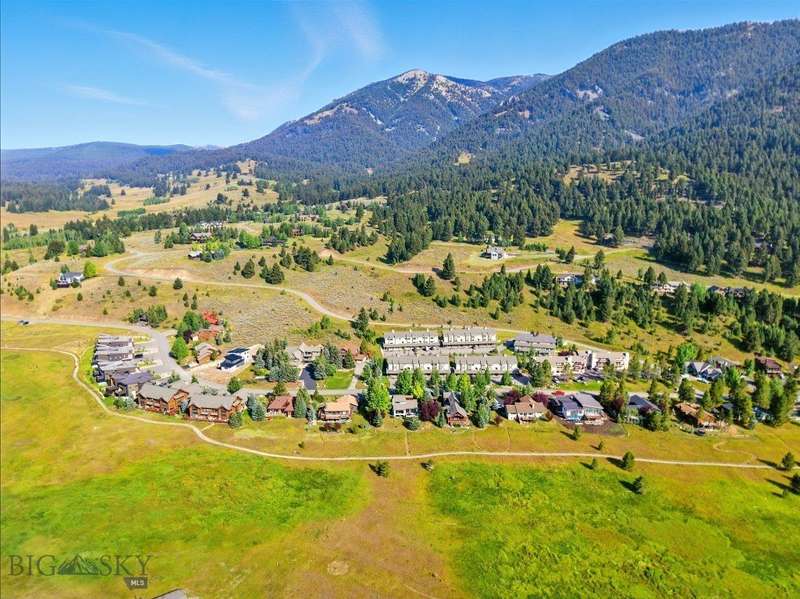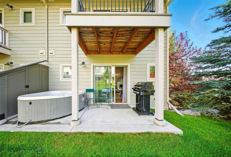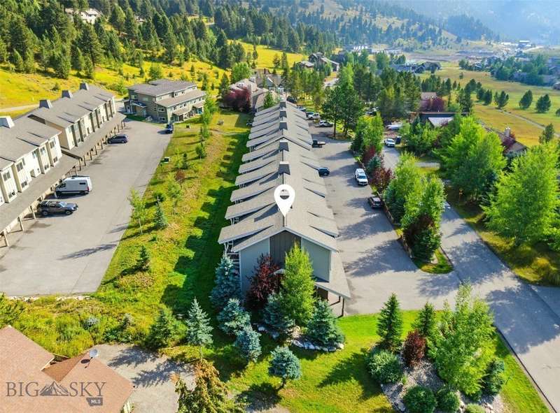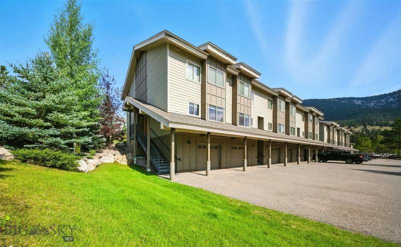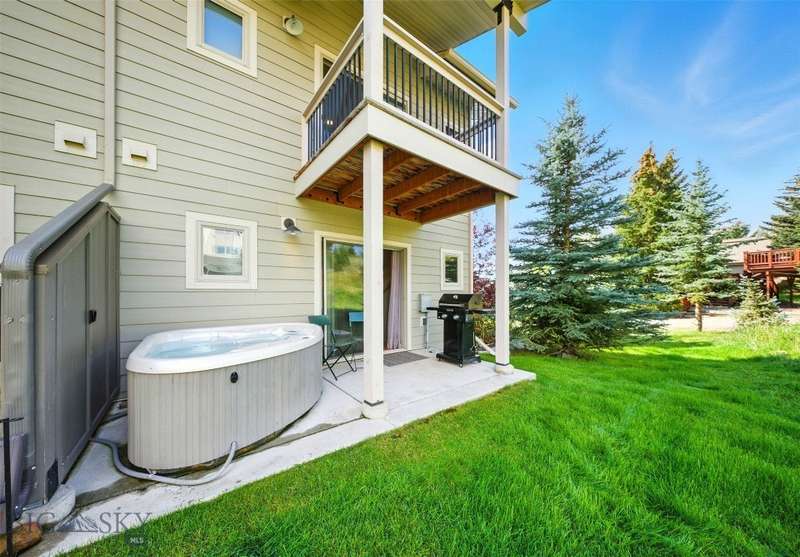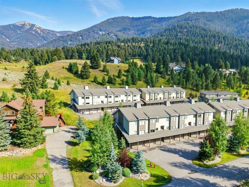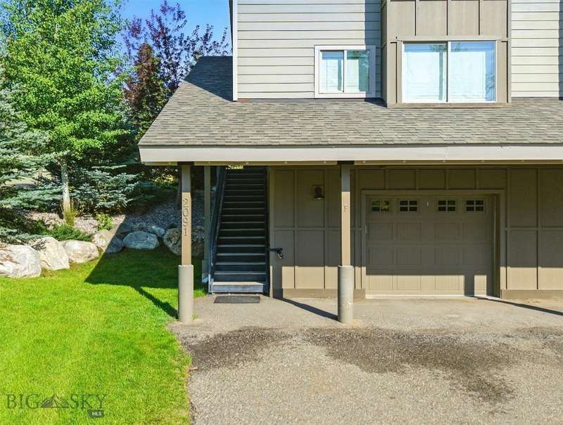 Welcome to this beautifully upgraded 3 bedroom, 2.5 bath Morning Sun condominium in Big Sky's Meadow Village. Perfectly positioned in the front row of the neighborhood, this desirable end unit offers extra privacy with no adjoining unit on one side and sits directly across from trail access to Big Sky's popular Crail Ranch Trail. With 1,348 sq. ft., this condominium combines thoughtful design with high-quality finishes. The residence is being sold fully furnished and features a one-car garage plus a large owner's storage unit. The inviting main living area opens to a private patio with hot tub, ideal for relaxing after a day of adventure. Upstairs, the en-suite primary bedroom includes its own private deck, perfect for enjoying Big Sky's fresh mountain air. The interior showcases many pieces of curated furniture from BoConcepts, a UK-based Danish design brand known for its modern, European aesthetic. The furnishings strike the perfect balance of contemporary style, space efficiency, and high-end craftsmanship, giving the home a refined yet comfortable atmosphere that feels both sleek and welcoming. Additional upgrades include new quartz countertops and cabinetry in the kitchen, upgraded appliances, solid core doors, stylish new light fixtures, and more. Set within a small, quiet complex, this condominium blends convenience, comfort, and sophisticated design in one of Big Sky's most sought-after Meadow Village locations.