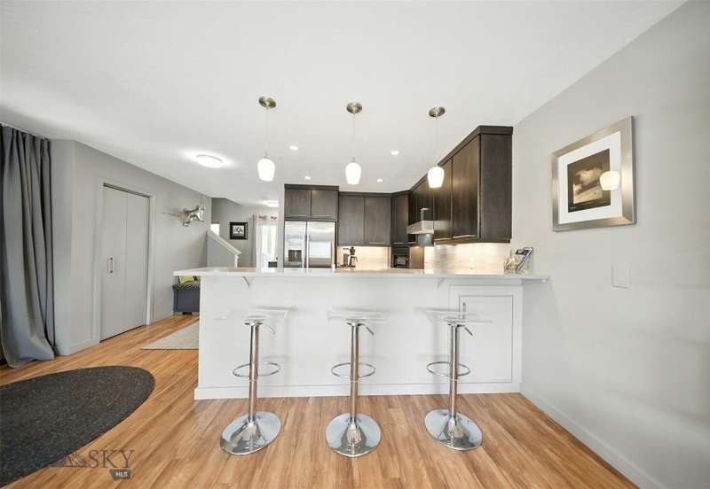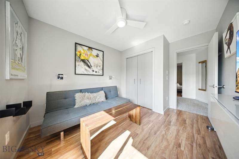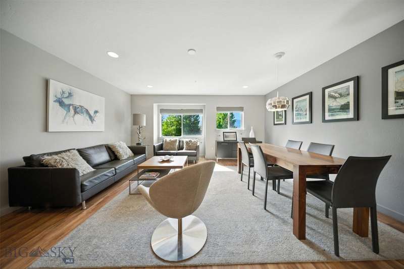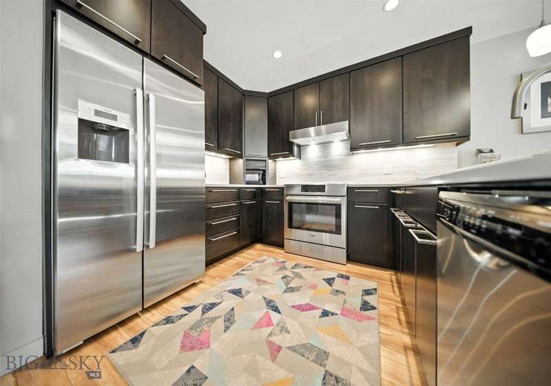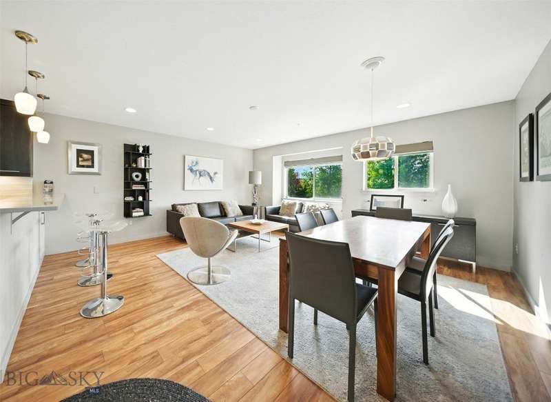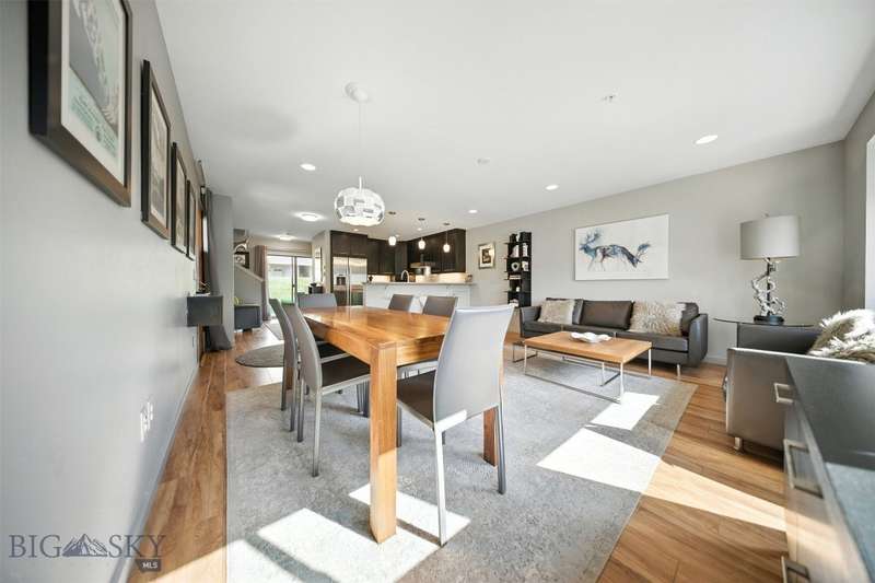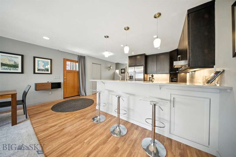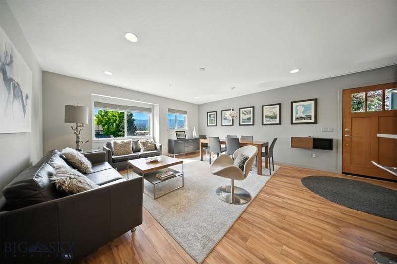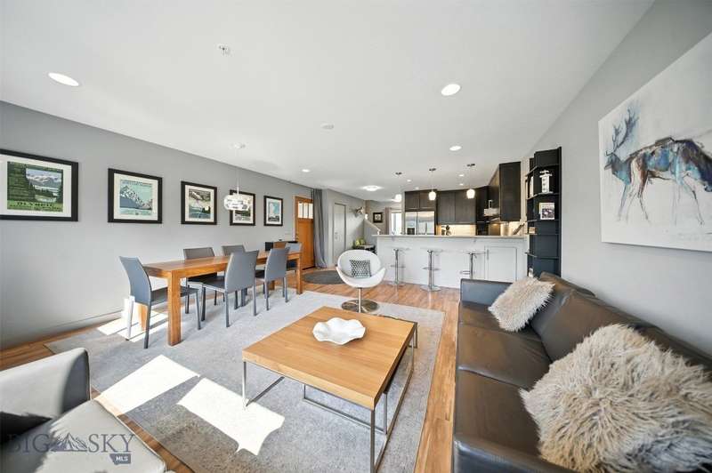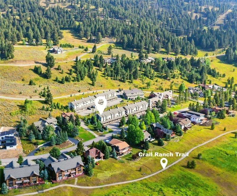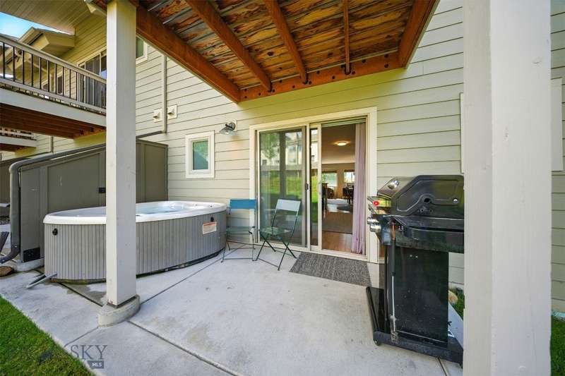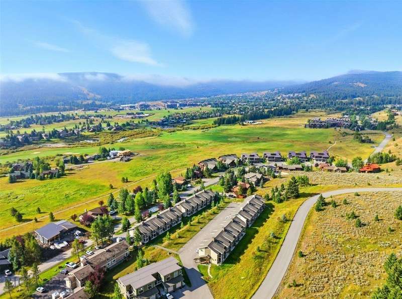 Welcome to this beautifully upgraded 3 bedroom, 2.5 bath Morning Sun condominium in Big Sky's Meadow Village. Perfectly positioned in the front row of the neighborhood, this desirable end unit offers extra privacy with no adjoining unit on one side and sits directly across from trail access to Big Sky's popular Crail Ranch Trail. With 1,348 sq. ft., this condominium combines thoughtful design with high-quality finishes. The residence is being sold fully furnished and features a one-car garage plus a large owner's storage unit. The inviting main living area opens to a private patio with hot tub, ideal for relaxing after a day of adventure. Upstairs, the en-suite primary bedroom includes its own private deck, perfect for enjoying Big Sky's fresh mountain air. The interior showcases many pieces of curated furniture from BoConcepts, a UK-based Danish design brand known for its modern, European aesthetic. The furnishings strike the perfect balance of contemporary style, space efficiency, and high-end craftsmanship, giving the home a refined yet comfortable atmosphere that feels both sleek and welcoming. Additional upgrades include new quartz countertops and cabinetry in the kitchen, upgraded appliances, solid core doors, stylish new light fixtures, and more. Set within a small, quiet complex, this condominium blends convenience, comfort, and sophisticated design in one of Big Sky's most sought-after Meadow Village locations.