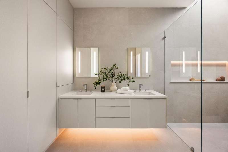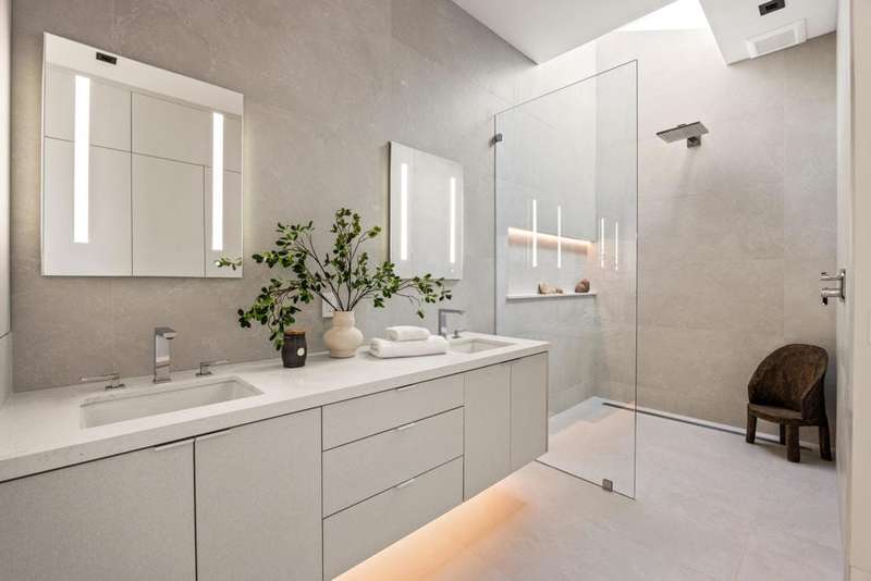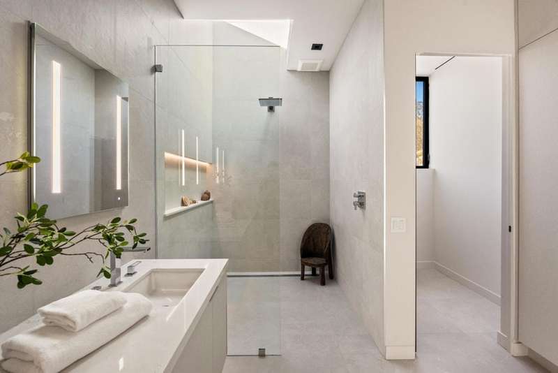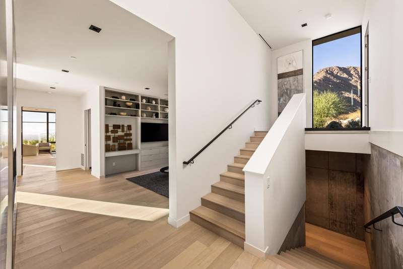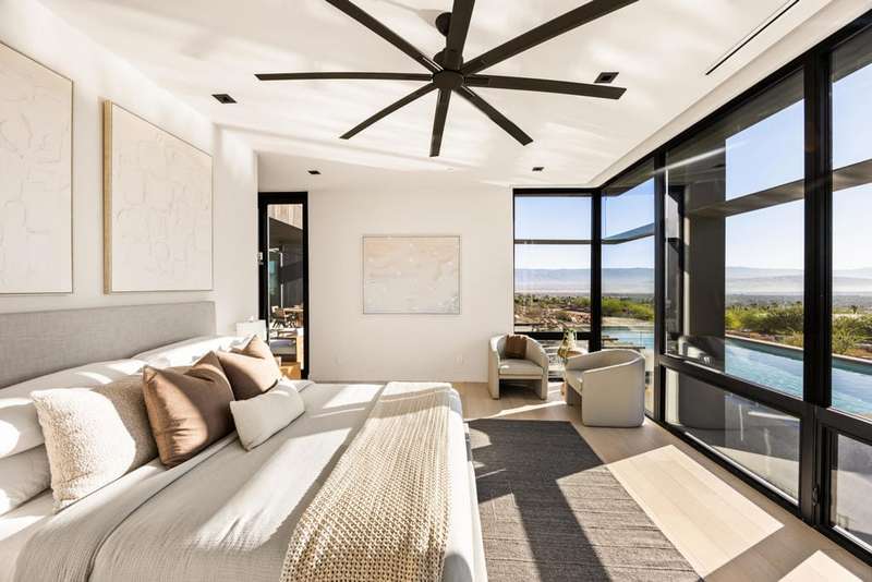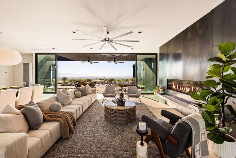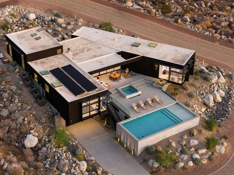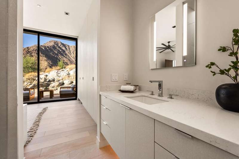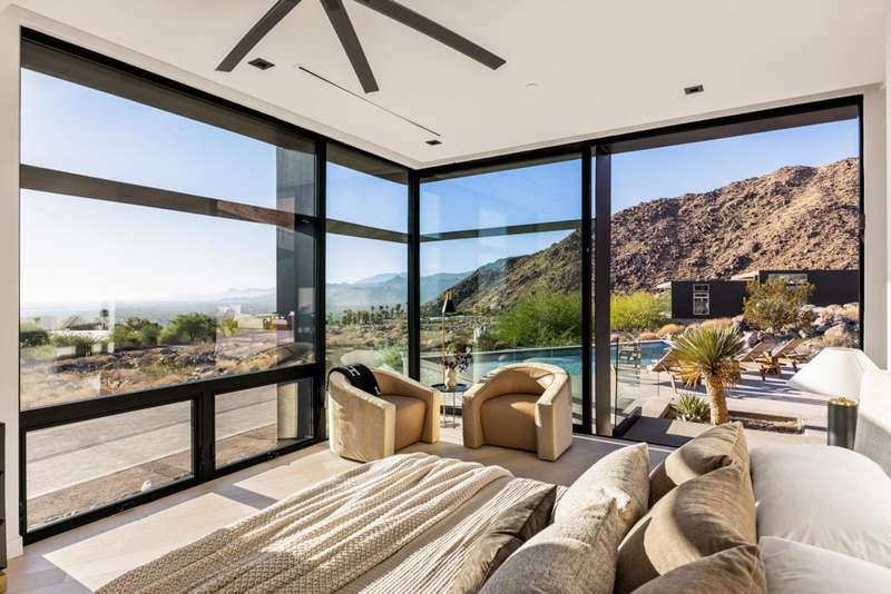 Welcome to the exclusive Desert Palisades enclave in Palm Springs, where world-renowned architects collaborate to create sustainable, cutting-edge homes. Embrace 360-degree mountain views with this newly constructed, architectural gem, surrounded by boulders and nestled in the hills at the base of the San Jacinto Mountains. Nearly 3800 sq.ft. of luxurious living space offering seamless indoor-outdoor living, a spacious open floor plan including living room and dining area, an expansive deck, meticulous landscaping, and a luxurious pool. As you enter the residence, clad in Japanese Sugi Ban wood, you are greeted with phenomenal mountain, desert and city views through floor to ceiling Monumental sliding glass doors and windows. The clear wood oak floors accent the hot rolled steel two-sided fireplace that extends from the living room to the family room/den. The gourmet Chef's kitchen is outfitted with top-of-the-line Miele appliances, two dishwashers, wine refrigerator, Hans Grohe fixtures, Blanco farmhouse-style sink, designer lighting and European-style cabinetry. The primary bedroom suite is an opulent retreat, complete with sliding door access to the outdoor patio, pool & spa, a glass-enclosed shower, luxurious free-standing soaking tub, a hallway of expansive custom closets and its own stackable washer/dryer. There are two lovely, well-appointed guest bedrooms, each with uniquely designed en-suite bathrooms providing their own spectacular mountain and city views. Each bathroom includes beautiful walk-in showers, Robern lighted medicine cabinets, in-wall tank Toto toilets, and ample closet space. Other home features include Eastern European wood interior doors, seven skylights (2 being operable), Kohler bathroom sinks, under cabinet lighting, separate laundry/utility room, 6 state-of-the-art security cameras, owned solar for energy efficiency, 5 HVAC zones and a huge 4-car garage to accommodate both vehicle and storage needs. The expansive outdoor space is an entertainer's dream featuring a built-in firepit and gorgeous custom Pebble-Tec pool with tanning shelf and separate raised spa. The spectacular 360-degree views enhance the beauty and serenity of this home's outdoor living. Surrounded by mountains, this home's design blends seamlessly with the desert landscape, embodying the architectural ethos of the Desert Palisades. Every aspect of this home has been meticulously curated to fashion an exquisite masterpiece of artful living!