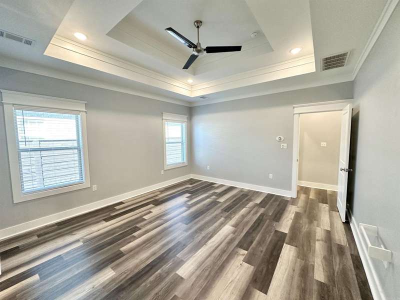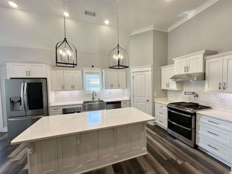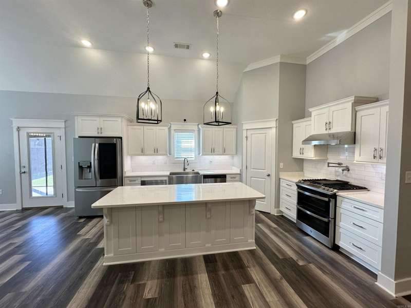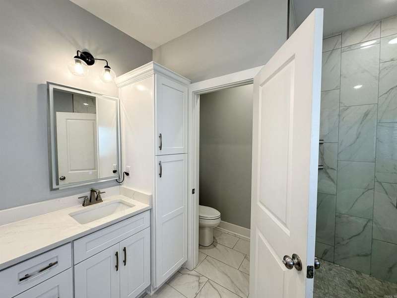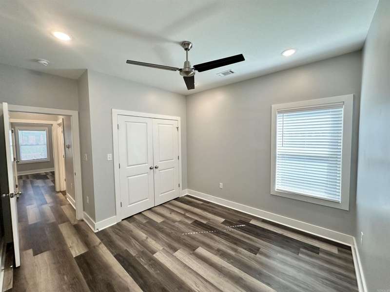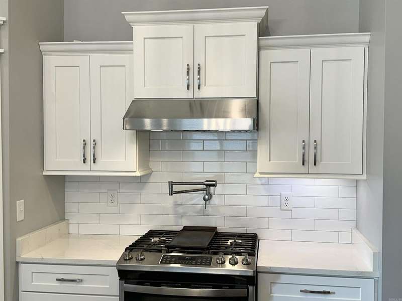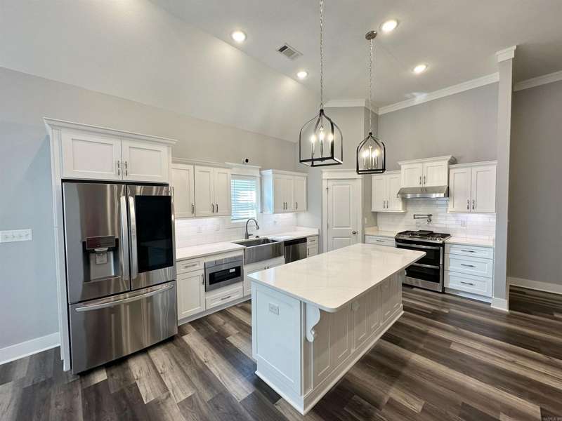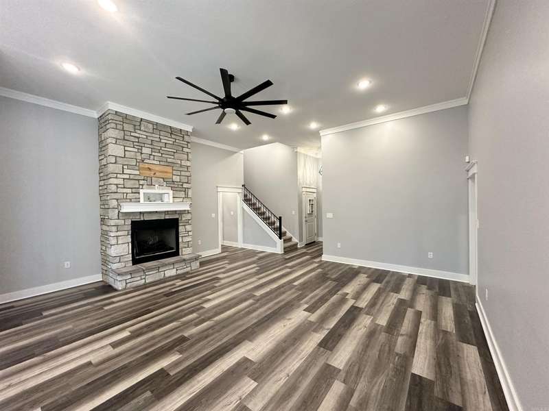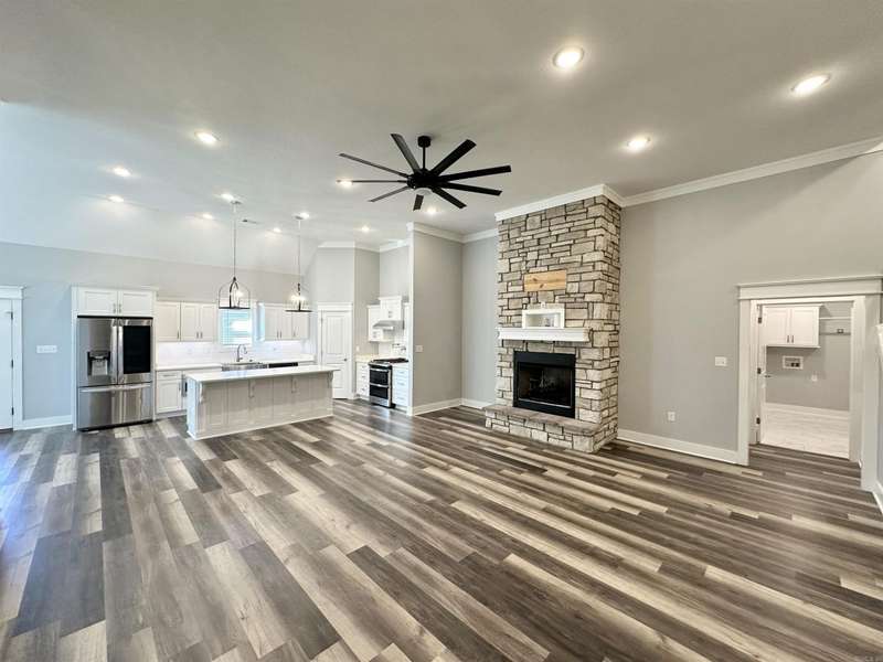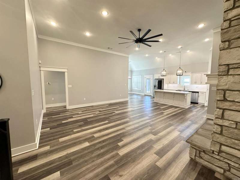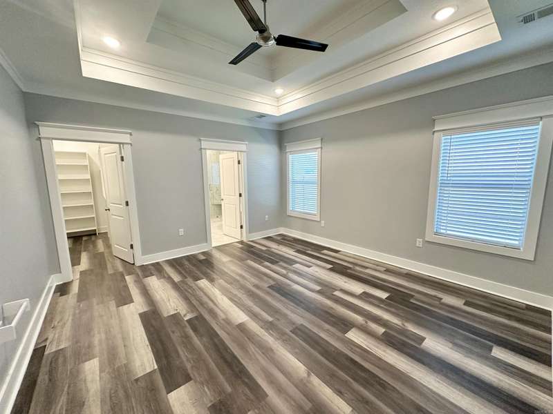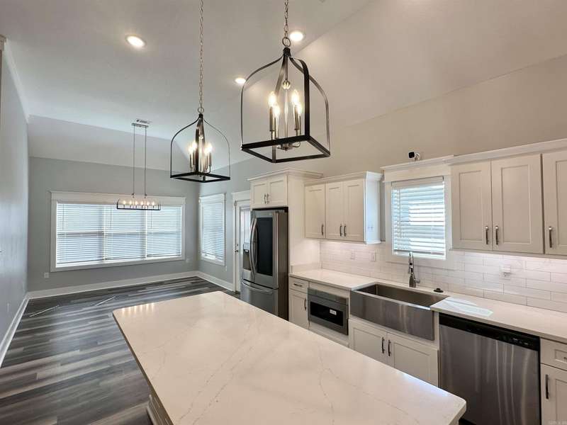 This elegant brick home, constructed in 2022, is situated within the Eden Hills Subdivision of the Brookland School district and falls within the city limits of Jonesboro, benefiting from CWL services. Home has 5 bedrooms & 3 full baths, with 12-foot raised ceilings spanning the great room, kitchen & dining area. Multiple windows surround the dining area, providing abundant natural light. The master suite offers tray ceilings, an en-suite bathroom with double sinks, a soaker tub featuring tile surround, a custom-tiled shower with a glass door & an oversized walk-in closet. Luxury vinyl flooring extends throughout the great room, bedrooms & hallways, while the laundry room, kitchen & bathrooms feature tile flooring, and carpeting is limited to the stairs. Amenities include crown molding, ceiling fans, wood shelving units in all closets, granite countertops in both the kitchen and bathrooms, a tiled backsplash, a tankless water heater, gas log fireplace, screened porch, patio & foam insulation + upgrades: front porch, gas stove/griddle/double oven, pot filler, 3rd bath, 3rd parking, garage & front door, microwave drawer, vent hood, smart mirrors. Horizontal slat fence added 2023