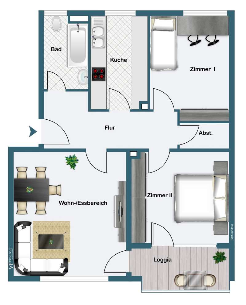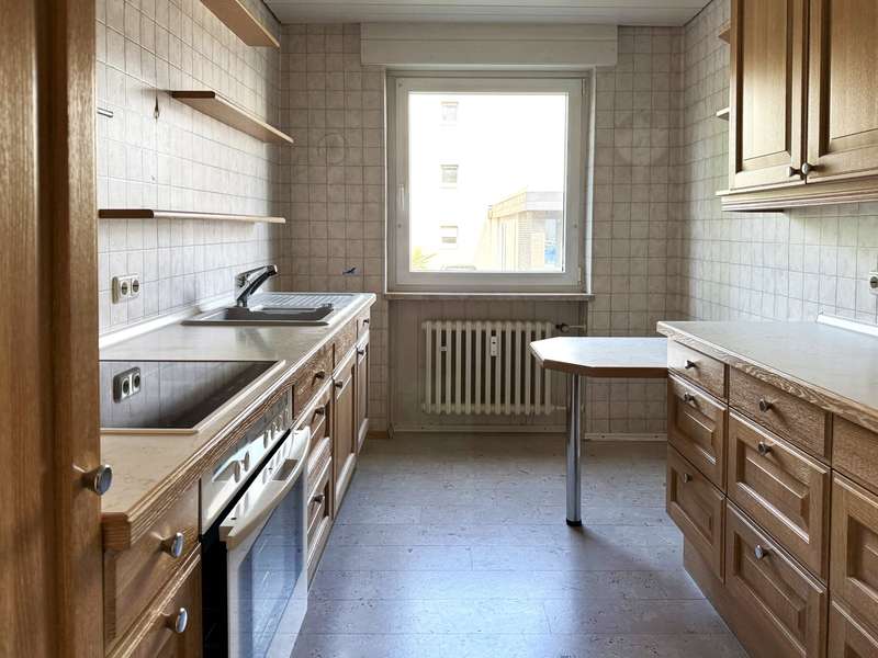 The three-room apartment on the mezzanine floor is part of a residential complex built in 1966 with only 13 residential units. The apartment is located in a quiet side street and close to the Schwanheim city forest. It was last renovated in the mid-90s. The living space is approx. 78 m² and mainly consists of the living room with access to the loggia and the two other rooms. All rooms can be reached from the entrance hallway. The entrance hall, living room and bedrooms have parquet flooring. The daylight bathroom with bathtub is brightly tiled and has light-colored sanitary ware. The kitchen has easy-care linoleum flooring and the fitted kitchen has an integrated washing machine. A storage room has storage space for cleaning materials and necessary utensils. There is a large cellar room in the basement.