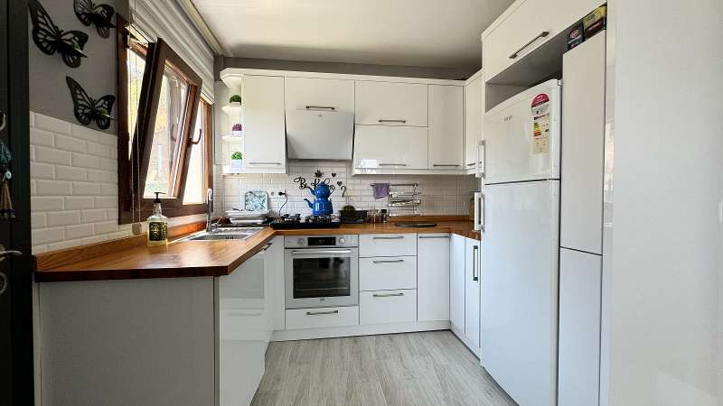 The villa is equipped with double glazing PVC windows, a steel door, ceramic and laminate flooring, veneer ladders with steel materials, high-quality kitchen cabinets, a built-in set, white goods, beds and wardrobes, a TV, a sofa set, lighting products, and a fireplace. This furnished villa is ready to move in.