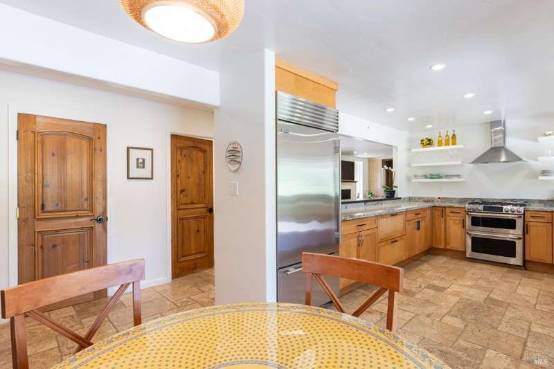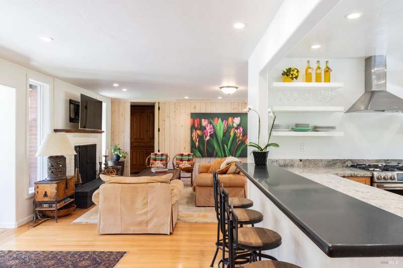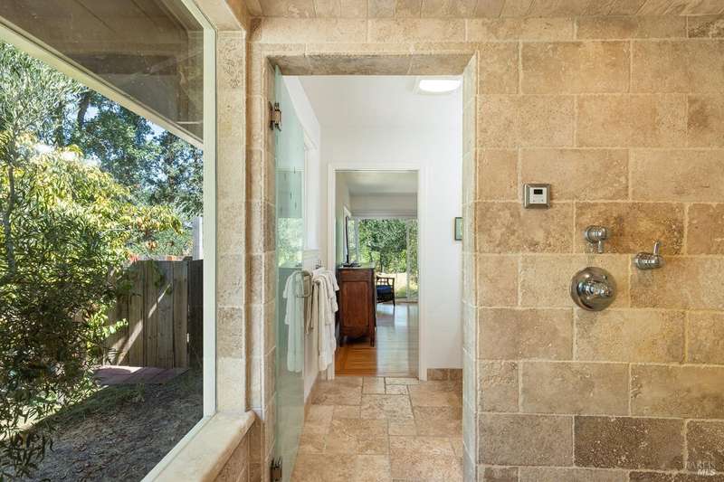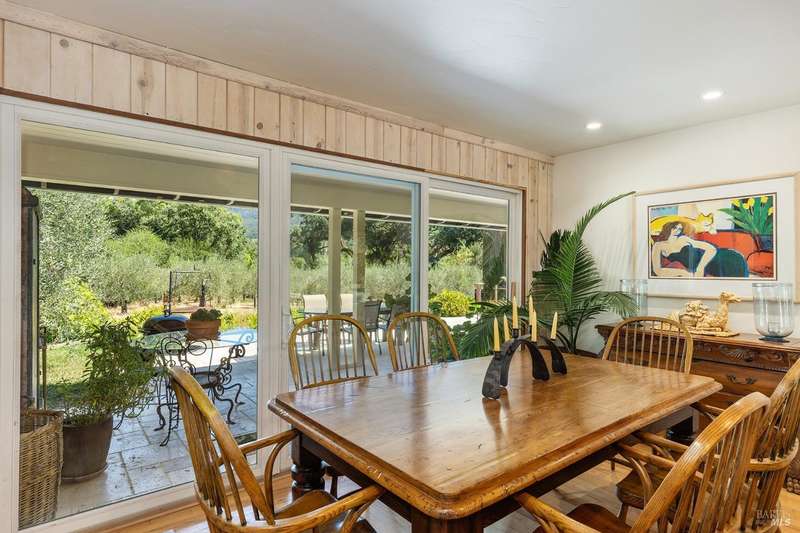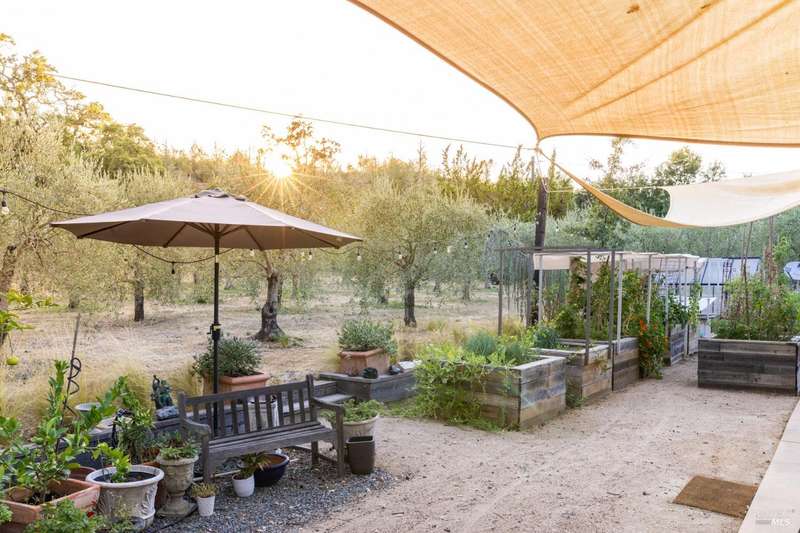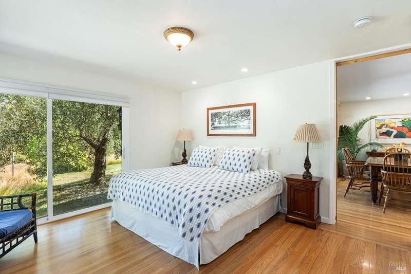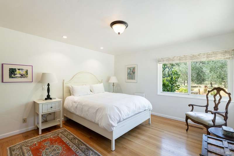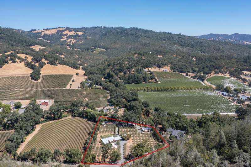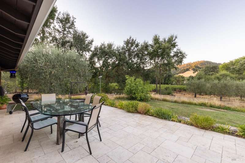 Nestled in a serene landscape featuring over 200 mature olive trees, this updated single level main house plus additional single level 2nd dwelling and additional structures sit on a private 2.57 acre oasis. Just 4 miles from St. Helena and 2.5 miles to stunning Lake Hennessey, this Napa Valley compound exudes charm and tranquility. The main residence includes 2 bedrooms and 2.5 bathrooms within 2,110+/- sf t, offering a spacious and inviting layout. Rustic hardwood and large-format stone floors enhance the interior, while expansive sliding patio doors seamlessly connect indoor and outdoor spaces. The kitchen features a quaint breakfast nook, granite countertops, high-end appliances, bar-top seating, and a large walk-in pantry, making it both functional and stylish. A private flex room with a separate entrance provides flexibility, ideal for a third bedroom, office, craft room, or gym. Step outside to discover a truly special outdoor space, complete with a covered back patio perfect for gatherings. Enjoy breathtaking views of the manicured olive orchard, neighboring vineyards and mountains beyond. Access the charming 910+/- sf guest house and 805+/- sf storage building near the back of the property via a gravel pathway or a separate entrance off Rossi Rd.