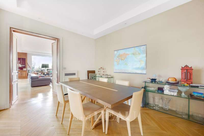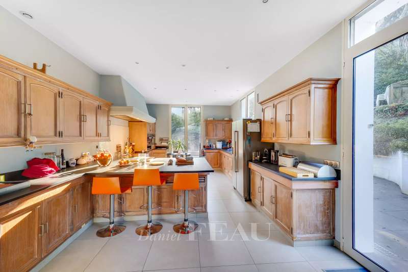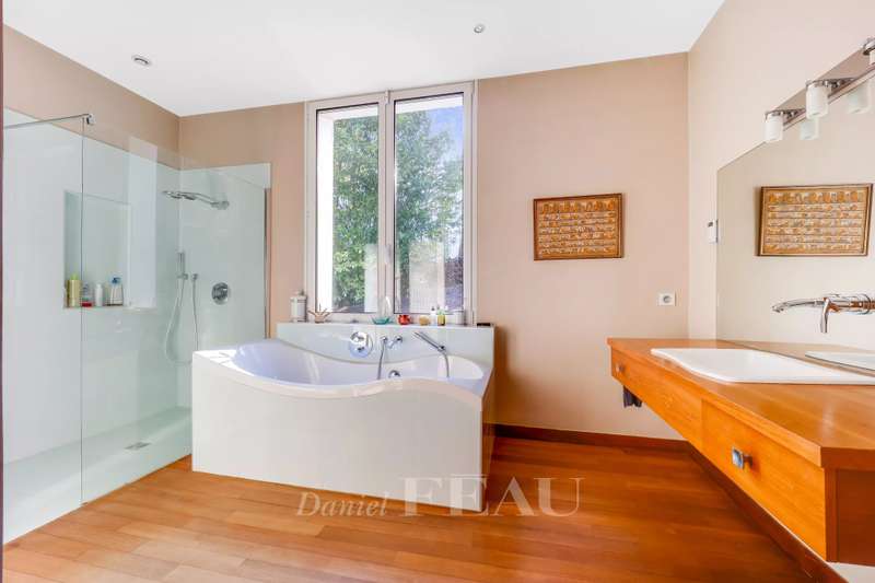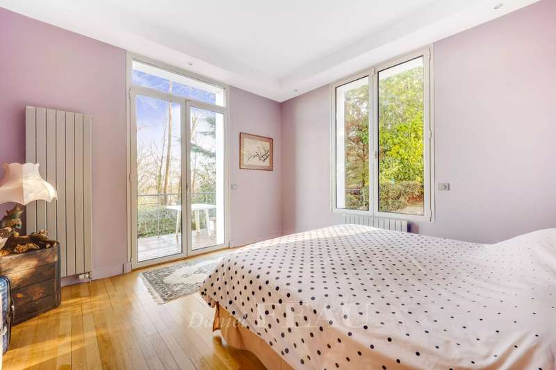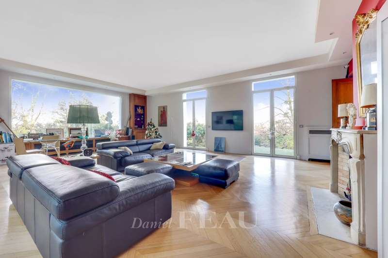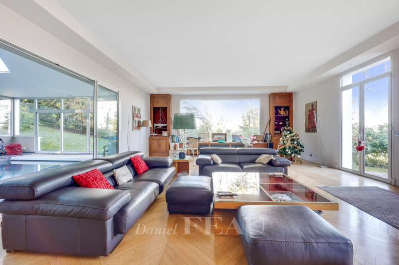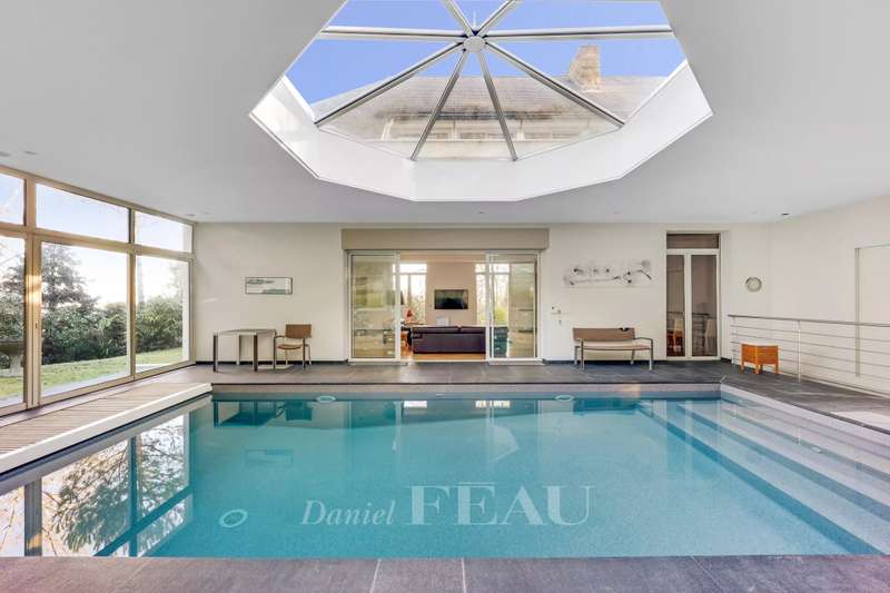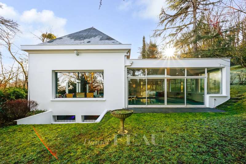 This magnificent 400 sqm mid 20th century property is located on the heights of Port-Marly, between Marly-le-Roi, Louveciennes and Bougival, and a 10-minute drive from Saint-Germain-en-Laye. Hidden from view in 3000 sqm of grounds, it includes an over 60 sqm living/reception room accessing an extensively glazed extension boasting an 8 x 4 metre swimming pool, a dining room, a spacious equipped kitchen with dining facilities opening onto a leafy terrace, a generous suite with a bath/shower room and separate wc, and a bedroom currently used as a study. Upstairs are three bedrooms each with balconies and a bath or shower room with a wc. On a basement with a home cinema/fitness room/recreation room, a shower room and cloakroom accessing the pool, a 4-car garage, a utility room and a boiler room. An ideal family home a 7-minute walk from the international high school, and in walking distance of the shops and the banks of the Seine.
