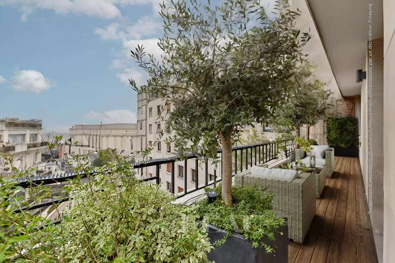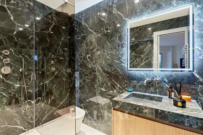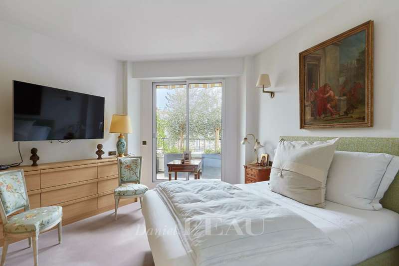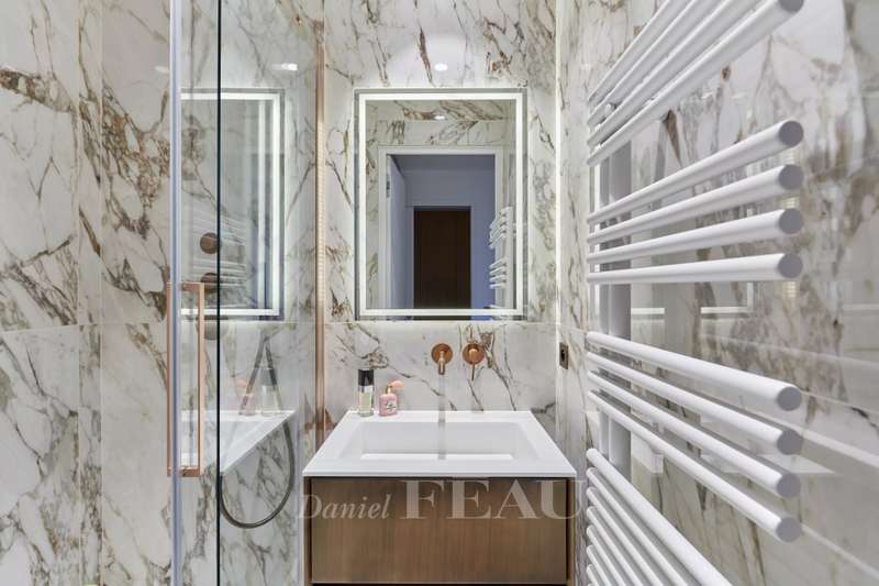 This meticulously renovated apartment as new is on the 7th floor of a prestigious mid 20th century building with a 24/24 caretaker overlooking Place du Trocadero. Bathed in sunshine and opening onto balconies (36 sqm in total), it includes a double living/reception room with an open-plan kitchen, a study area, and two suites with shower rooms. Two parking spaces nearby are available at extra cost.