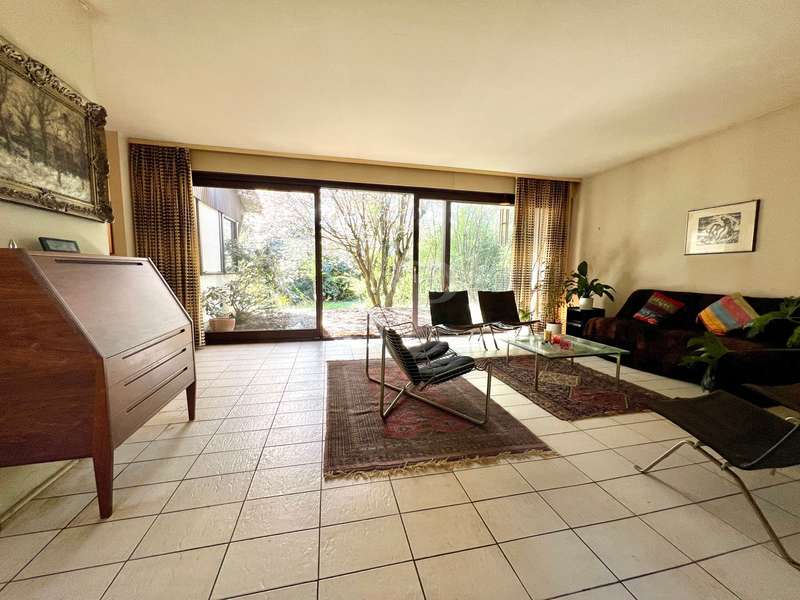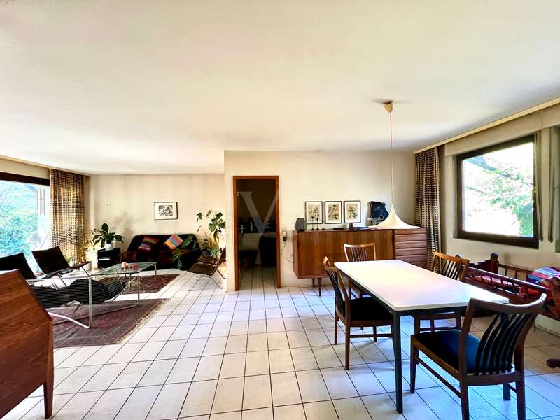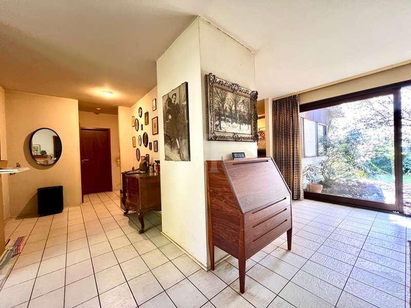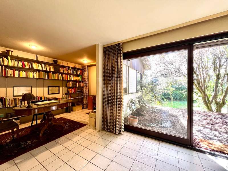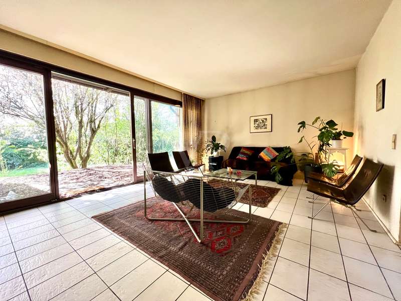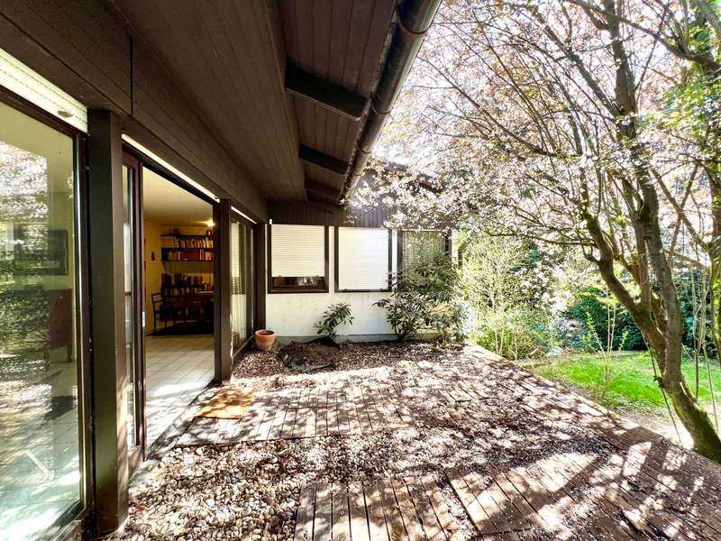 Welcome to your new home! Located in a quiet cul-de-sac, this single-family home built in a bungalow style in timber frame construction is waiting for a young couple or a family who would like to fulfill their dream of living according to their individual ideas! The room concept, conceived in 1978, corresponds to today's ideas and is able to inspire, but the interior requires a complete adaptation to today's zeitgeist. The living and dining area is kept open and has large window elements that provide a view of the garden and access to the sun terrace. A library, which is also open, is pleasant and can be used as a home office area. The kitchen is currently separate, but could easily be integrated into the living and dining area and provides access to the west-facing terrace. The private bedrooms are located in the eastern part of the house, with three bedrooms, a main bathroom and a guest WC in the entrance area providing ample space. The garden level has a living area with two rooms with large windows, and one of the bedrooms has access to the garden. A further room could be converted into a bathroom to create a granny apartment with separate access. Two large cellar rooms offer sufficient storage space. The house has oil condensing heating from 2018. The completely ingrown, sunny garden is a delight and invites you to redesign it. A carport and two parking spaces complete the offer. In summary, the house has a modern room layout and can be transformed into a great family home with contemporary materials and smart ideas! We look forward to receiving your inquiry with full details.