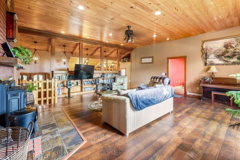 A slice of Vermont. This 4-bedroom, 3-bath home offers the perfect blend of nature, views, acreage with groomed trails for exploring, a scenic pond, and easy accessibility to wherever you want to goincluding nearby Caspian Lake. Set on 20± acres with expansive mountain views, this property is ideal for those seeking space to roam, relax, and reconnect with nature. A major renovation in 2008 and a spacious addition in 2014 have elevated this home, which now features a variety of hardwood and Vermont slate flooring, new windows, cedar ceilings, hickory cabinets, and high-speed internet. The open kitchen and dining area create a warm and inviting space for conversation while meals are prepared and enjoy excellent separation of space when guests come to stay. Shoot hoops on the indoor basketball court or re-imagine it for something else entirely, such as a dance studio, a venue for musicians to practice or jam, or a home business...the location cant be beat! Gather around the fire pit u