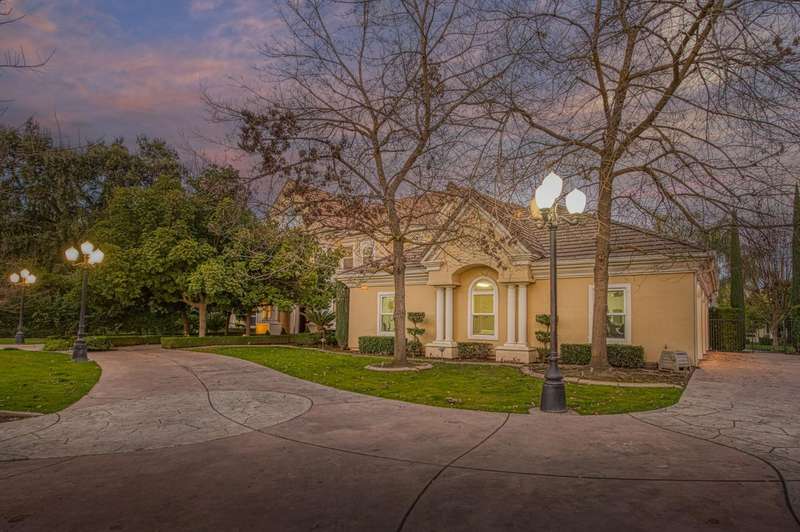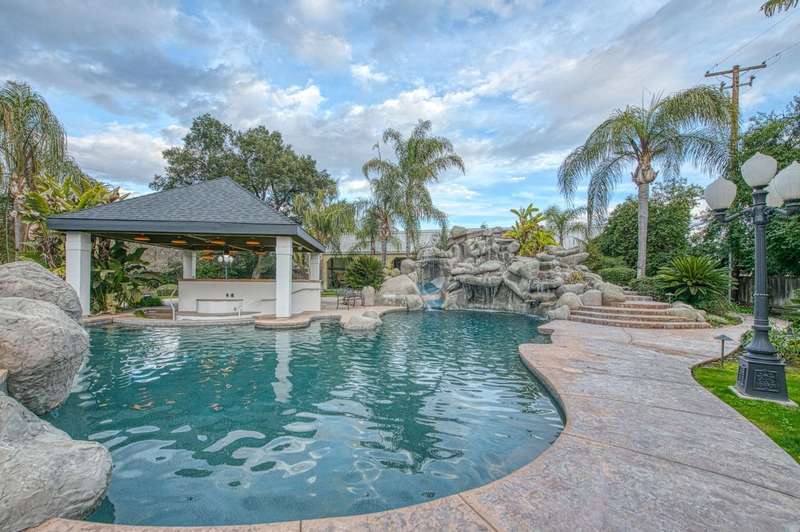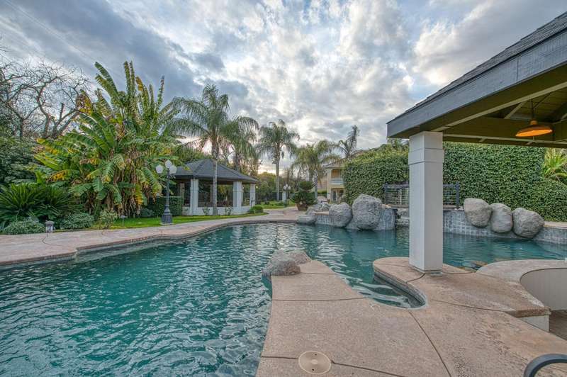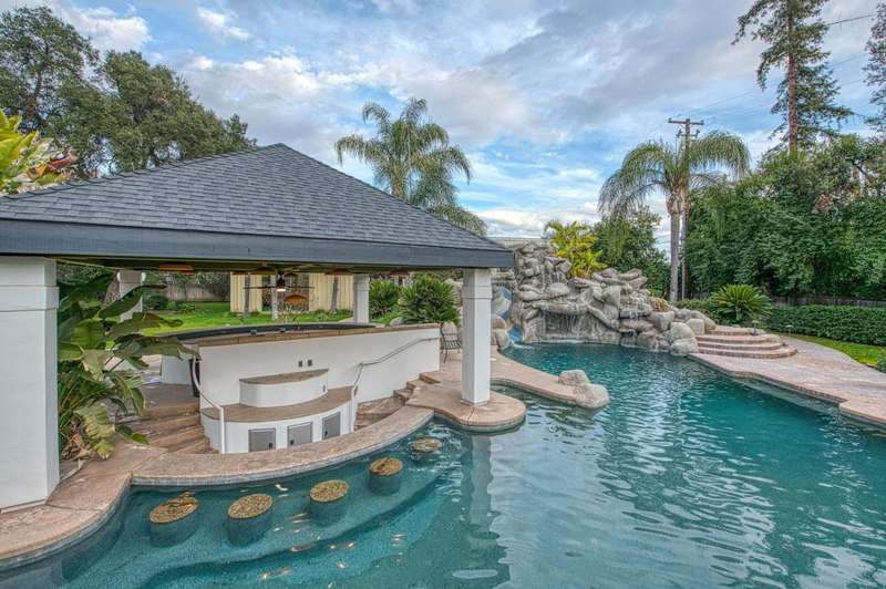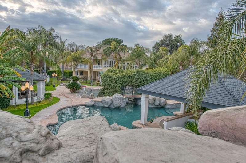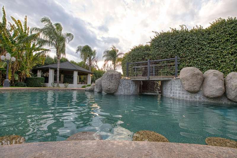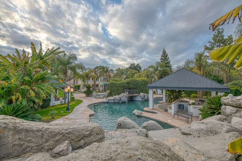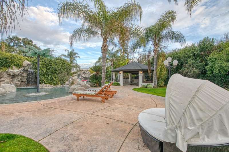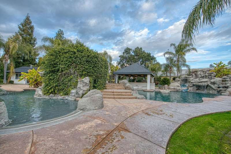 Discover this custom estate in Fresno's prestigious Old Fig Garden; a home that redefines resort-style elegance with every detail crafted for lavish comfort and unforgettable gatherings. Step inside to a grand entrance featuring soaring ceilings, an elegant staircase, and expansive living areas that effortlessly blend formal dining with versatile spaces, including two dedicated offices ideal for work or study.The chef's dream kitchen boasts granite countertops, a sprawling center island, state-of-the-art gas appliances, a generous walk-in pantry, and top-tier Subzero refrigeration with double ovens. Retreat to the master suite, complete with heated bathroom floors, an infinity tub with a serene waterfall, and a secluded outdoor spa, while additional bedrooms offer personalized climate control.Upstairs, a private bar with a poker table and your personal home theater with a balcony overlook the spectacular backyard. Outside, resort-style grounds impress with a dazzling water park featuring a walk-in saltwater pool, grotto lounge, swim-up bar, cascading waterfalls, and water slide, plus custom gazebos with a built-in BBQ and outdoor kitchen. Completing this exceptional property are a professionally appointed barbershop, a spacious 2,700sqft metal building currently serving as a batting cage (with potential for storage or events), and a 450sqft pool house with a bathroom.
