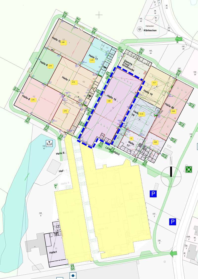 The commercial hall with a height of 3.50 m and a total area of approx. 4,847 m² can be rented and used immediately. Ground-level access to the adjoining part of the hall is available and can also be used. The property can be used for various types of storage and logistics: - Intermediate and buffer storage - Distribution and supply warehouse - Picking and transshipment warehouse - Delivery or distribution warehouse - Procurement warehouse A completely individual use by the tenant can also be prepared in consultation with the landlord and the necessary structural measures can be implemented quickly. Thanks to the comprehensive fire protection refurbishment in 2024, the property has a completely renewed fire protection concept. In addition, a new sprinkler system that meets the highest safety standards was installed and put into operation in all parts of the building. A major plus point is the high load-bearing capacity of the floor. It is specially designed for heavy loads and the use of forklift trucks, making the hall complex suitable for warehousing and production operations. For efficient logistics, the property has several roller shutters per hall section as well as a delivery ramp with its own access road, which facilitates the loading and unloading of trucks. There are also ground-level access roads for smaller delivery vehicles. The generous outdoor areas offer sufficient space for maneuvering trucks as well as for employee and visitor parking spaces. The electrical supply is tailored to industrial requirements with numerous connections, including for heavy current (e.g. 400 V), and thus supports the operation of various machines and systems. Sufficient lighting of the storage areas is ensured by powerful industrial luminaires. The hall is currently designed as a cold hall, as no heating is installed. During an on-site inspection, you can get an exact picture of the condition and possible measures for an individual rental.