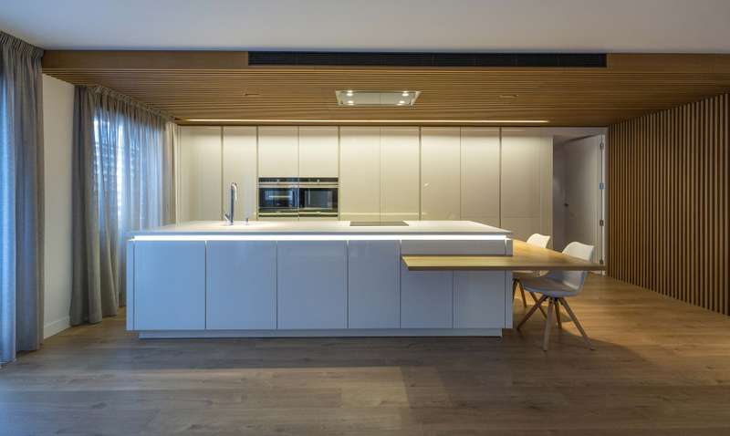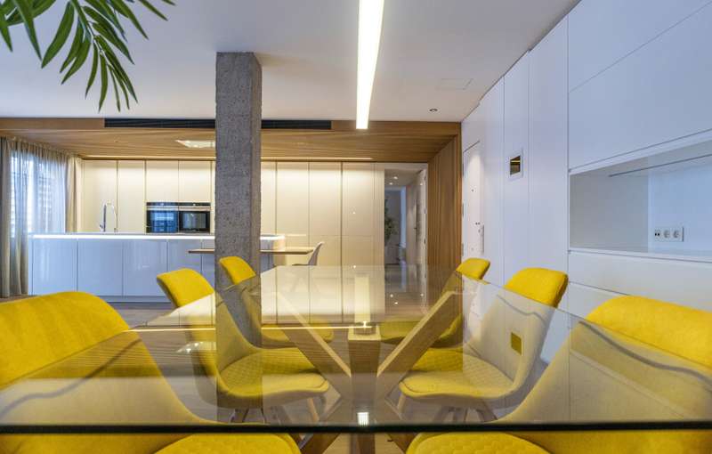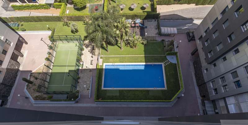 This exclusive apartment, located in one of the areas with the greatest projection of Valencia, stands out for a comprehensive reform where the quality of the materials and the intelligent distribution are combined to offer a functional, elegant and personal home. The interior space has been designed to eliminate unnecessary passage zones and maximize storage, achieving a perfect balance between aesthetics and practicality. The main area, open concept, integrates living room, dining room and kitchen, creating a diaphanous and luminous atmosphere ideal for both day and day entertainment. The kitchen, of high-end and award-winning design, is presented as a central piece of the house. First-brand equipment, Corian countertop without visible joints, natural wood bar and discrete storage solutions reflect an unusual level of detail in similar properties. The carefully illuminated living area with decorative elements of great visual impact incorporates innovative solutions such as a suspended television screen on a mobile structure, which allows you to adapt to different uses of space. In the most private area, the apartment has three versatile rooms — a master with en-suite bathroom and two additional ones currently intended for office and guest bedroom — plus a second full bathroom. A corridor with fitted wardrobes offers extra storage without giving up amplitude or light. One of the most outstanding elements of the property is the large corrido balcony, accessible from almost all rooms. Its design with arches integrated into the facade provides character and space to enjoy the exterior with comfort. The building, modern and well maintained, has common areas including garden, swimming pool, gym and children's area. It has concierge, four lifts and parking space with electric charging point. Located just a short distance from the Turia, the Aqua Mall and the main cultural facilities of the city such as the Science Museum and the Palau de les Arts.