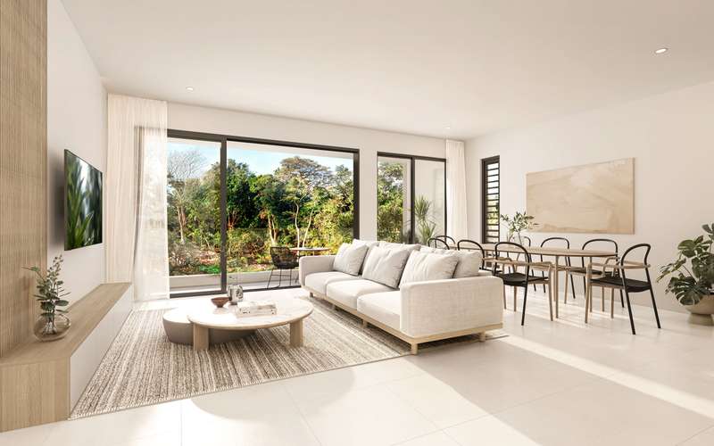 This 2 Bedroom Penthouse of 121 sqm is situated on the third floor The penthouse offers a warm and inviting open plan living and dining area that effortlessly connects you with nature. Bathed in natural light through wide windows and glazed opening, this space offers a serene view of the green mountains beyond. As a future resident of this Smart City, you’ll find convenient shopping just a short walk away from your home, making daily life effortless and enjoyable. Set to open in Q4 of 2025, the Mall with its Food Hall will be a vibrant epicentre where all paths meet, seamlessly blending food, beverage, shopping, and leisure in a beautifully relaxed setting. Designed with nature in mind and well-being at heart, this fully walkable, mixed-use space will embrace the live, work, play principle in a beautifully landscaped setting. The vision is to create a place with lively, energised, people-friendly spaces for residents and visitors to live and thrive. There is nothing that compares to the comfort of home. From the moment you enter Les Rives de Saint Louis, the embrace of greenery and naturally integrated flow of the landscaping leads you past the welcoming feature wall and palm trees down the gentle curves of road to your destination, fostering a true sense of belonging. The site offers dedicated parking spaces sheltered by large canopy trees just outside each of our three apartment blocks. These provide shade and blend into the grand backdrop of mountain views. Along with this, residents also enjoy ocean and rivulet views as well as a city skyline. At Montebello, home is a sanctuary gently embraced by nature. The three blocks, each with 22 apartments, are thoughtfully designed to offer ample privacy, with three sides open to the outdoors, inviting sunlight and lush, unrestricted views. Neighbours are a respectful distance away, creating a sense of living nestled in a quiet park where every day feels like a retreat—peaceful, private, and serene.