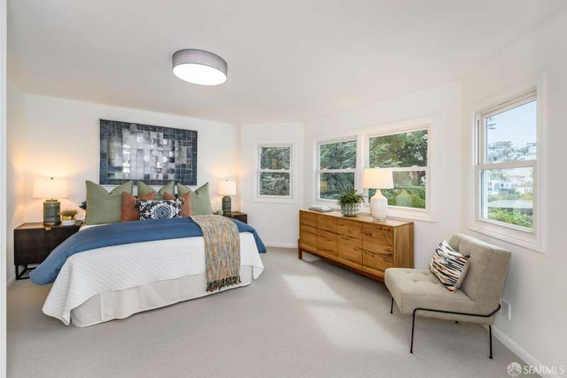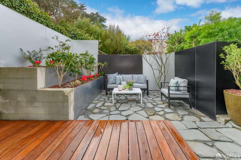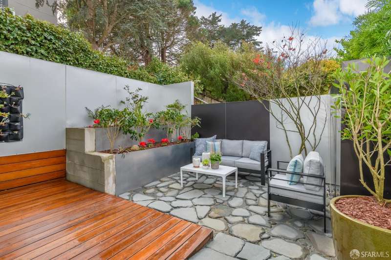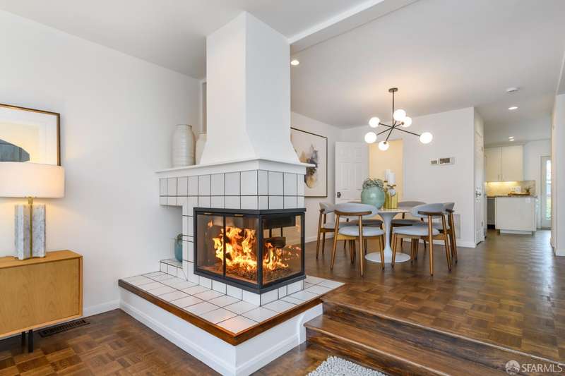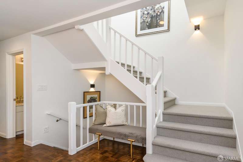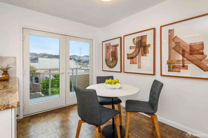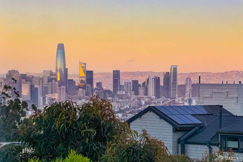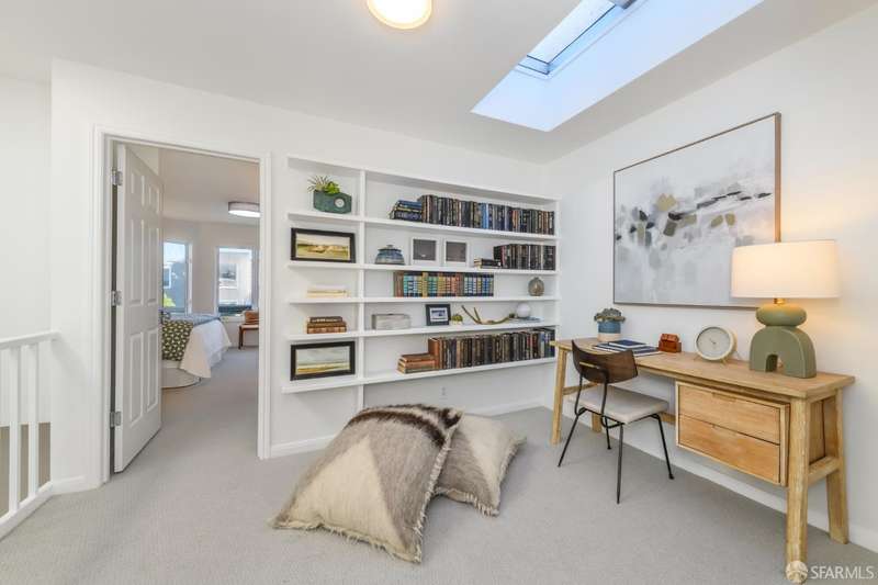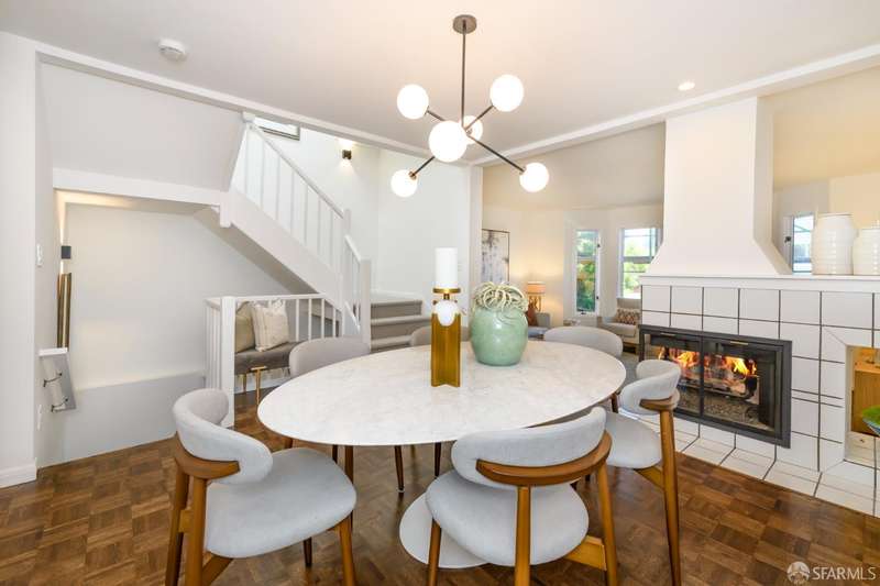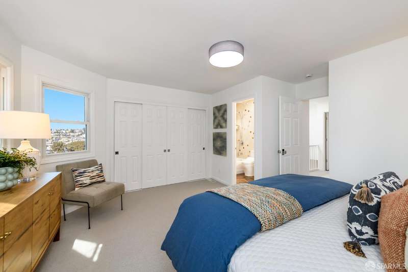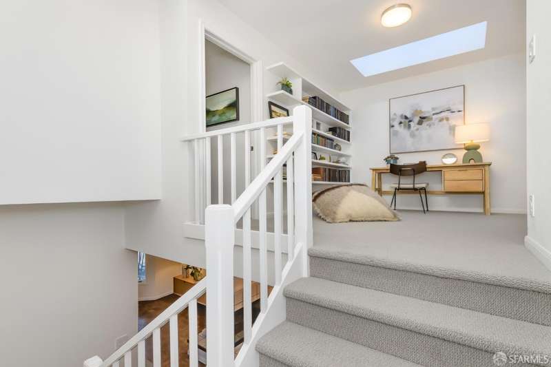 One might think of Castro Street as hilly, noisy, or bustling. Yet one special block in Noe Valley is a well-kept secret: quiet, accessible, level, and uncrowded, with views of the neighborhood and the city, plus easy access to shops, Diamond Heights, parks and schools. This elegant Noe Valley townhouse lives like a single-family home, offering space, privacy, and comfort. Upstairs, two spacious ensuite bedrooms filled with natural light serve as peaceful retreats, separated by a bright loft with skylights ideal as a reading nook, office, or creative space. Enjoy panoramic downtown views to the front, rolling hills and city lights to the rear. The main level features a sunken living room with a gas fireplace, a formal dining room with a bar closet, and a cheerful eat-in kitchen opening to stairs leading to an updated garden with teak decking and stone accents creating a seamless indoor-outdoor connection. The entry level offers a generous foyer, abundant storage, and a two-car tandem garage with laundry and garden access, plus an additional parking space in the driveway. Parking for three cars is a rare convenience that truly sets this home apart in the city. Tucked on a peaceful cul-de-sac, this beautifully updated home is steps from vibrant 24th Street.