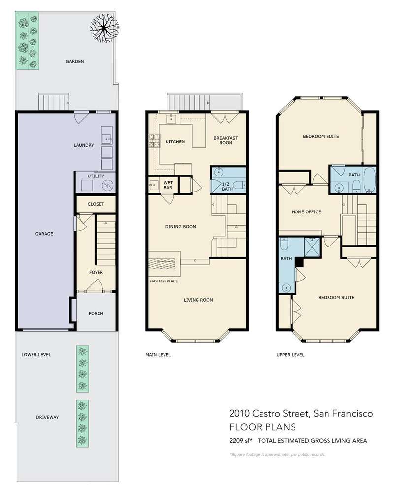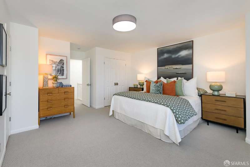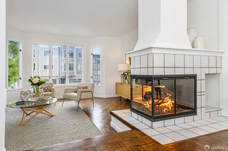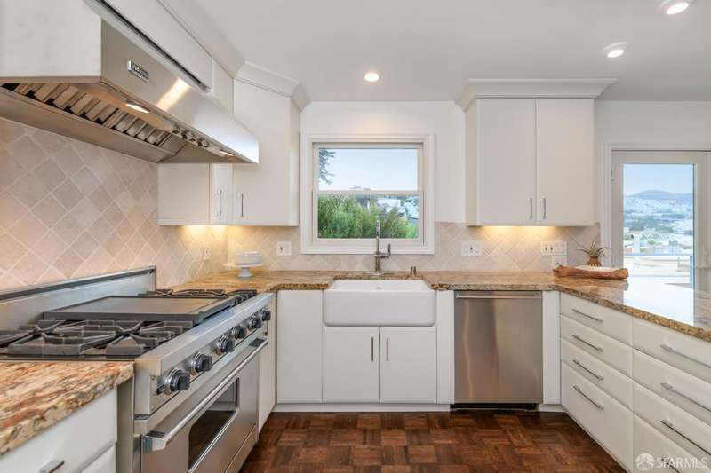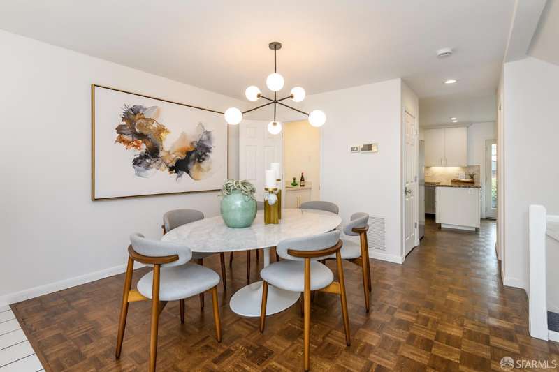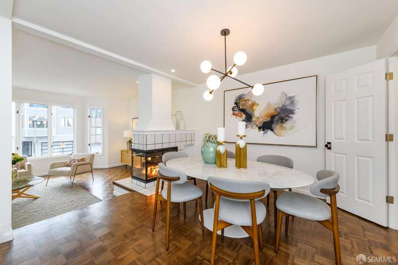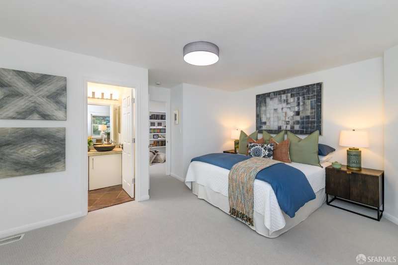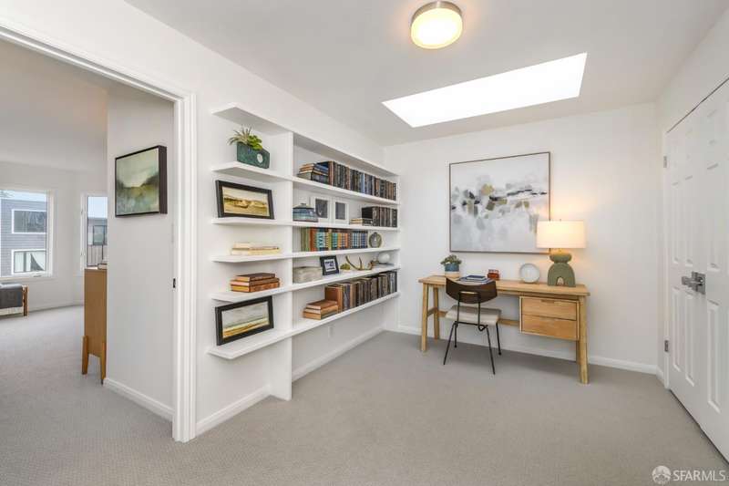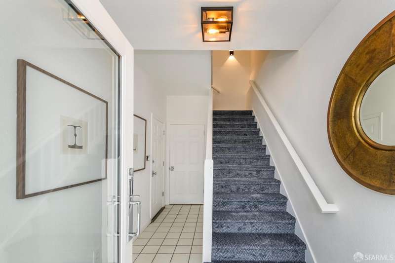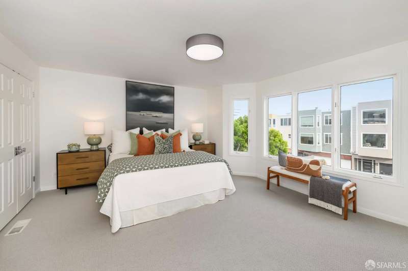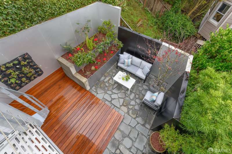 One might think of Castro Street as hilly, noisy, or bustling. Yet one special block in Noe Valley is a well-kept secret: quiet, accessible, level, and uncrowded, with views of the neighborhood and the city, plus easy access to shops, Diamond Heights, parks and schools. This elegant Noe Valley townhouse lives like a single-family home, offering space, privacy, and comfort. Upstairs, two spacious ensuite bedrooms filled with natural light serve as peaceful retreats, separated by a bright loft with skylights ideal as a reading nook, office, or creative space. Enjoy panoramic downtown views to the front, rolling hills and city lights to the rear. The main level features a sunken living room with a gas fireplace, a formal dining room with a bar closet, and a cheerful eat-in kitchen opening to stairs leading to an updated garden with teak decking and stone accents creating a seamless indoor-outdoor connection. The entry level offers a generous foyer, abundant storage, and a two-car tandem garage with laundry and garden access, plus an additional parking space in the driveway. Parking for three cars is a rare convenience that truly sets this home apart in the city. Tucked on a peaceful cul-de-sac, this beautifully updated home is steps from vibrant 24th Street.