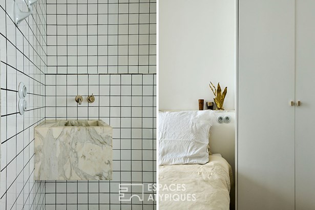 The bedroom, quiet and functional, has custom-made storage and integrates a contemporary bathroom, designed in a refined spirit.
