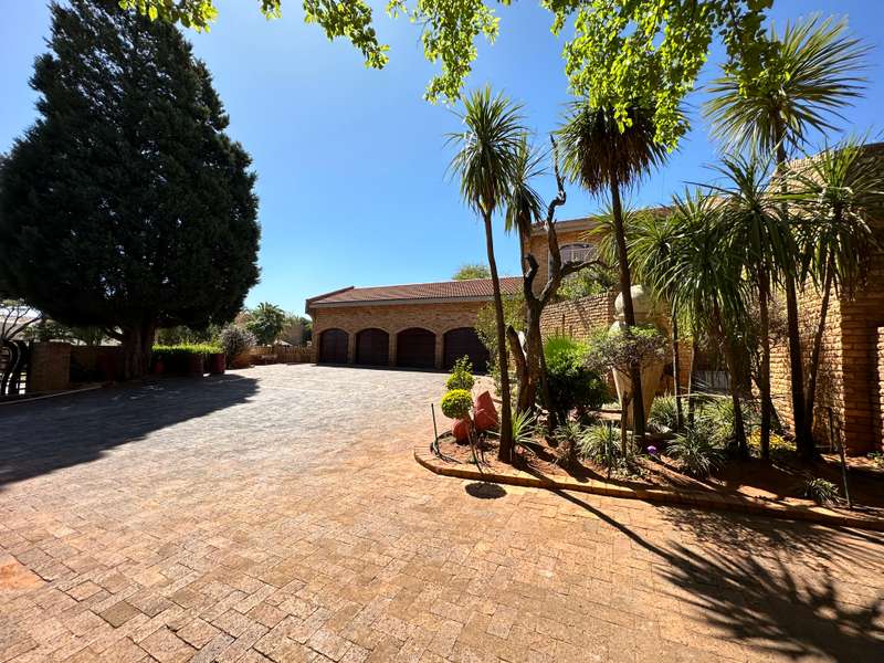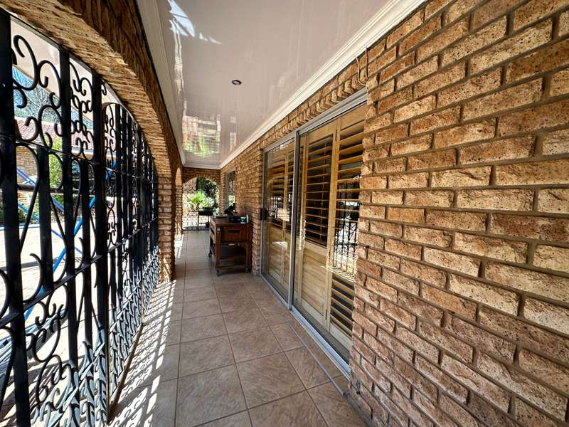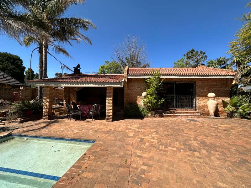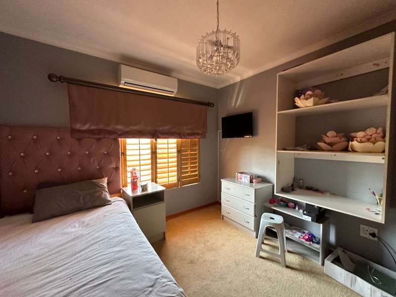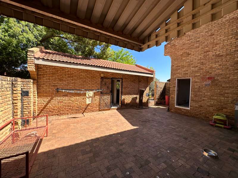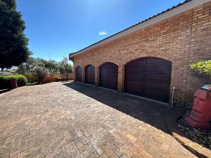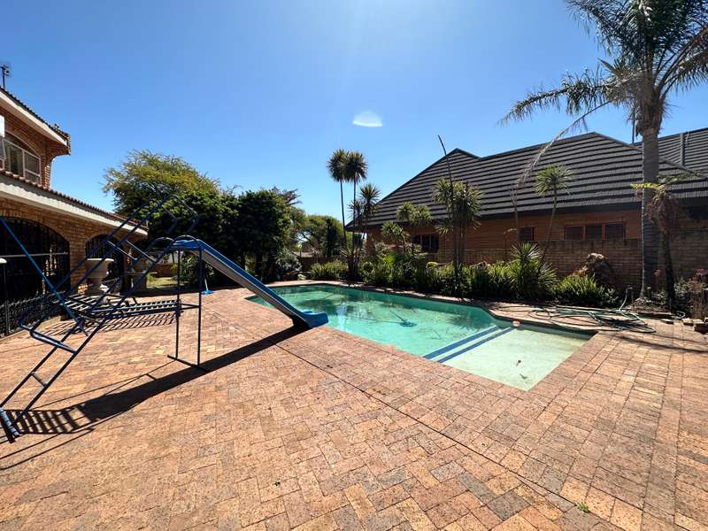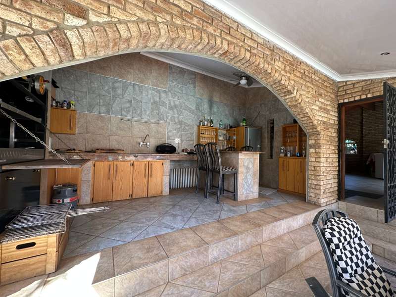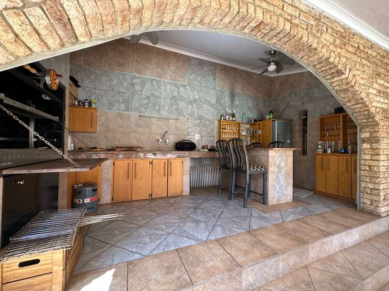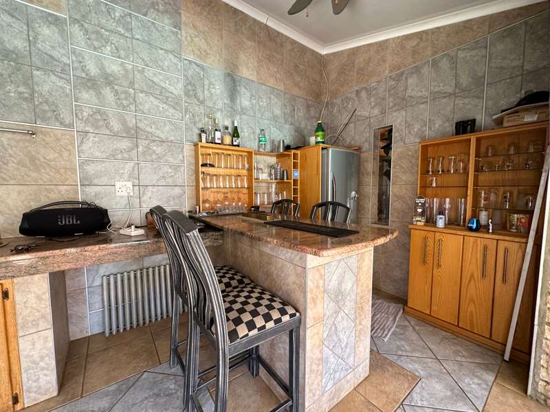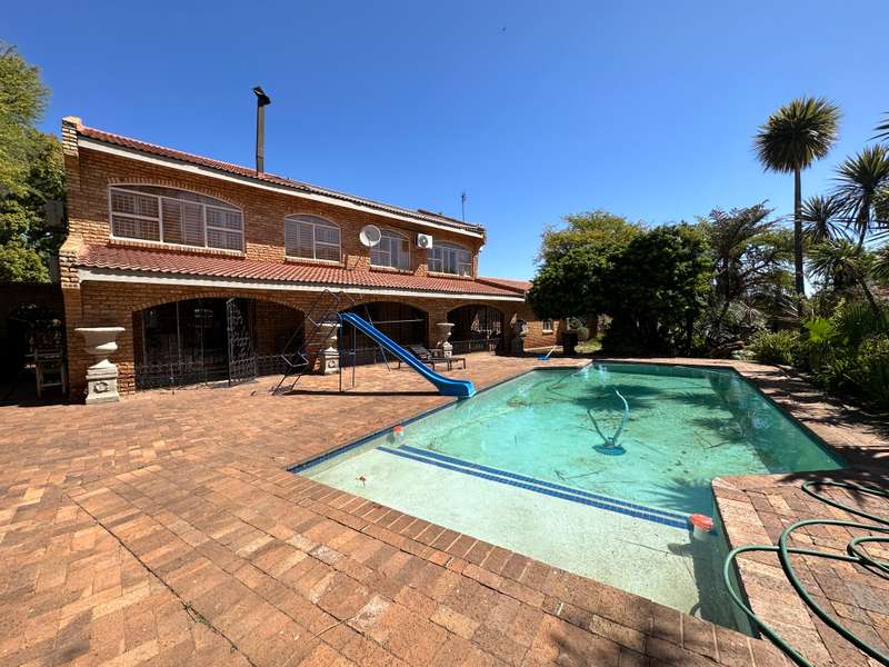 Anything and everything in the right location! Stunning property in one of the most sought-after streets in Klerksdorp. Home itself is a double story, with all living spaces at the ground floor, and the bedrooms and two full bathrooms on the first floor. From the entryway, the home leads you into multiple living areas, to the left is a small study area (with built in desk and cabinetry), right across is the family/entertainment room with sliding doors opening the room onto a well enclosed patio overlooking the pool. To the right of the entryway, the home opens into the formal lounge and kitchen. Kitchen is an absolute dream, dark wooden cabinets with grey granite tops and stained-glass windows. Dining room is on the far side and open floor plan with the main living space. Both these areas open onto the well enclosed patio. Granite staircase leads you up to the four bedrooms, 3 comfortable children’s bedrooms (built in cupboards and air-conditioners) and a main bedroom the size of most one-bedroom flats. Spectacular with the open, centrally placed shower as the definite showpiece. Fireplace and air-conditioner is perfect to set any mood. Entertainment space alongside the swimming pool is the ideal setting for any event. Covered patio at the front with a raised braai and bar area at the back of it. On the side is the indoor entertainment space (could easily be used as a flat), two air conditioners and fireplace and a very spacious bathroom with open air shower. Alongside and attached to the home is four garages, motorized doors, tiled flooring, and ample storage. A doorway via the study area provides easy access. On the other side, across from a courtyard by the kitchen and freestanding from the main home is the laundry, storeroom, and staff quarters. Lockable steel carport is at the side. In the back garden is also a wendy house for additional storage. As added bonus; • 25KVa Generator • Borehole • Underfloor Heating • Pre-paid Electricity Great location, perfectly priced!