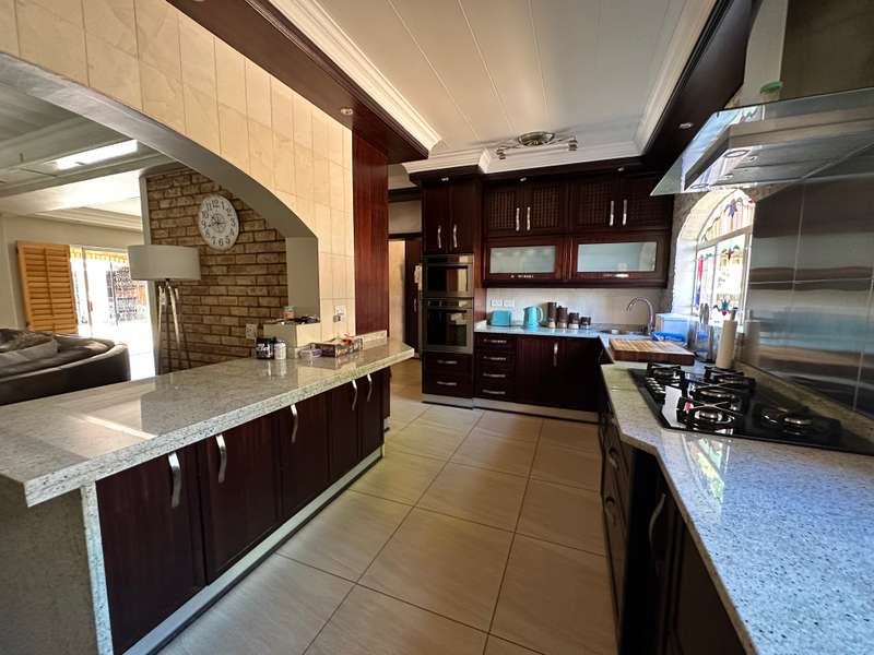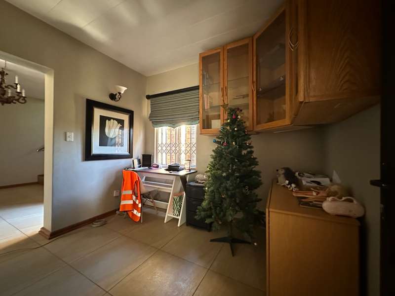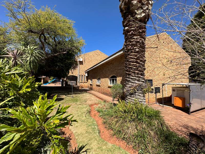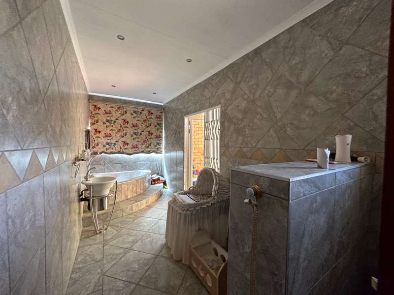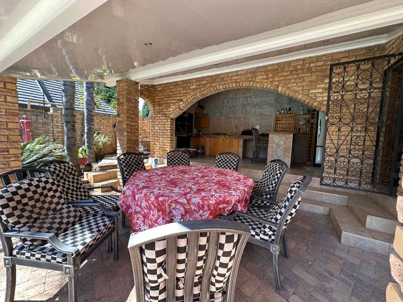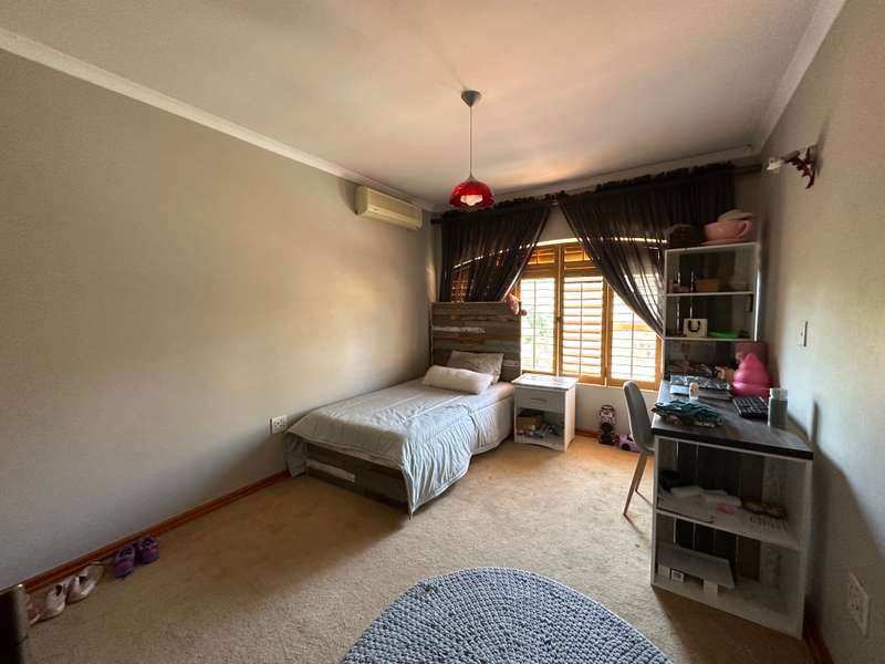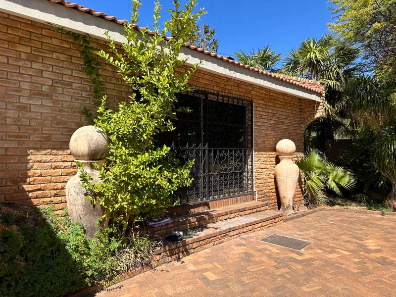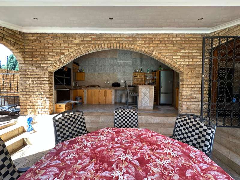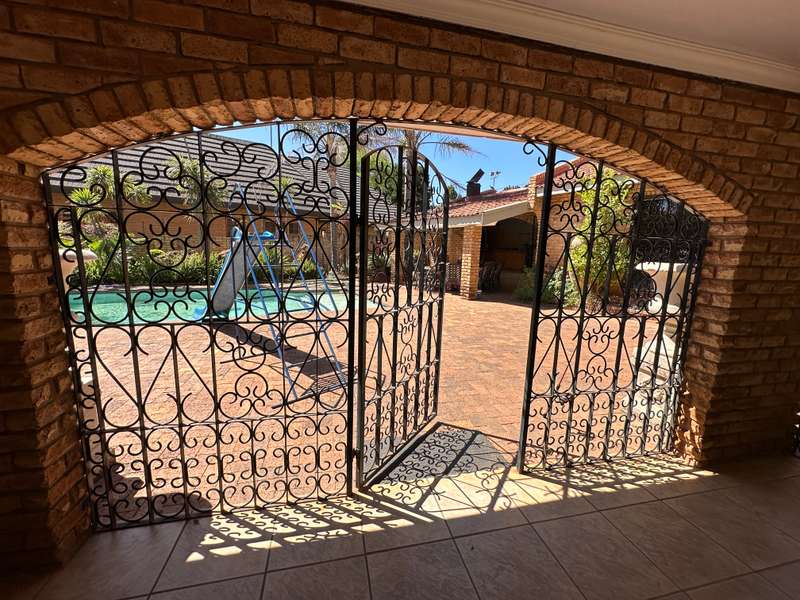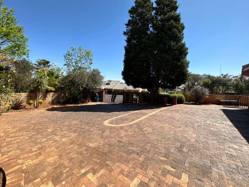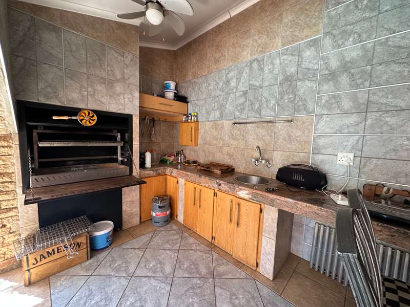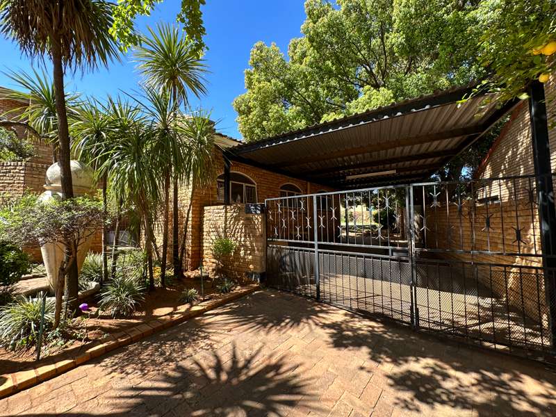 Anything and everything in the right location! Stunning property in one of the most sought-after streets in Klerksdorp. Home itself is a double story, with all living spaces at the ground floor, and the bedrooms and two full bathrooms on the first floor. From the entryway, the home leads you into multiple living areas, to the left is a small study area (with built in desk and cabinetry), right across is the family/entertainment room with sliding doors opening the room onto a well enclosed patio overlooking the pool. To the right of the entryway, the home opens into the formal lounge and kitchen. Kitchen is an absolute dream, dark wooden cabinets with grey granite tops and stained-glass windows. Dining room is on the far side and open floor plan with the main living space. Both these areas open onto the well enclosed patio. Granite staircase leads you up to the four bedrooms, 3 comfortable children’s bedrooms (built in cupboards and air-conditioners) and a main bedroom the size of most one-bedroom flats. Spectacular with the open, centrally placed shower as the definite showpiece. Fireplace and air-conditioner is perfect to set any mood. Entertainment space alongside the swimming pool is the ideal setting for any event. Covered patio at the front with a raised braai and bar area at the back of it. On the side is the indoor entertainment space (could easily be used as a flat), two air conditioners and fireplace and a very spacious bathroom with open air shower. Alongside and attached to the home is four garages, motorized doors, tiled flooring, and ample storage. A doorway via the study area provides easy access. On the other side, across from a courtyard by the kitchen and freestanding from the main home is the laundry, storeroom, and staff quarters. Lockable steel carport is at the side. In the back garden is also a wendy house for additional storage. As added bonus; • 25KVa Generator • Borehole • Underfloor Heating • Pre-paid Electricity Great location, perfectly priced!
