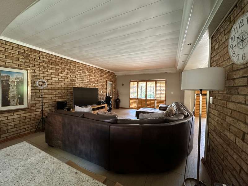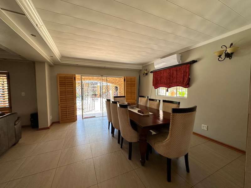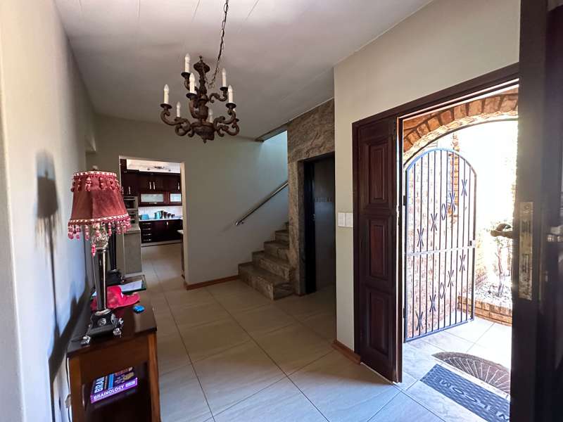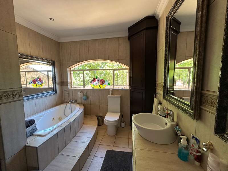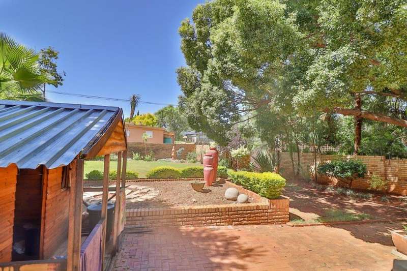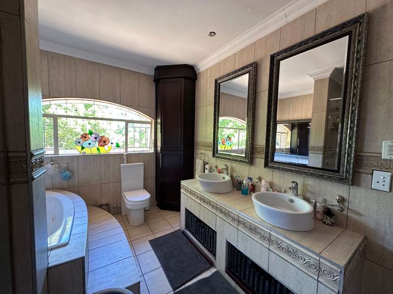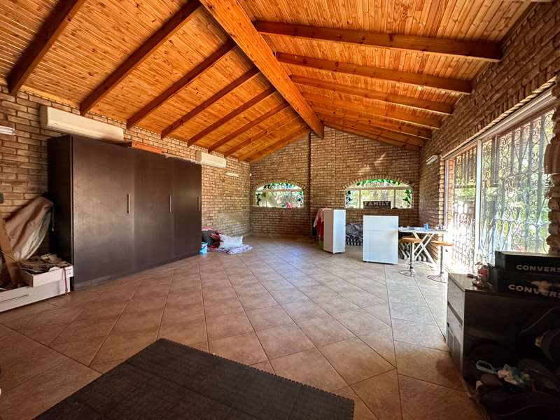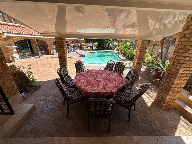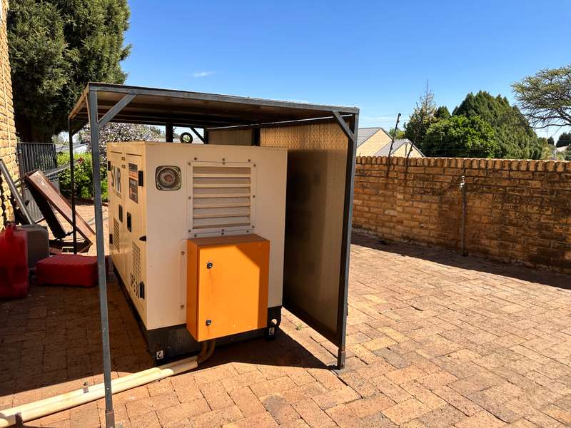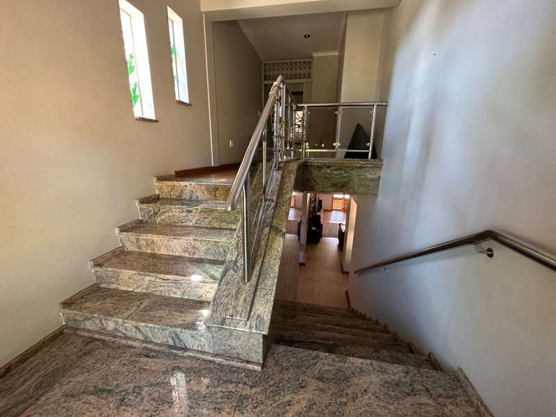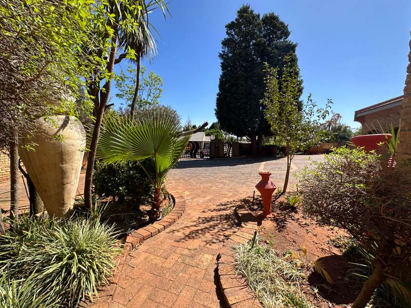 Anything and everything in the right location! Stunning property in one of the most sought-after streets in Klerksdorp. Home itself is a double story, with all living spaces at the ground floor, and the bedrooms and two full bathrooms on the first floor. From the entryway, the home leads you into multiple living areas, to the left is a small study area (with built in desk and cabinetry), right across is the family/entertainment room with sliding doors opening the room onto a well enclosed patio overlooking the pool. To the right of the entryway, the home opens into the formal lounge and kitchen. Kitchen is an absolute dream, dark wooden cabinets with grey granite tops and stained-glass windows. Dining room is on the far side and open floor plan with the main living space. Both these areas open onto the well enclosed patio. Granite staircase leads you up to the four bedrooms, 3 comfortable children’s bedrooms (built in cupboards and air-conditioners) and a main bedroom the size of most one-bedroom flats. Spectacular with the open, centrally placed shower as the definite showpiece. Fireplace and air-conditioner is perfect to set any mood. Entertainment space alongside the swimming pool is the ideal setting for any event. Covered patio at the front with a raised braai and bar area at the back of it. On the side is the indoor entertainment space (could easily be used as a flat), two air conditioners and fireplace and a very spacious bathroom with open air shower. Alongside and attached to the home is four garages, motorized doors, tiled flooring, and ample storage. A doorway via the study area provides easy access. On the other side, across from a courtyard by the kitchen and freestanding from the main home is the laundry, storeroom, and staff quarters. Lockable steel carport is at the side. In the back garden is also a wendy house for additional storage. As added bonus; • 25KVa Generator • Borehole • Underfloor Heating • Pre-paid Electricity Great location, perfectly priced!