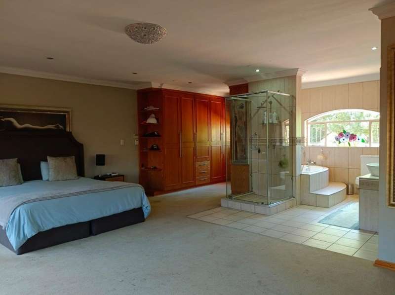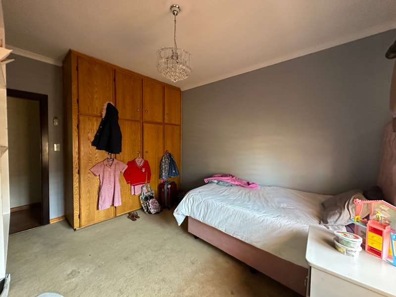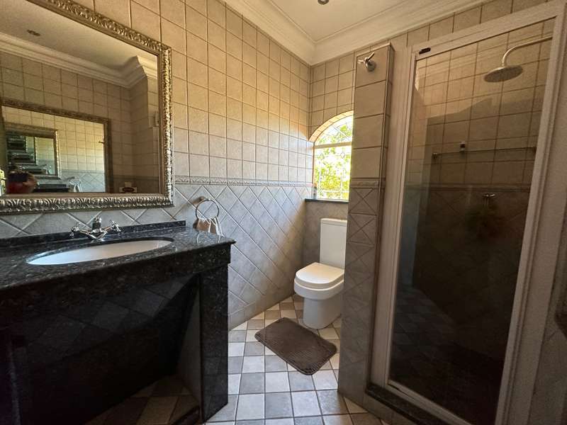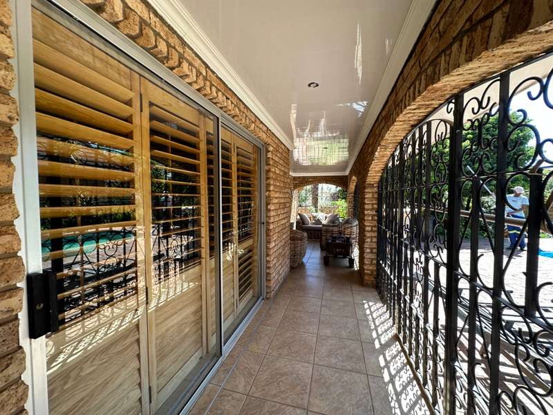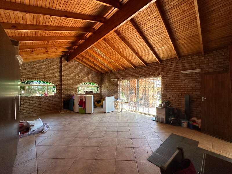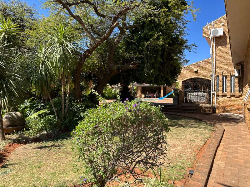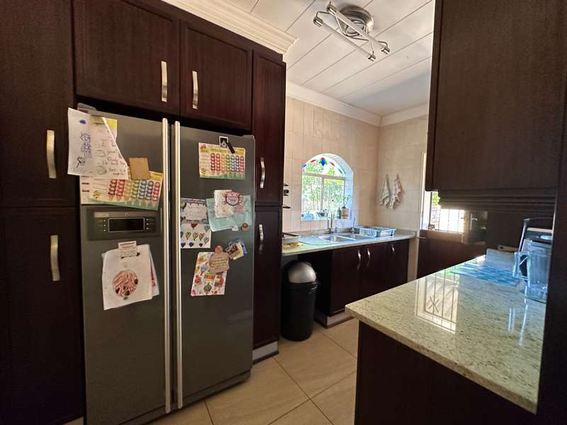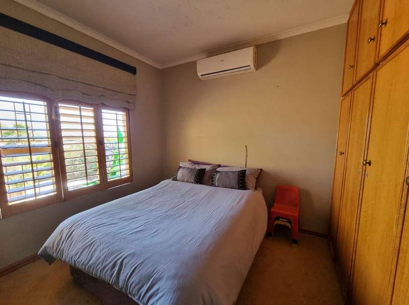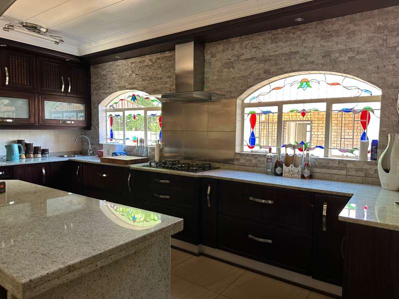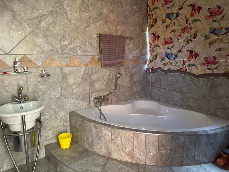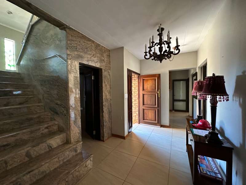 Anything and everything in the right location! Stunning property in one of the most sought-after streets in Klerksdorp. Home itself is a double story, with all living spaces at the ground floor, and the bedrooms and two full bathrooms on the first floor. From the entryway, the home leads you into multiple living areas, to the left is a small study area (with built in desk and cabinetry), right across is the family/entertainment room with sliding doors opening the room onto a well enclosed patio overlooking the pool. To the right of the entryway, the home opens into the formal lounge and kitchen. Kitchen is an absolute dream, dark wooden cabinets with grey granite tops and stained-glass windows. Dining room is on the far side and open floor plan with the main living space. Both these areas open onto the well enclosed patio. Granite staircase leads you up to the four bedrooms, 3 comfortable children’s bedrooms (built in cupboards and air-conditioners) and a main bedroom the size of most one-bedroom flats. Spectacular with the open, centrally placed shower as the definite showpiece. Fireplace and air-conditioner is perfect to set any mood. Entertainment space alongside the swimming pool is the ideal setting for any event. Covered patio at the front with a raised braai and bar area at the back of it. On the side is the indoor entertainment space (could easily be used as a flat), two air conditioners and fireplace and a very spacious bathroom with open air shower. Alongside and attached to the home is four garages, motorized doors, tiled flooring, and ample storage. A doorway via the study area provides easy access. On the other side, across from a courtyard by the kitchen and freestanding from the main home is the laundry, storeroom, and staff quarters. Lockable steel carport is at the side. In the back garden is also a wendy house for additional storage. As added bonus; • 25KVa Generator • Borehole • Underfloor Heating • Pre-paid Electricity Great location, perfectly priced!