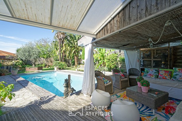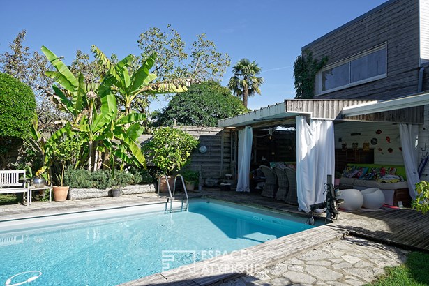 The staircase leads to the main floor with two beautiful, bright bedrooms, an elegant bathroom and a separate toilet, offering comfort and privacy to the whole family. The exterior invites you to relax: a landscaped garden with intimate charm, a beautiful swimming pool and a cozy outdoor lounge create a true haven of peace, fully enclosed and not overlooked.