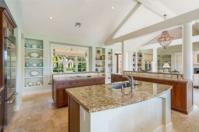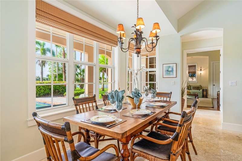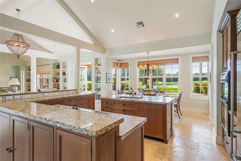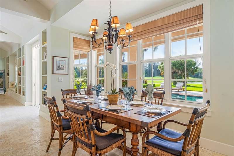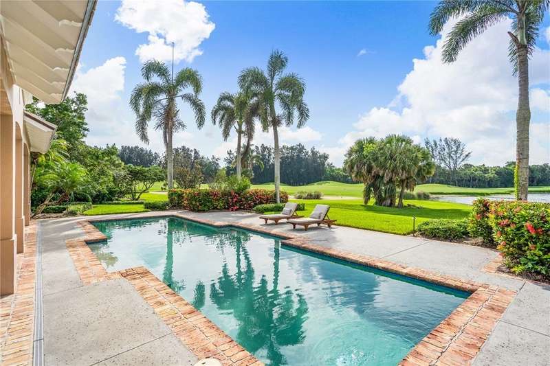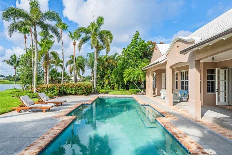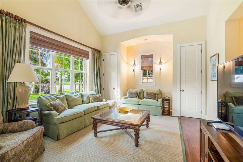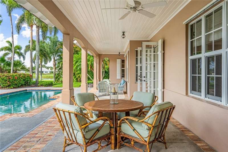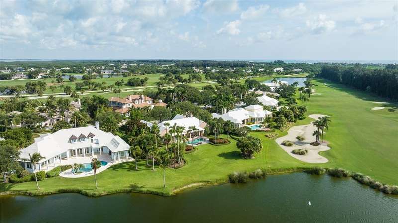Designed by renowned architect Peter Moor, charming one of a kind 3br/3.5ba golf estate. Custom details include dramatic vaulted ceilings, fireplace, stone flooring, expansive primary suite with luxurious bath and dual walk-in closets. Open great room plan with built-ins, grand eat-in island kitchen. Covered lanai overlooks the large lap pool and lush yard, all situated on one of Orchid Island's best estate size lots with beautiful lake and golf course views. Garaging for 3 cars plus golf cart. Room sizes approximate.