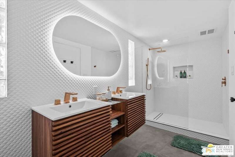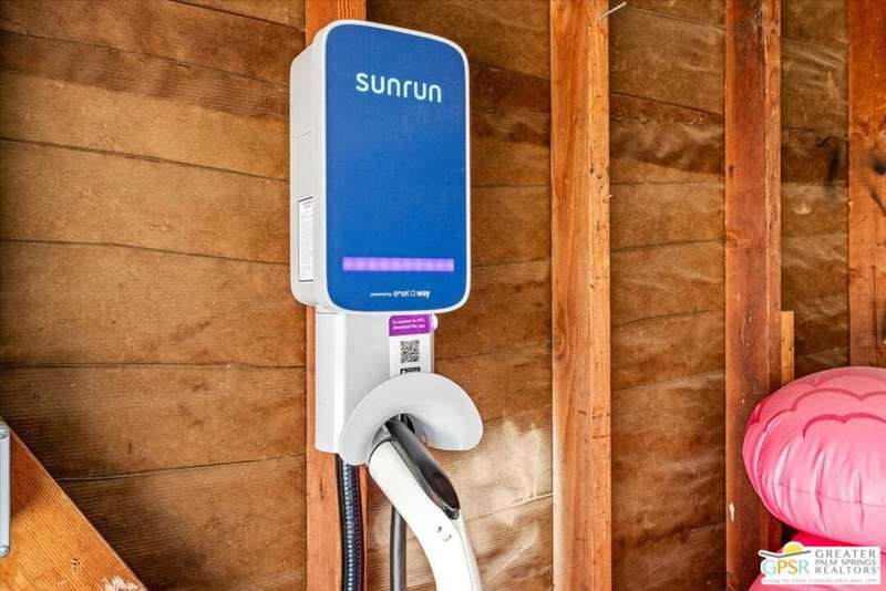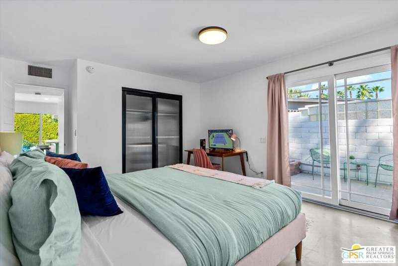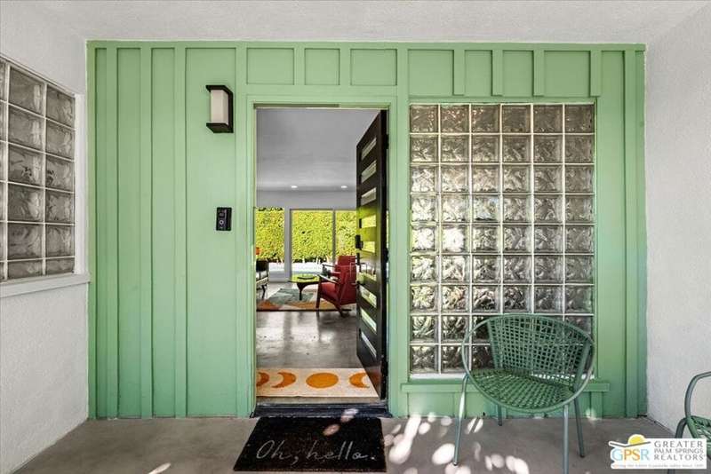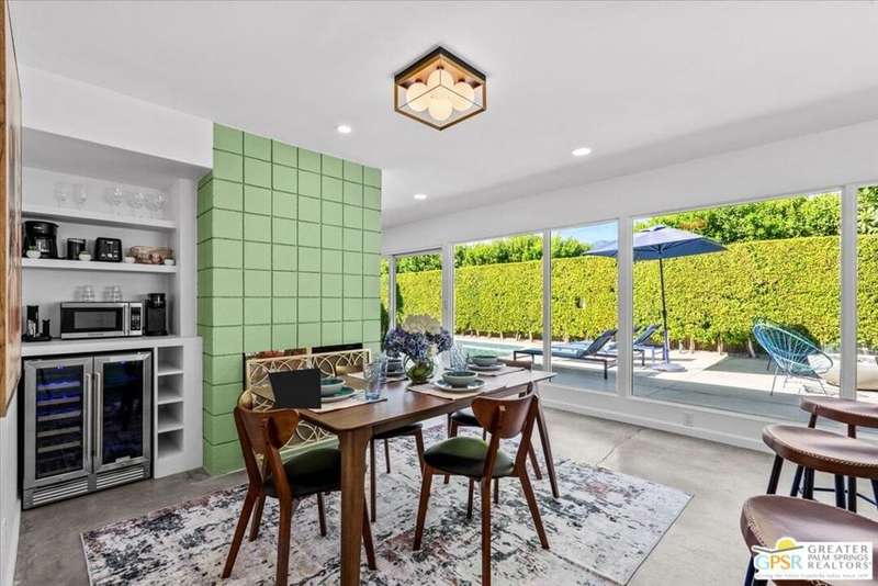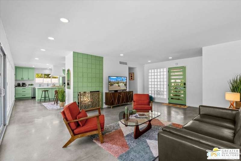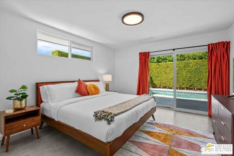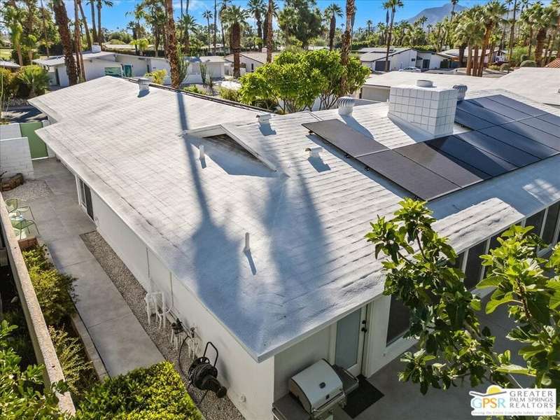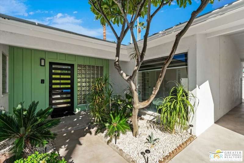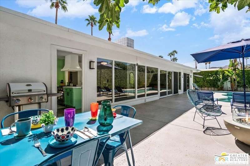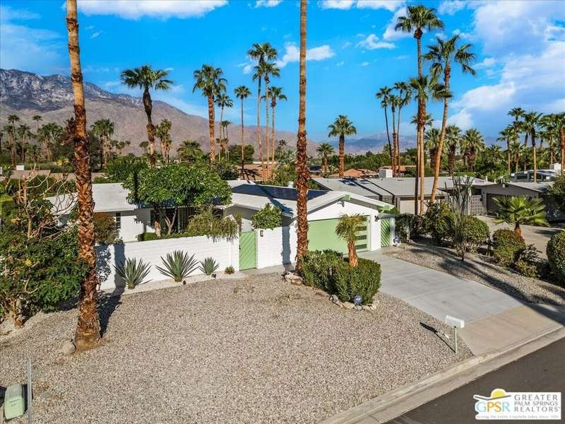 This updated and reimagined Mid-Century modern gem in the highly desirable Tahquitz Creek Golf neighborhood offers fee simple land, bright open interiors, and seamless indoor-outdoor living. Offered turnkey furnished, this home is move-in ready for full-time living, a weekend getaway, or income potential. Step inside to a warm living room with a double-sided fireplace and wall-to-wall glass framing the sparkling pool and lush backyard. Multiple patios, fruit and plumeria trees, a fire pit with mountain views, create the ultimate private retreat. Primary ensuite wing with oversized walk-in closet and rear patio access separated from guest bedrooms and bath on opposite side of the home. The updated kitchen features quartz counters, stainless appliances, and a dual gas/electric convection oven perfect for entertaining from intimate dinners to poolside cocktails. Recent upgrades include new bathrooms, new interior and exterior paint, dry bar with beverage center, a new foam roof, polished concrete floors, modern lighting, 22 solar panels with transferable contract, and an EV charger. This South Palm Springs home is convenient to golf, dining, shopping and everything that makes the desert a paradise for homeowners.