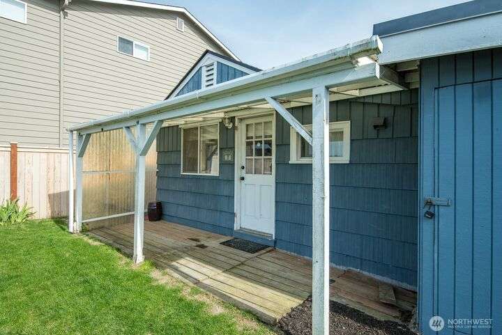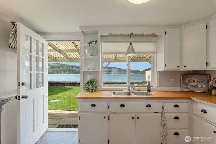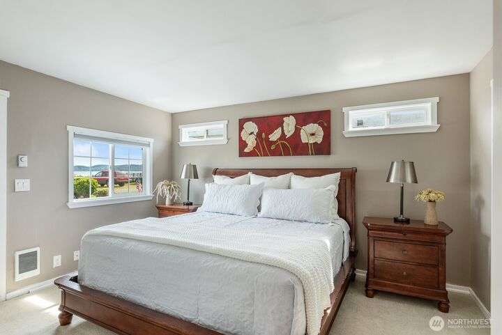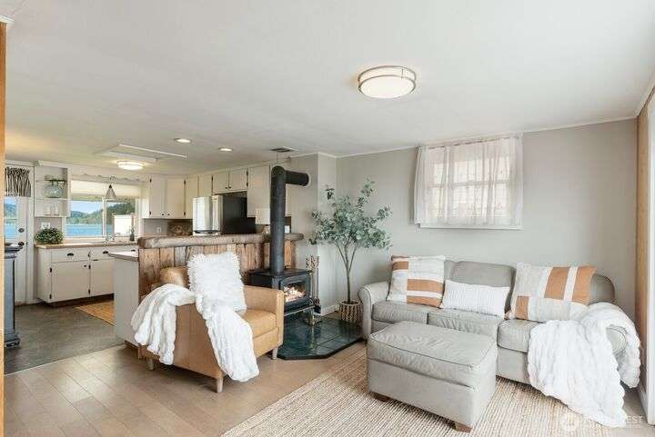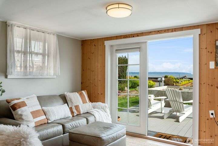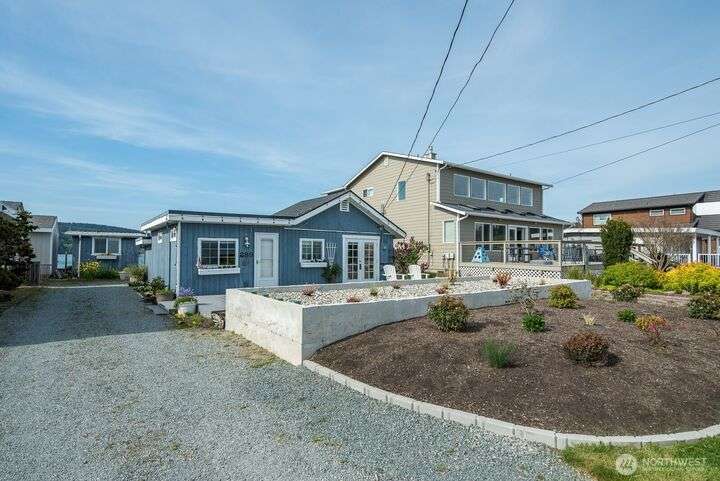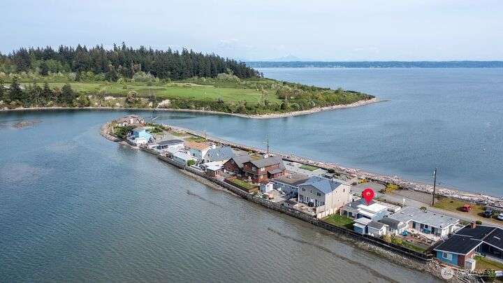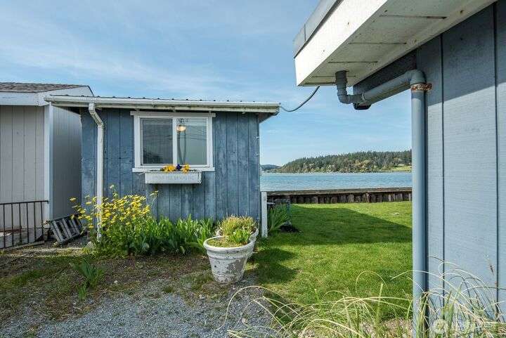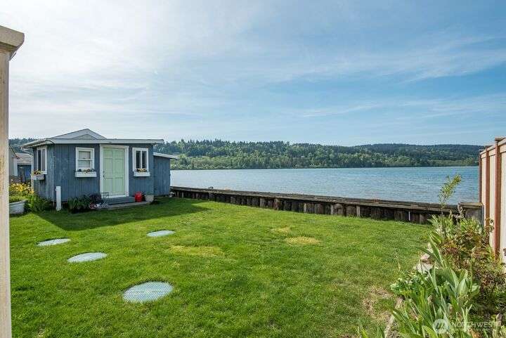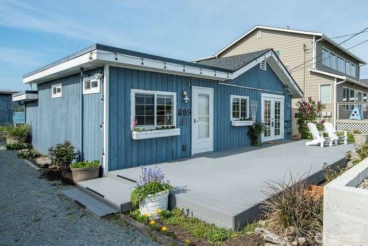 There is still time this Summer to enjoy this cabin w/rare 50' of level waterfront w/all day sun & water on both sides! Enjoy breathtaking views of Port Susan, Barnum Point, & Mt. Rainier from this magical spot! Special features: 1 bdrm w/large WI closet, ¾ bath, cozy wood-stove, guest bungalow, & French doors out to composite deck. Outdoor living shines w/space on both sides, garden area, firepit, & ample parking. Fantastic beach for treasure hunting and strolling along. This cabin lives larger than it's square footage! Perfect for a weekend escape, vacation rental, or full-time residence. New 2 bedroom septic system recently installed. Experience crabbing, fishing, bird life & waterfront living in a sought-after Island community!